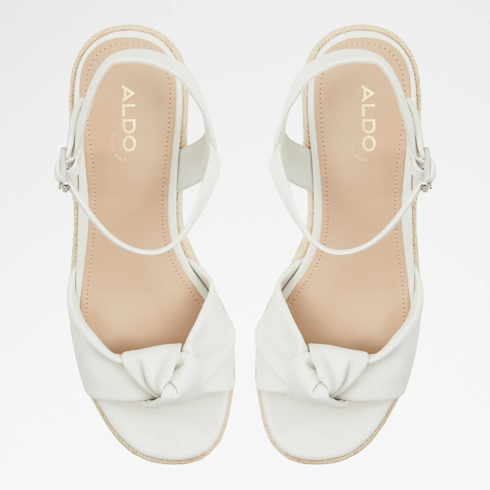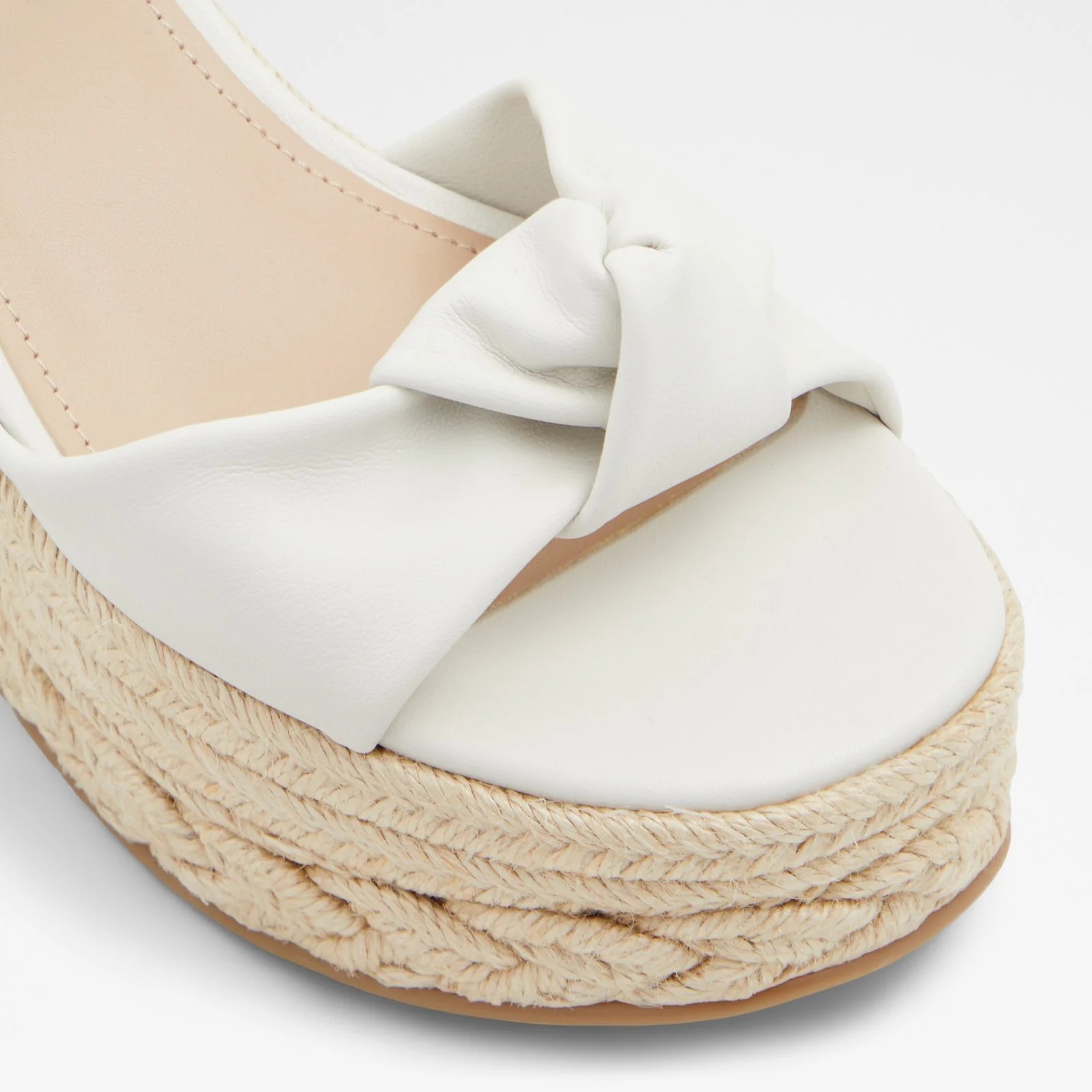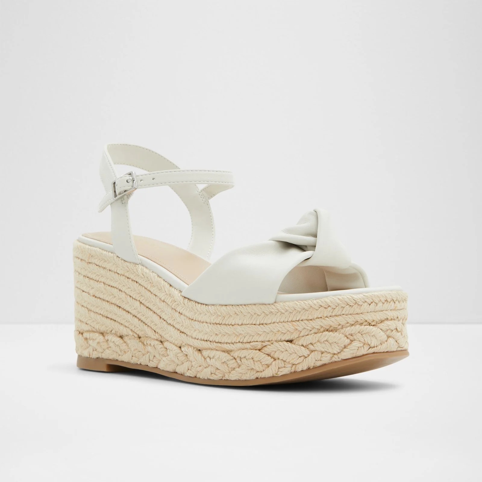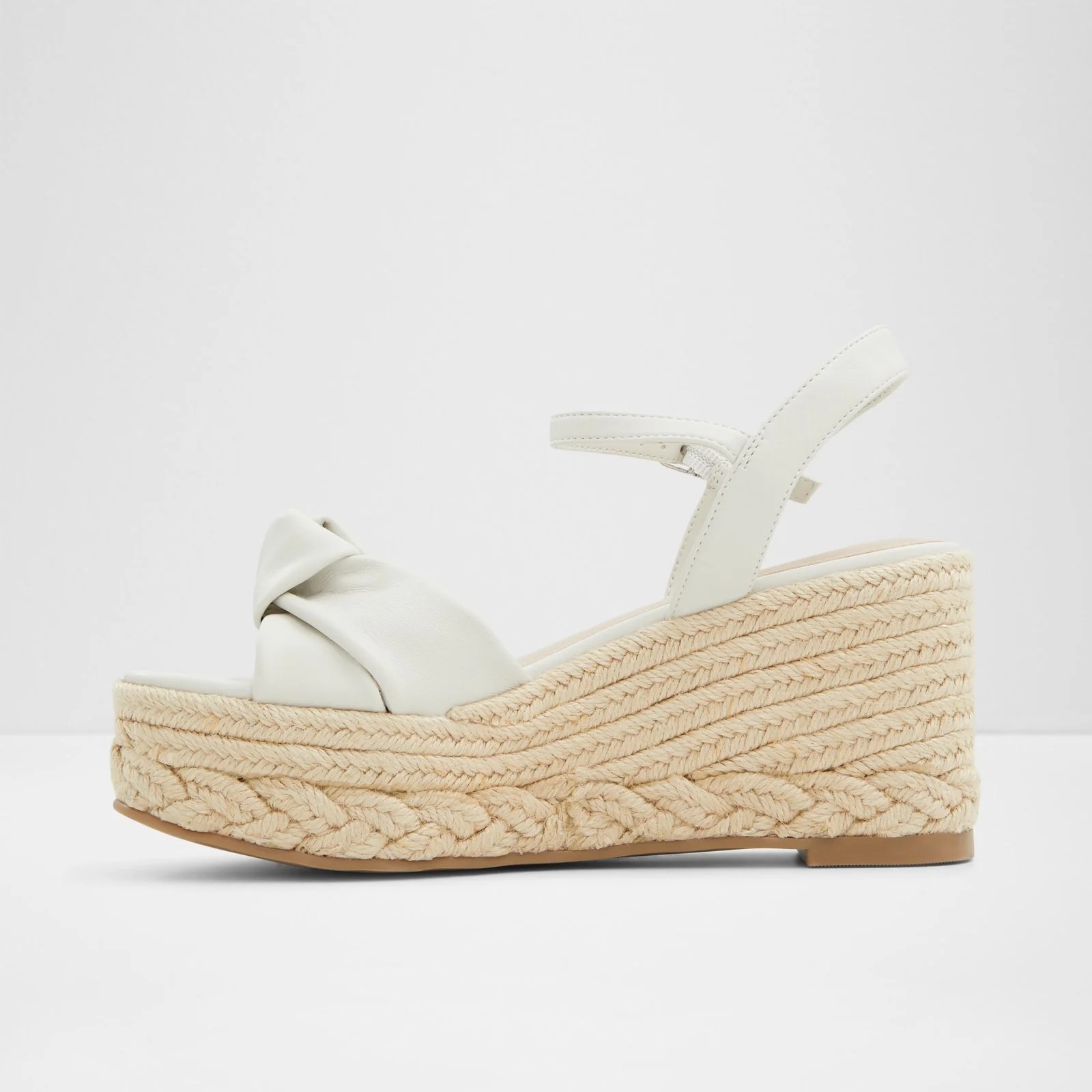 صندل أبيض بكعب منصة/وتد أنيق يوازن بين الارتفاع والثبات لإطلالة صيفية راقية.