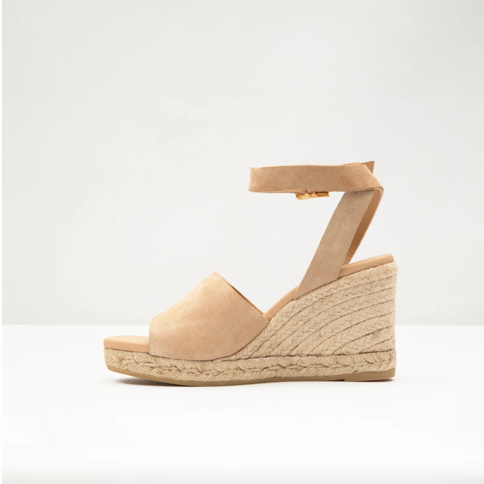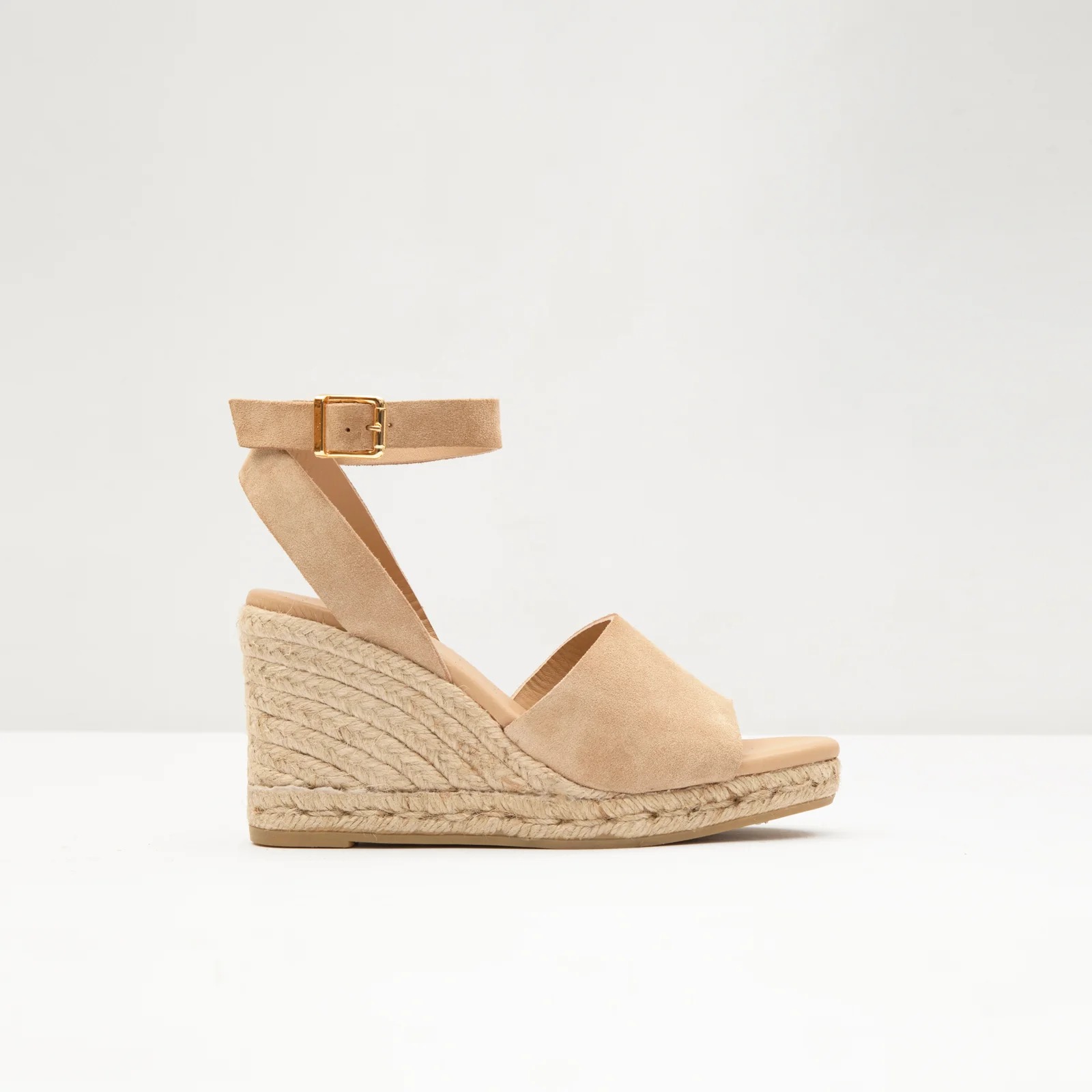 صندل إسبرادريل بكعب وتد بلون البيج يوازن بين الأناقة والثبات، مع مقدّمة مستديرة ورباط يلتف حول الكاحل لمظهر أنثوي صيفي.