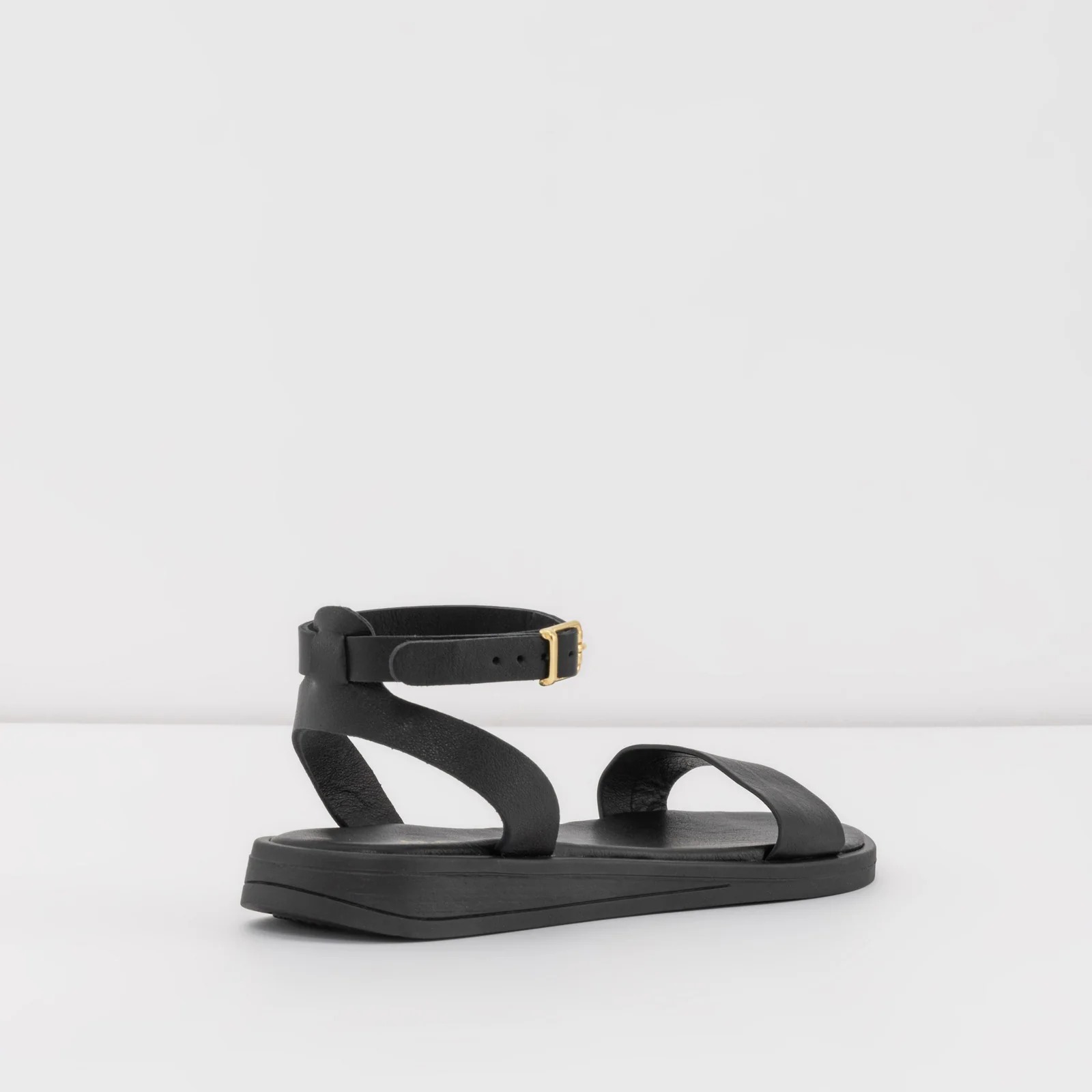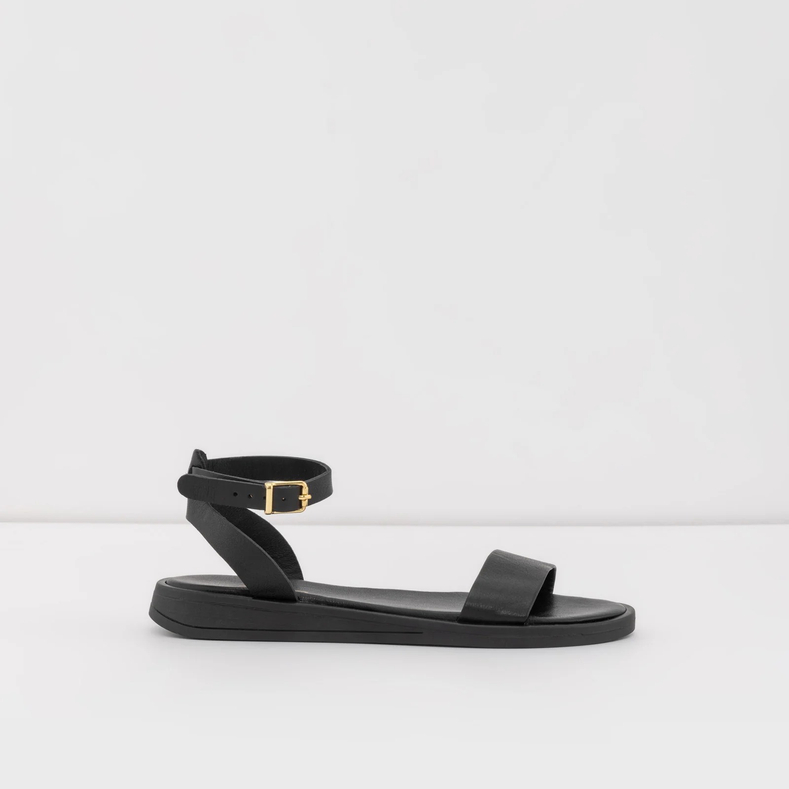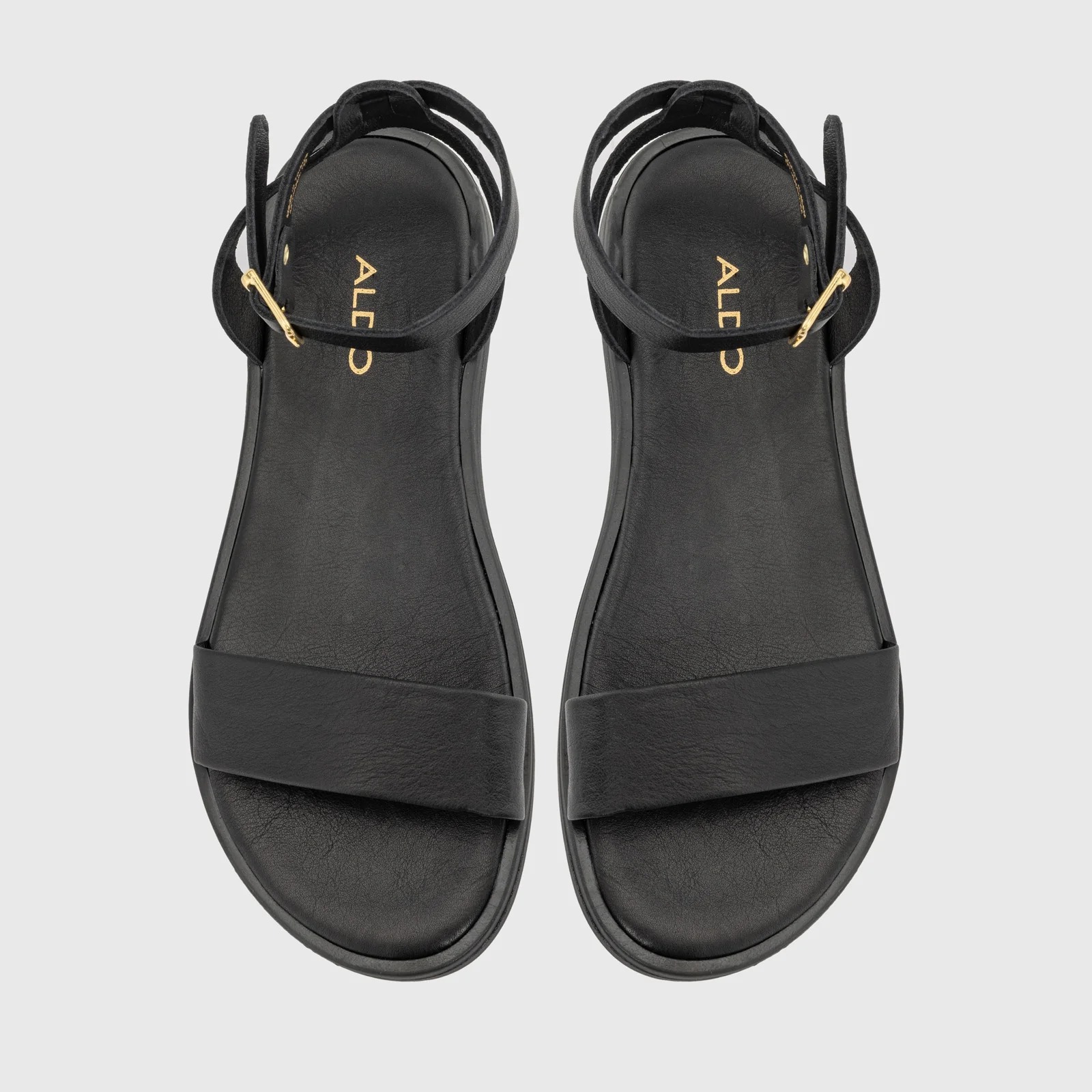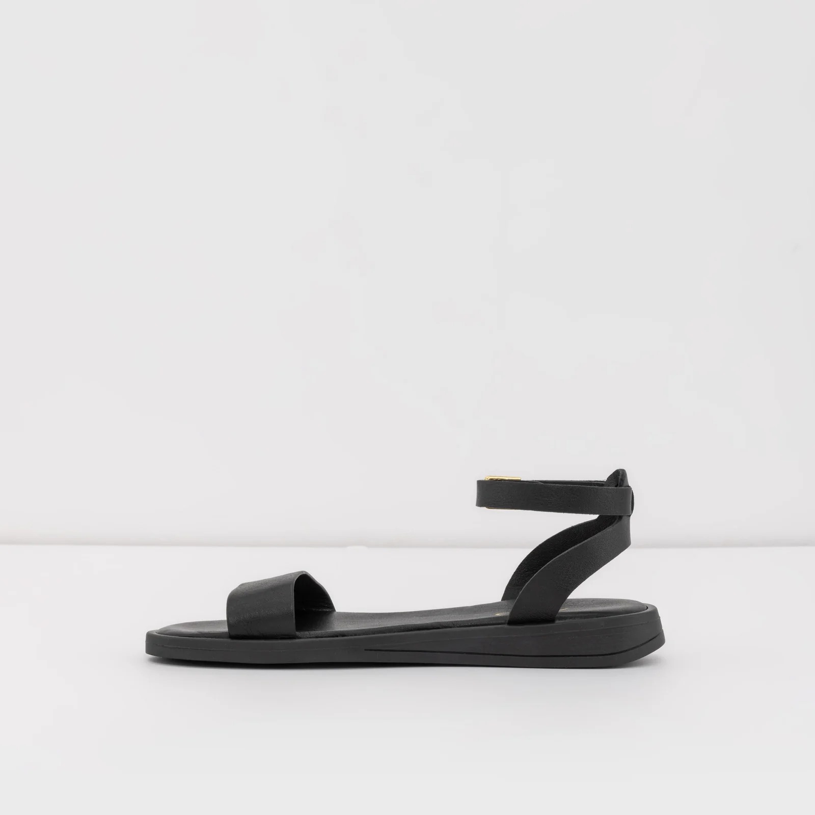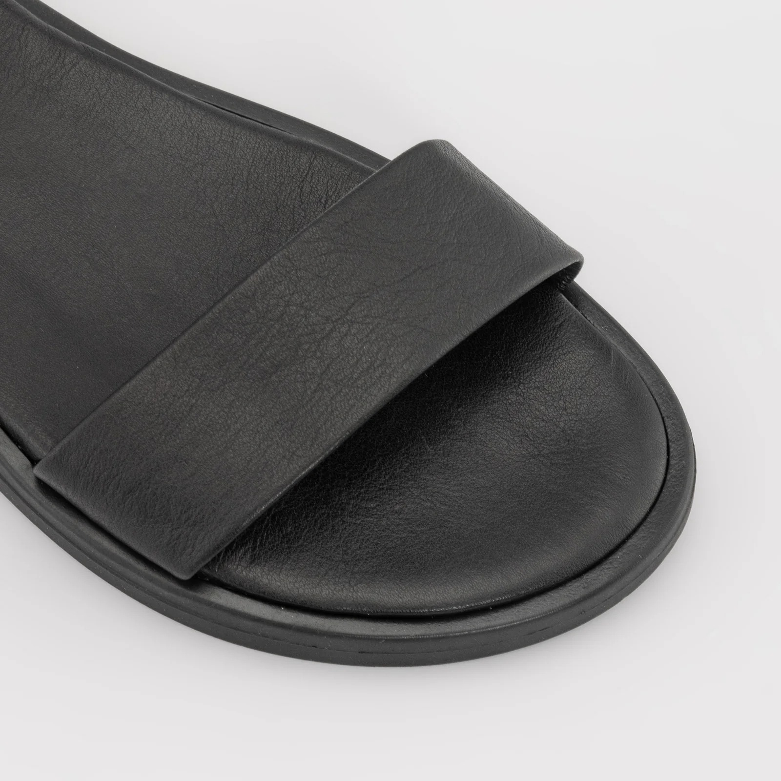 صندل مسطّح أسود كلاسيكي بحزام حول الكاحل يمنحك راحة وأناقة يومية.