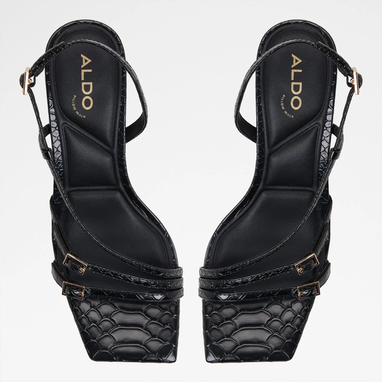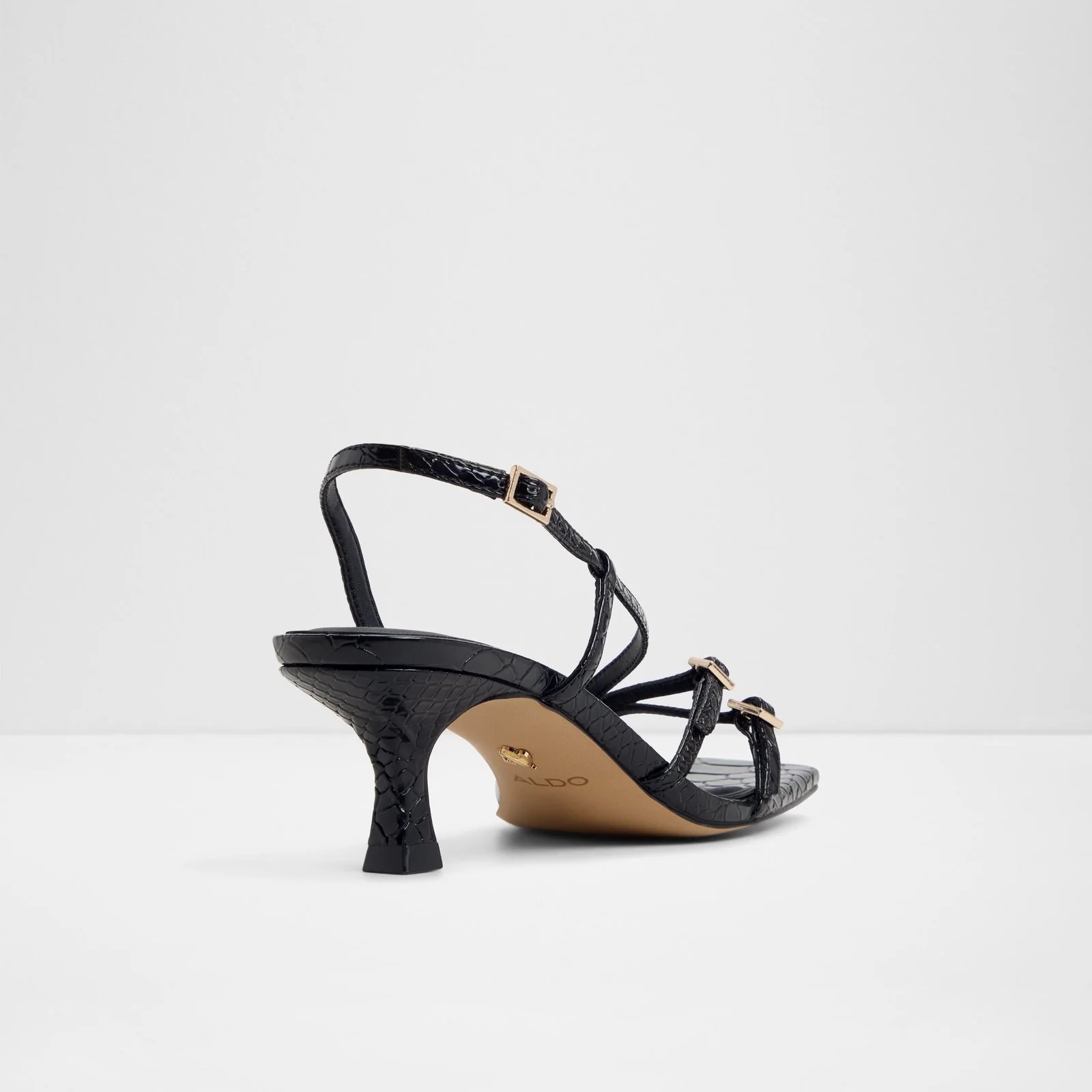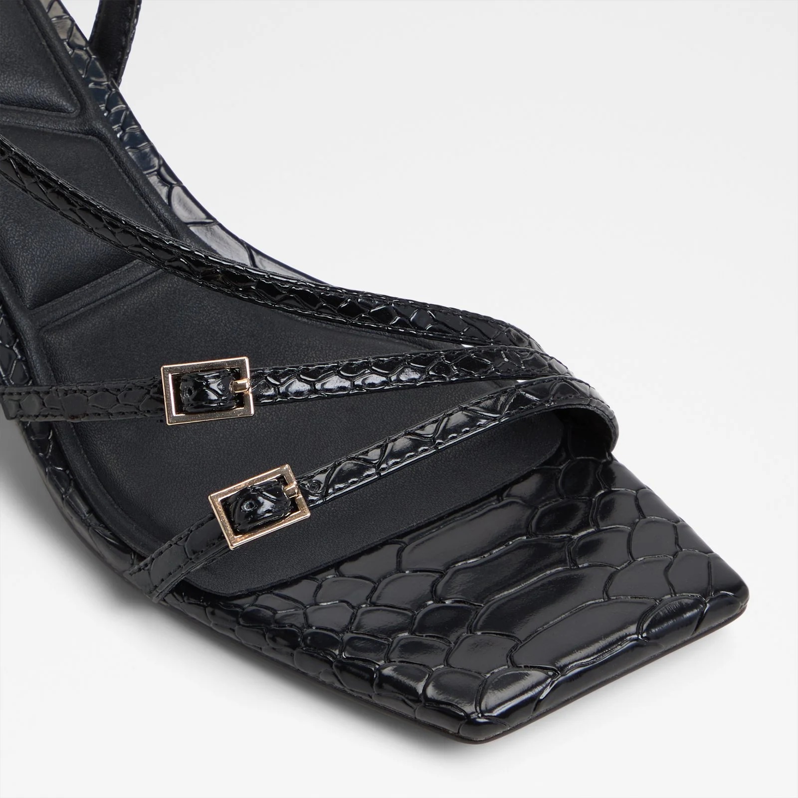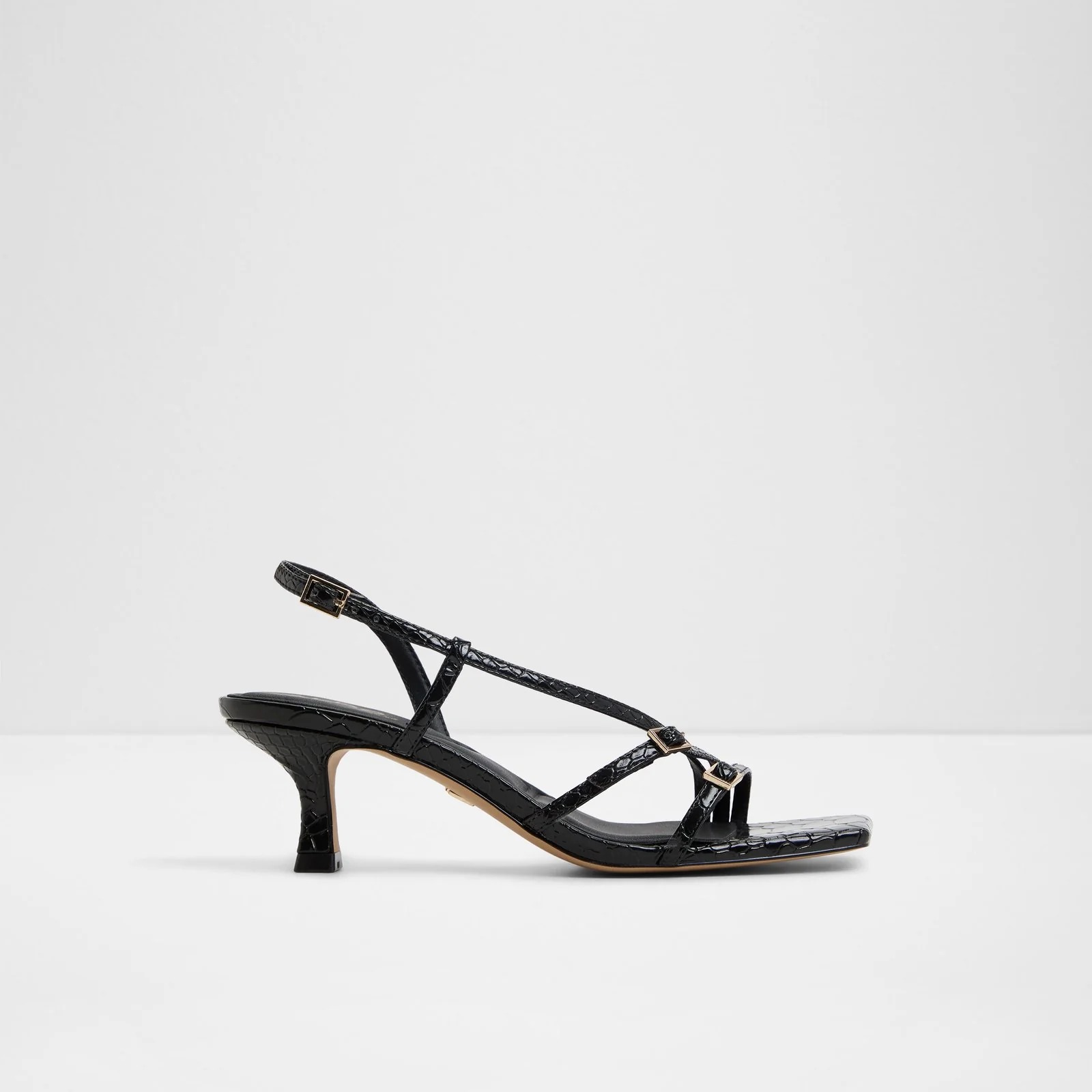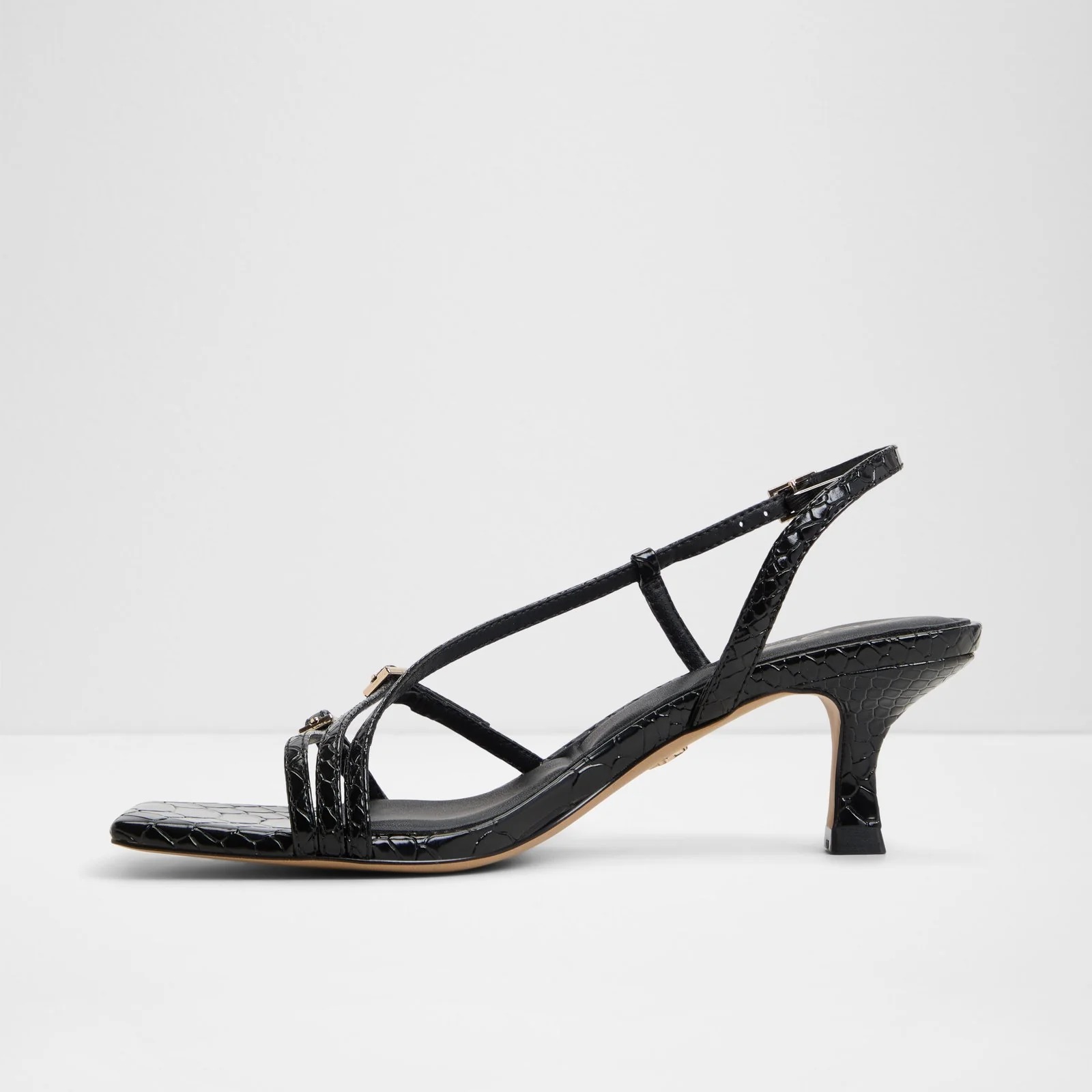 صندل أسود بكعب رفيع ومقدّمة مربعة يوازن بين الرقي والراحة في الإطلالات المسائية.