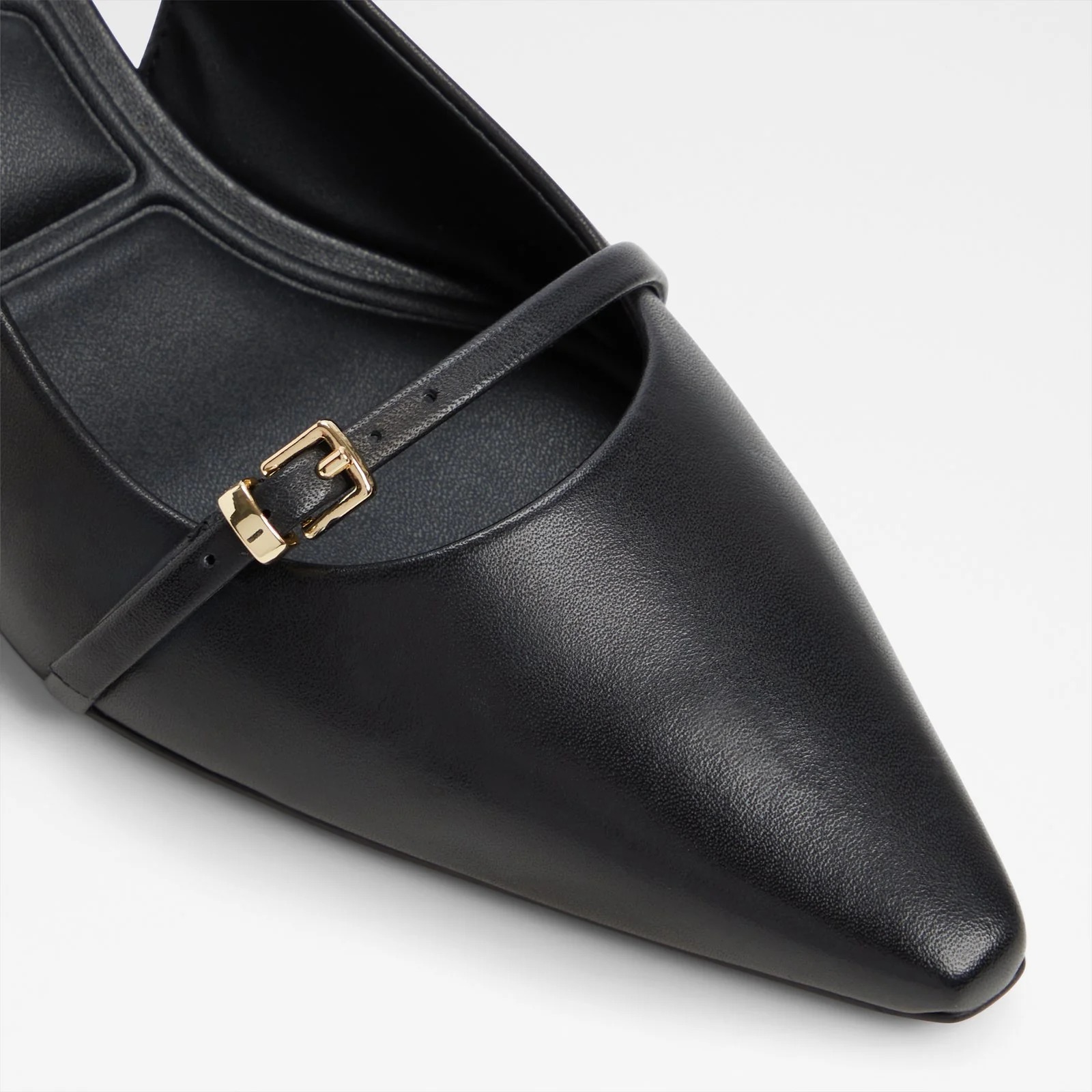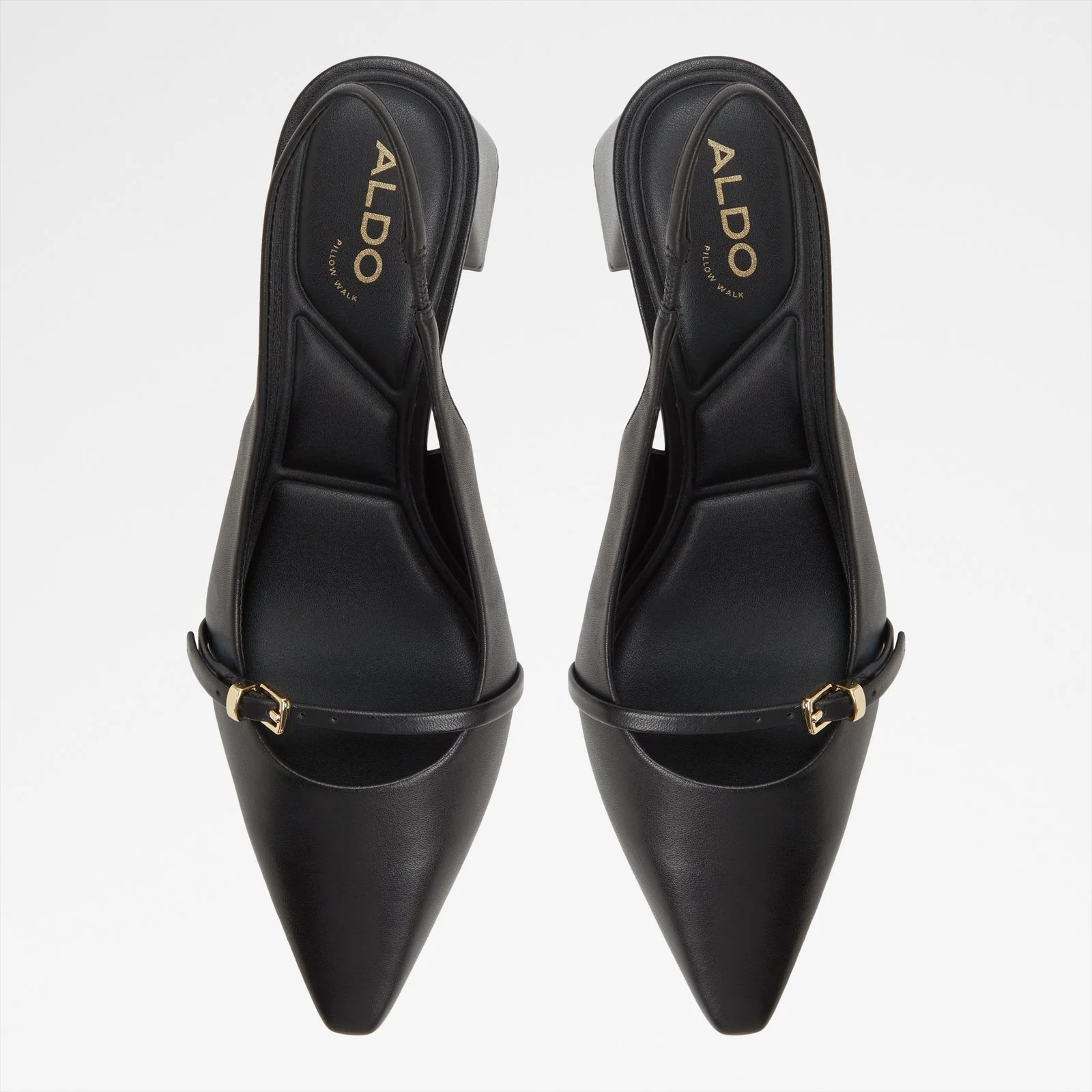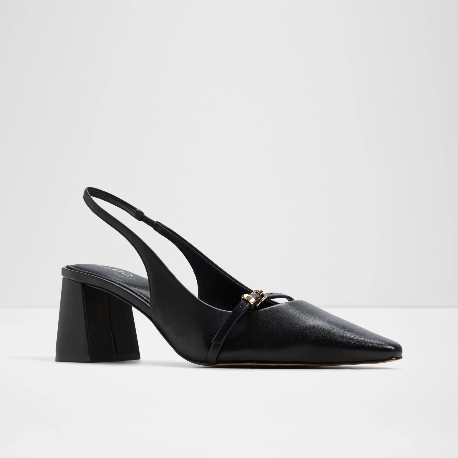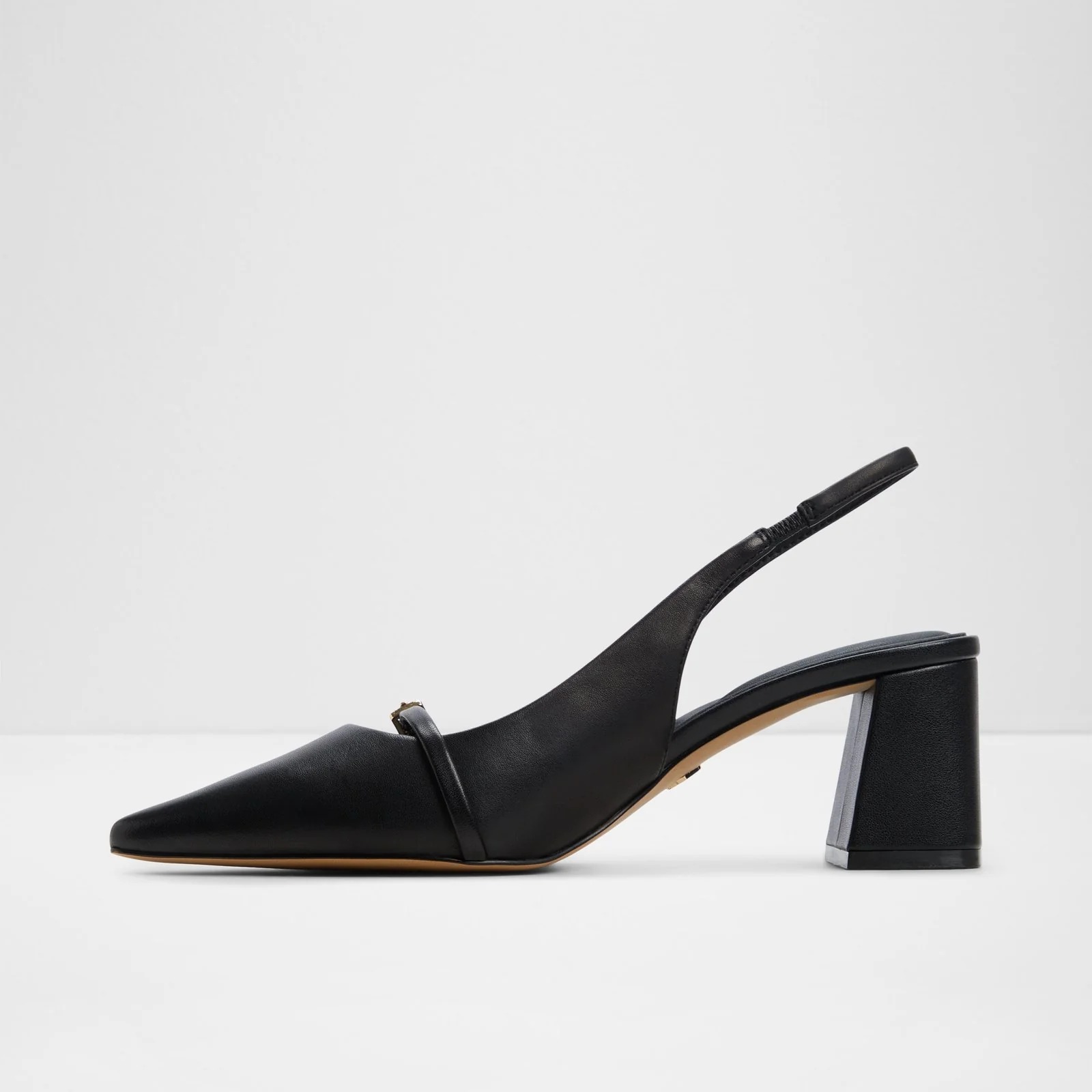 حذاء Slingback أسود بكعب بلوك متوسط يمنح توازن الأناقة والثبات مع مقدّمة مغلقة أنيقة.