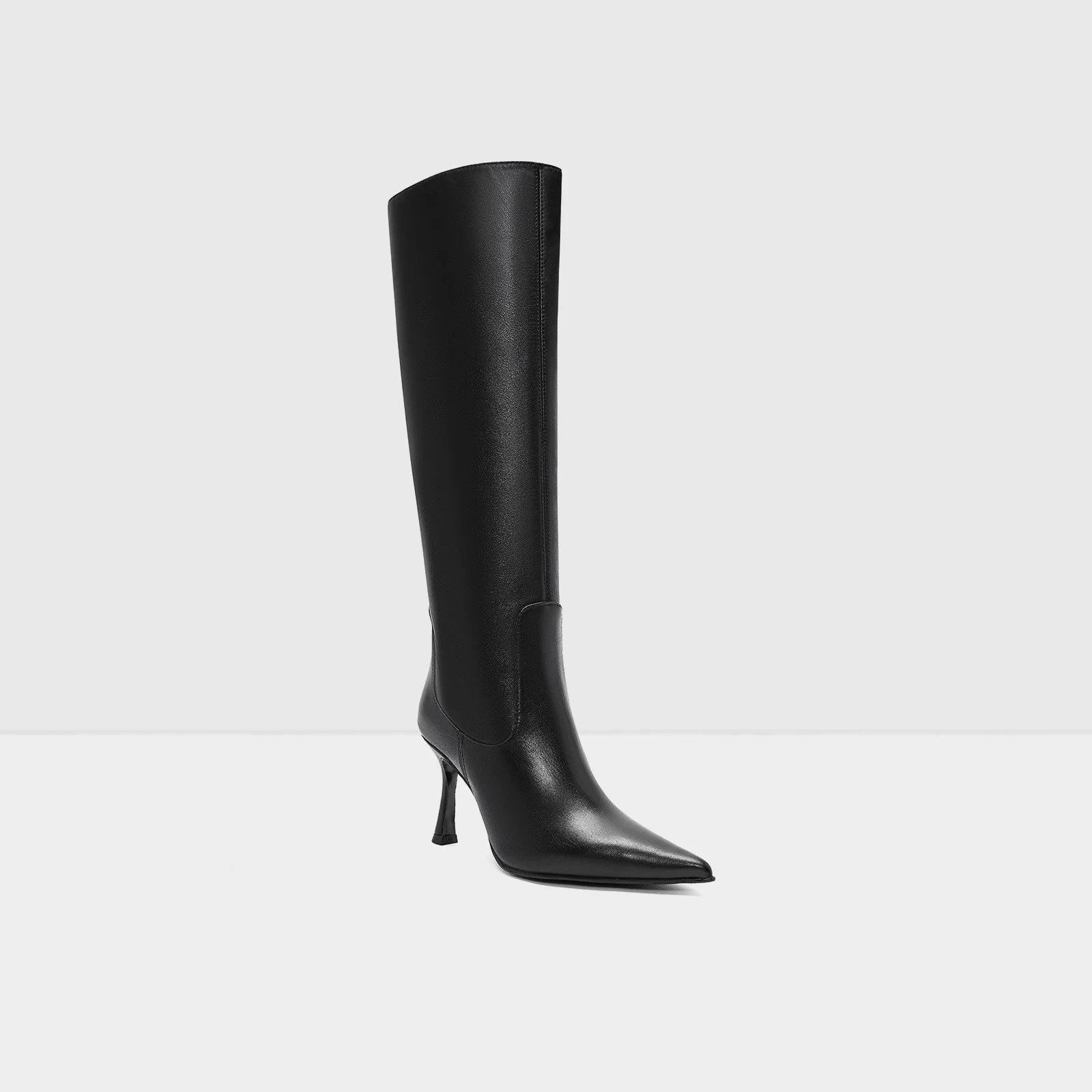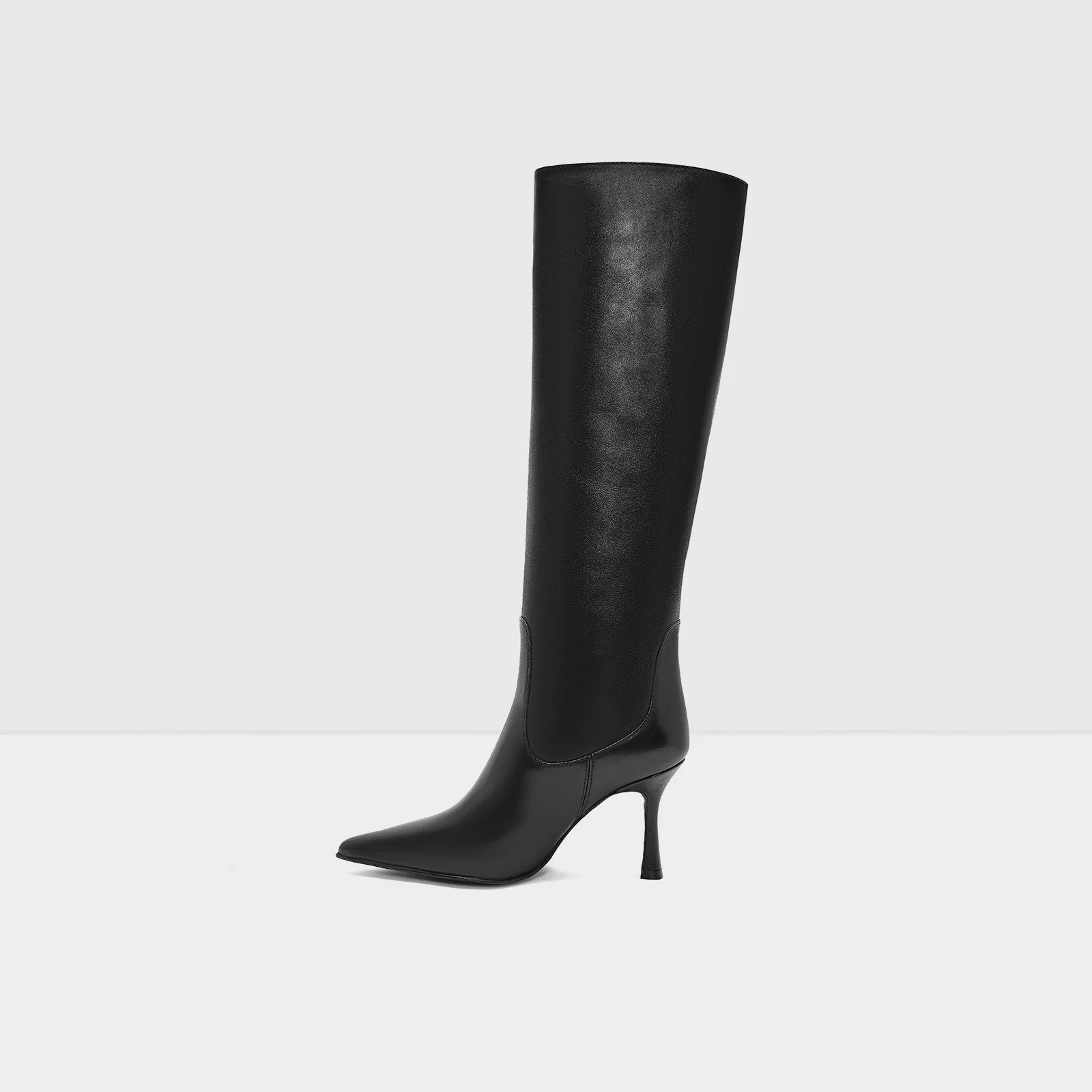 القصة: بوت طويل يصل إلى الركبة (ارتفاع الساق ~42 سم، محيط الساق ~41 سم) – كعب ستيلتو بارتفاع حوالي 8.5 سم – تصميم أنيق رفيع يبرز الإطلالة