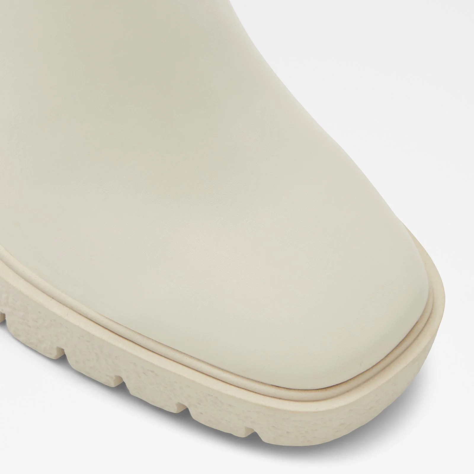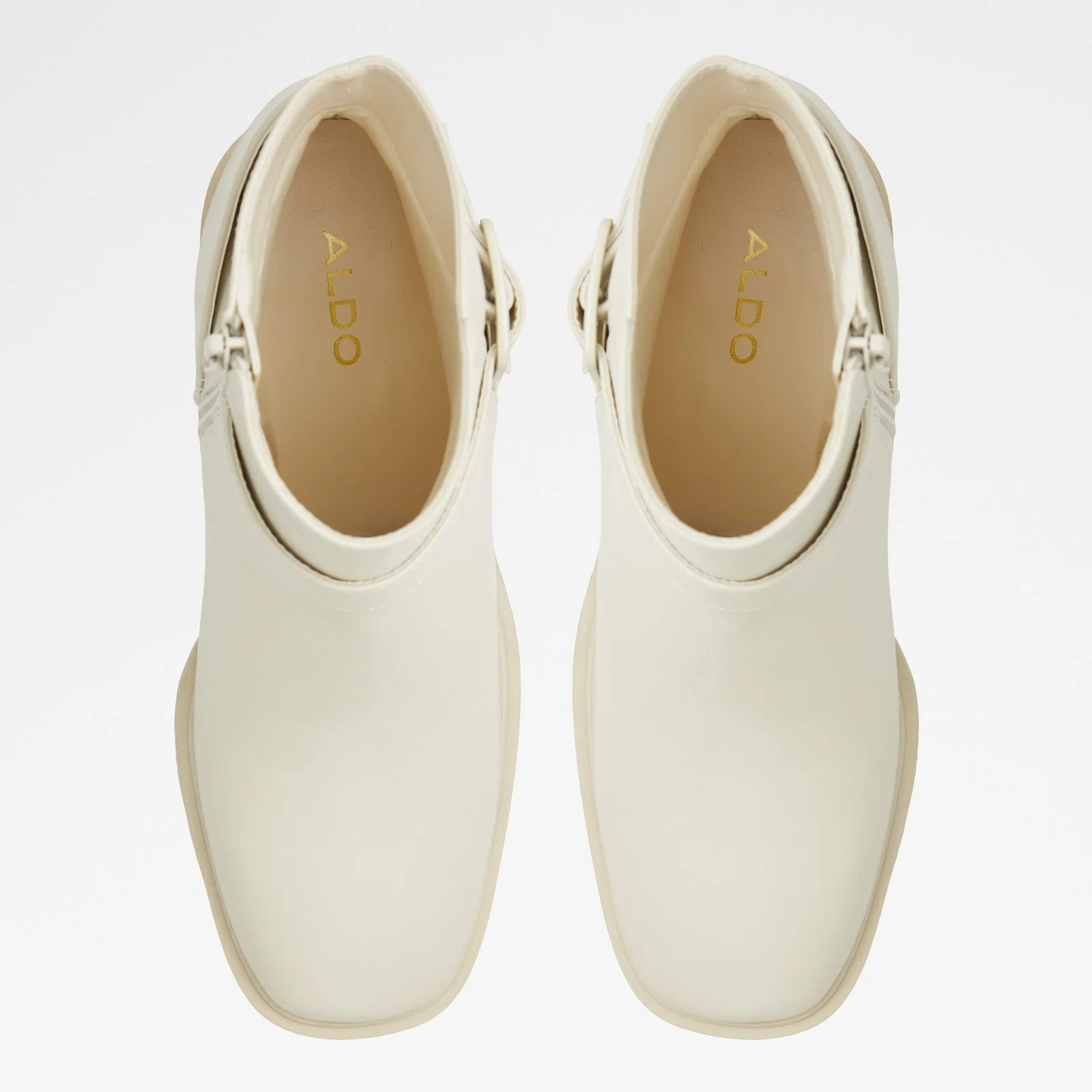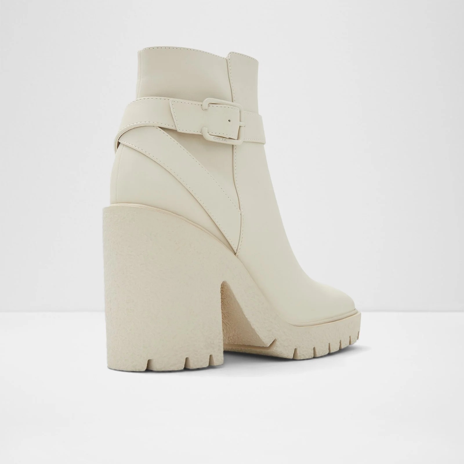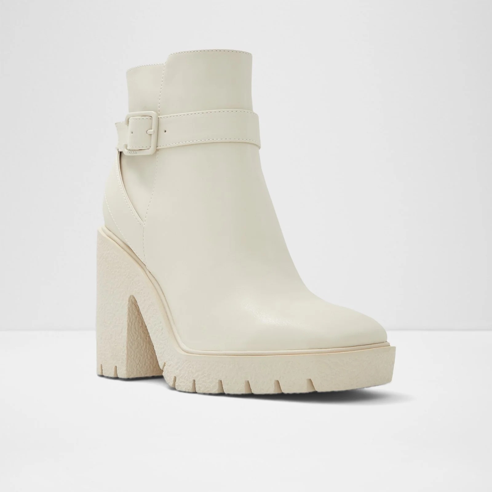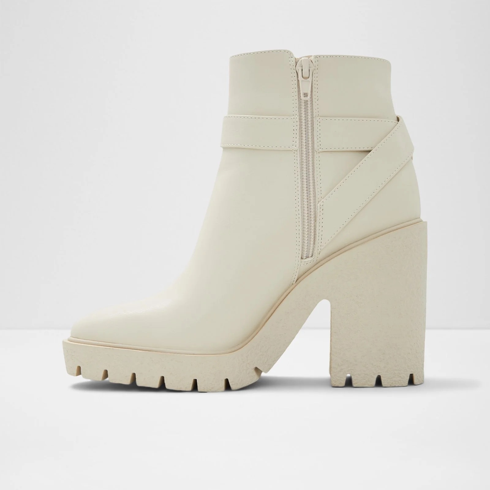 القصة: بوت يصل إلى الكاحل – كعب بلوك عالٍ بارتفاع ≈10 سم – إغلاق بسحّاب جانبي – لون إكرو أنيق يتماشى مع الإطلالات العصرية