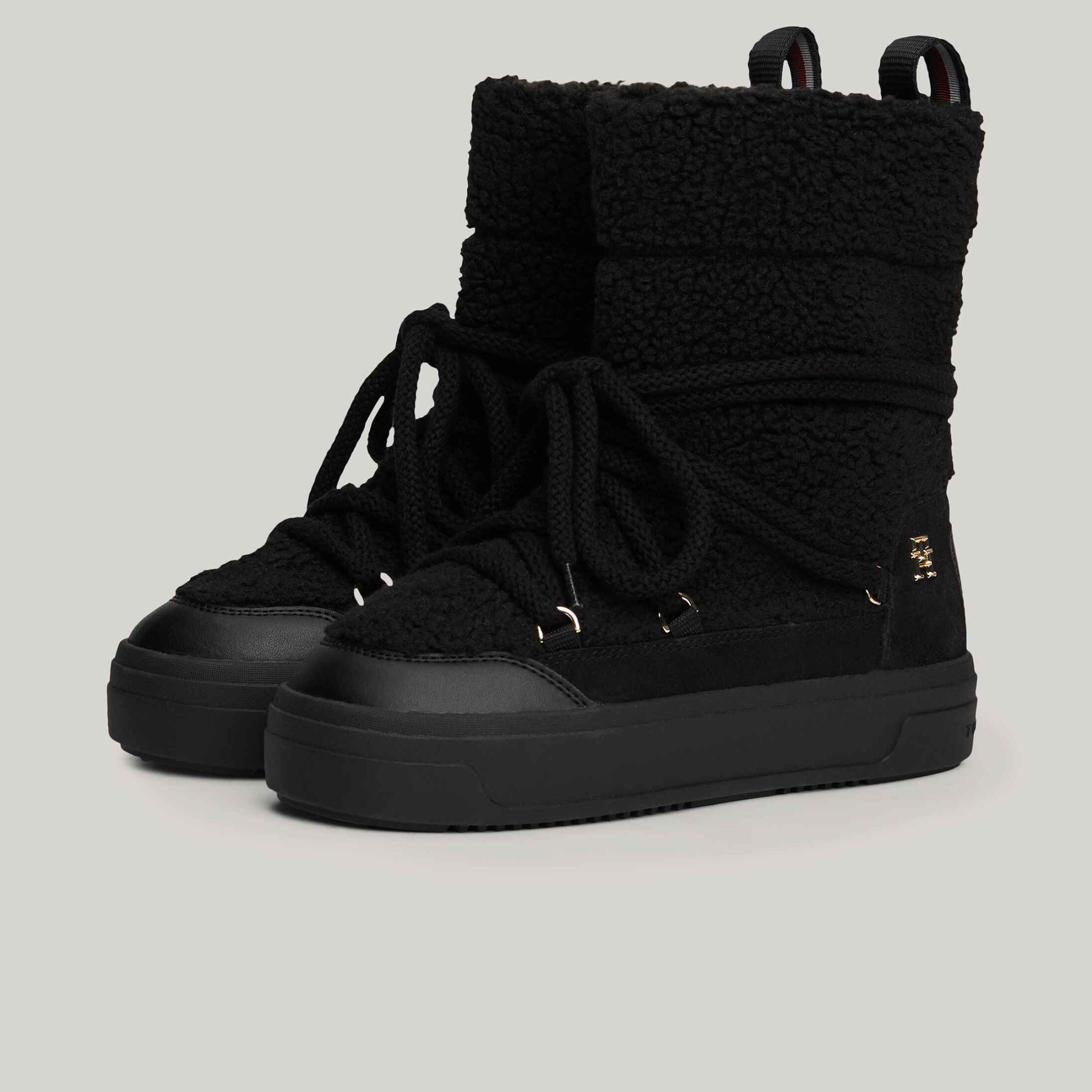 Tommy Hilfiger Lace-Up Faux Shearling – بوت نسائي أسود ببطانة فرو صناعي وتصميم عصري مقاوم للبرد