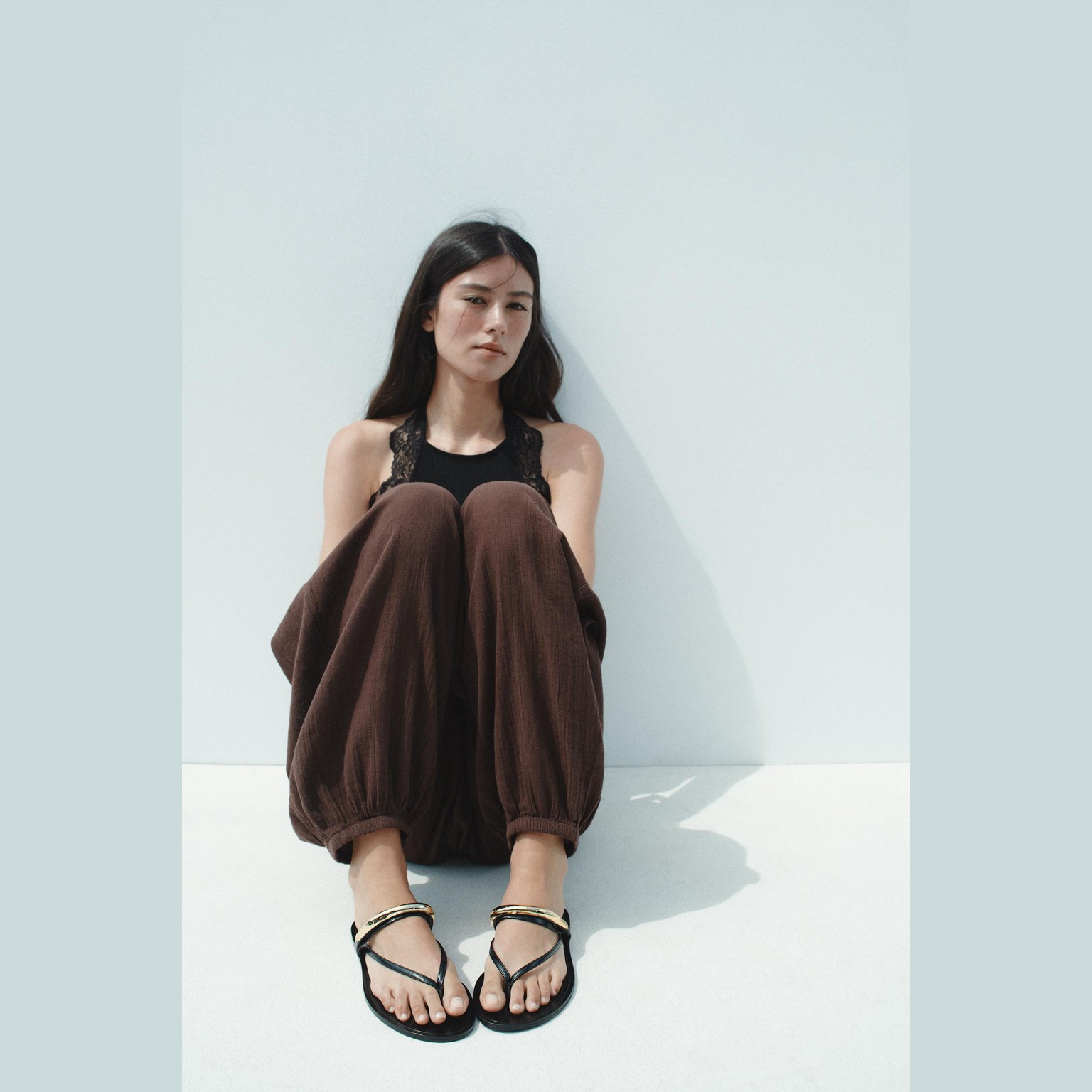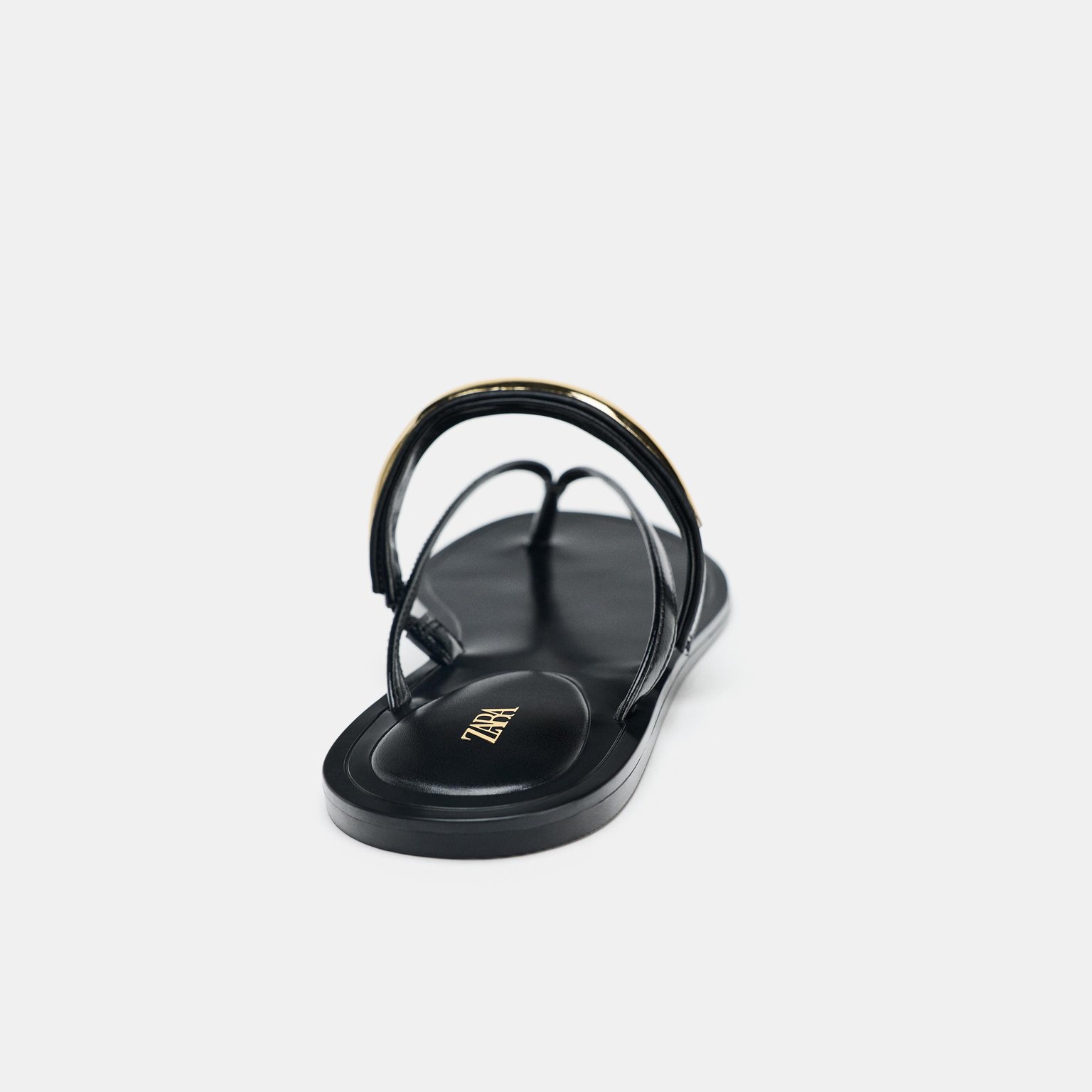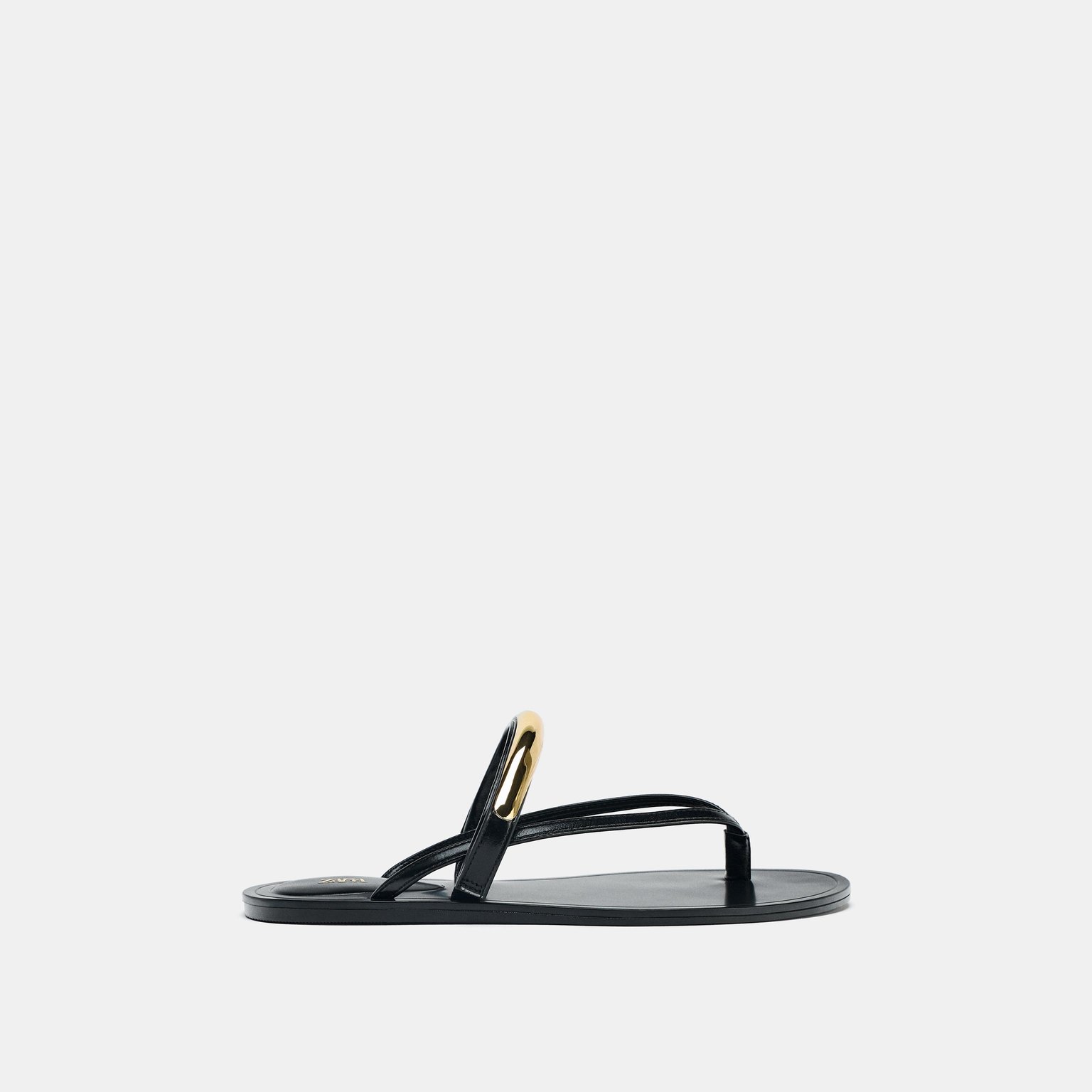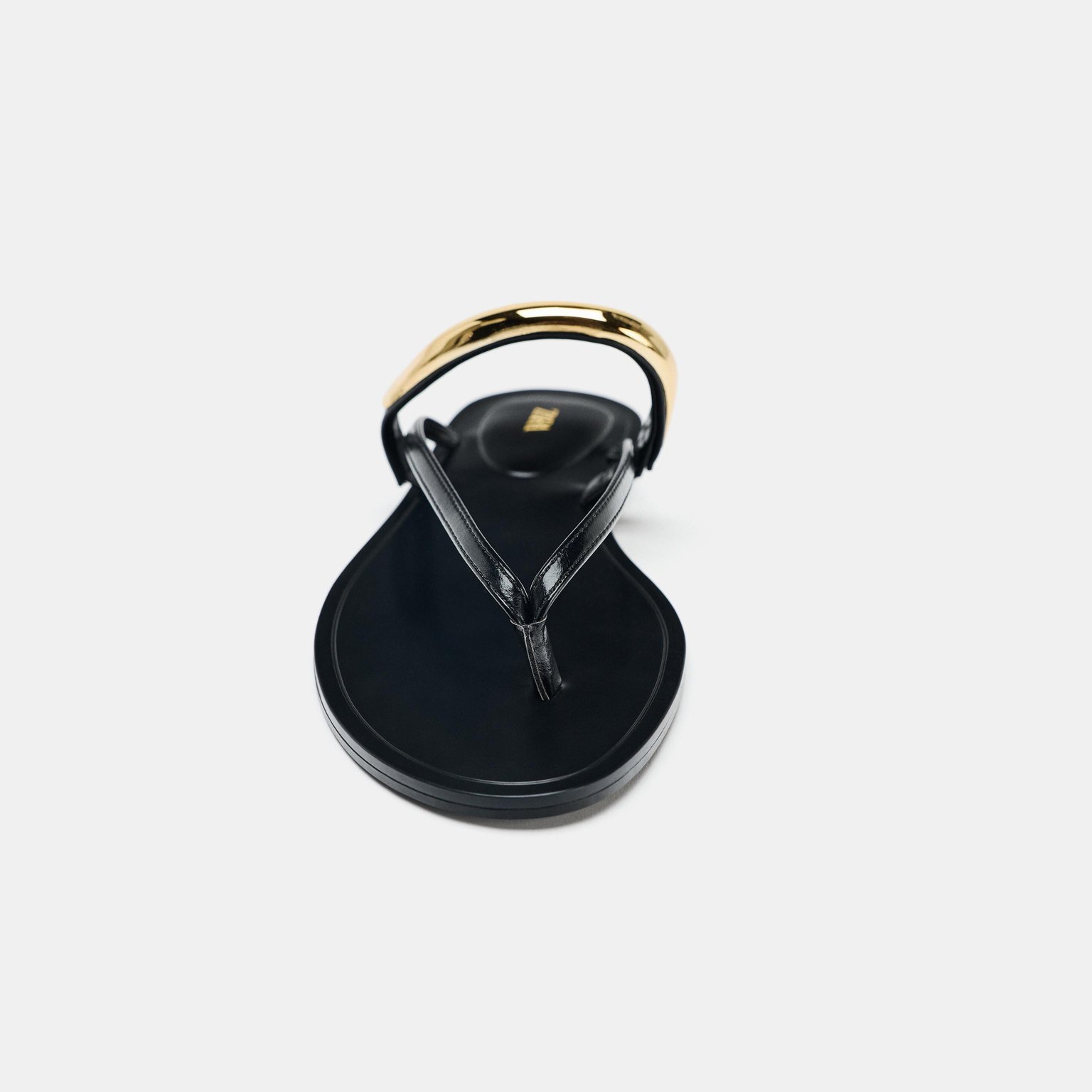 صندل مسطّح مع قطعة معدنية – لون طبيعي (أسود) – Black (Sandals with Metal Appliqué) صندل مسطّح أنيق بتصميم بسيط مع قطعة معدنية على السطح العلوي تضيف لمسة راقية. يتميز بمقدمة مستديرة وسير أمامي مع فاصل إصبع، ونعل منخفض مريح مناسب للاستخدام اليومي والإطلالات الصيفية.