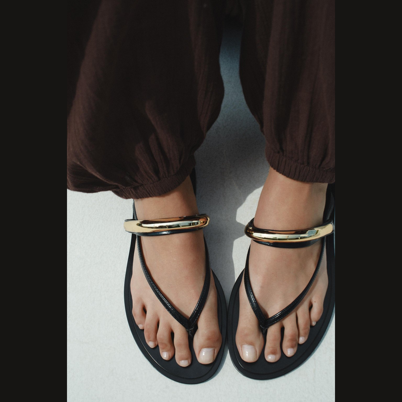 - التصميم: صندل مسطّح مع قطعة معدنية
