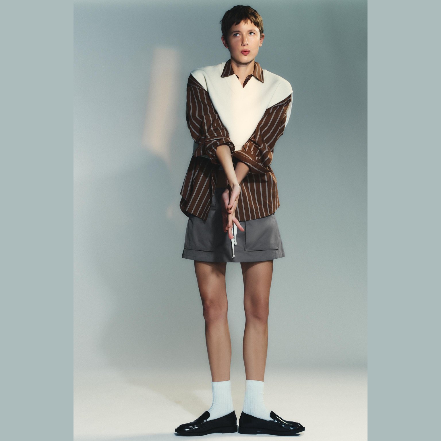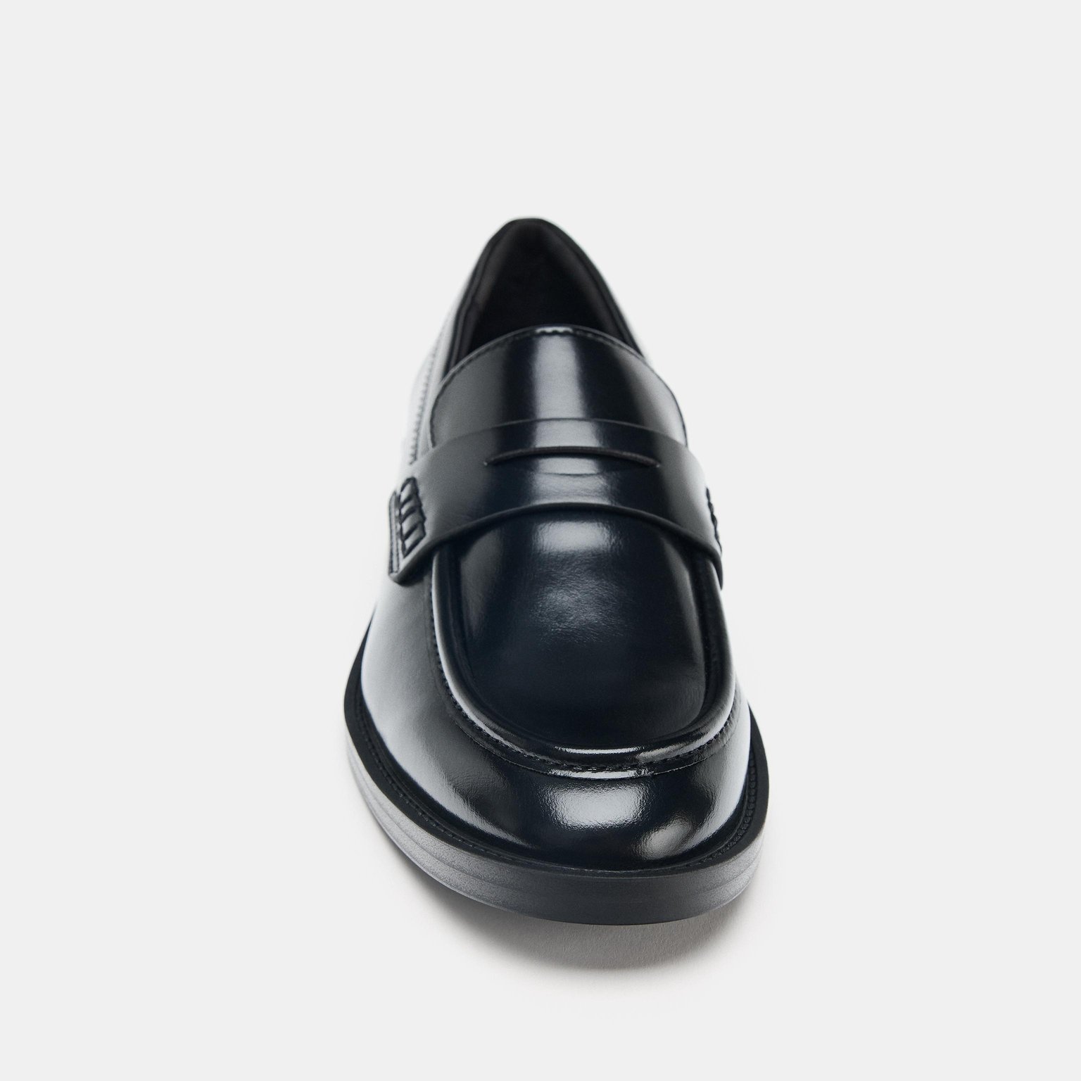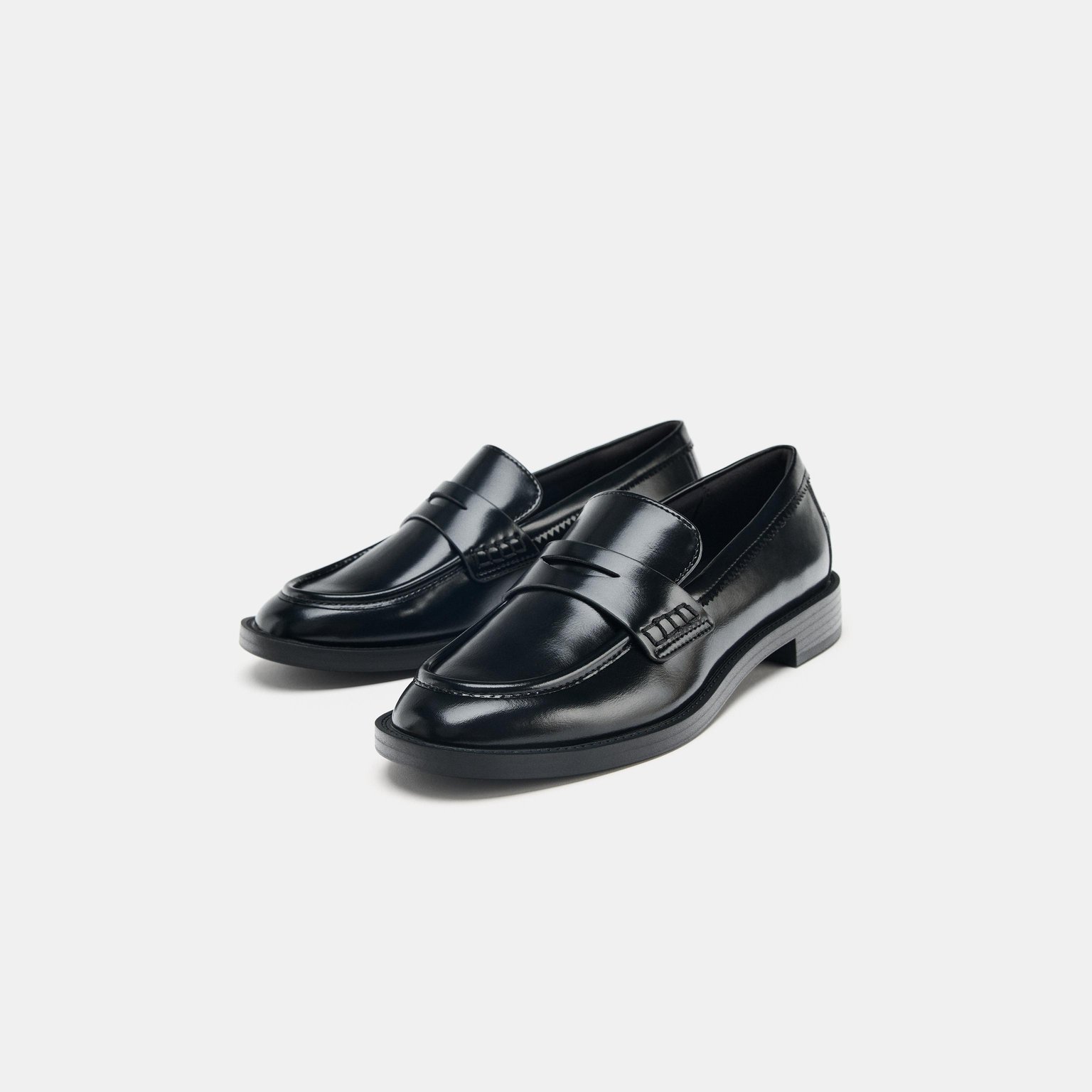 حذاء لوفر مسطّح – لون طبيعي (أسود) – Black (Loafer Shoes) حذاء لوفر مسطّح بتصميم كلاسيكي أنيق، يتميز بسير أمامي عريض ولمسة عصرية في الجزء العلوي. يأتي بمقدمة مستديرة ونعل منخفض مريح، مما يجعله مناسبًا للإطلالات اليومية العملية والكاجوال.