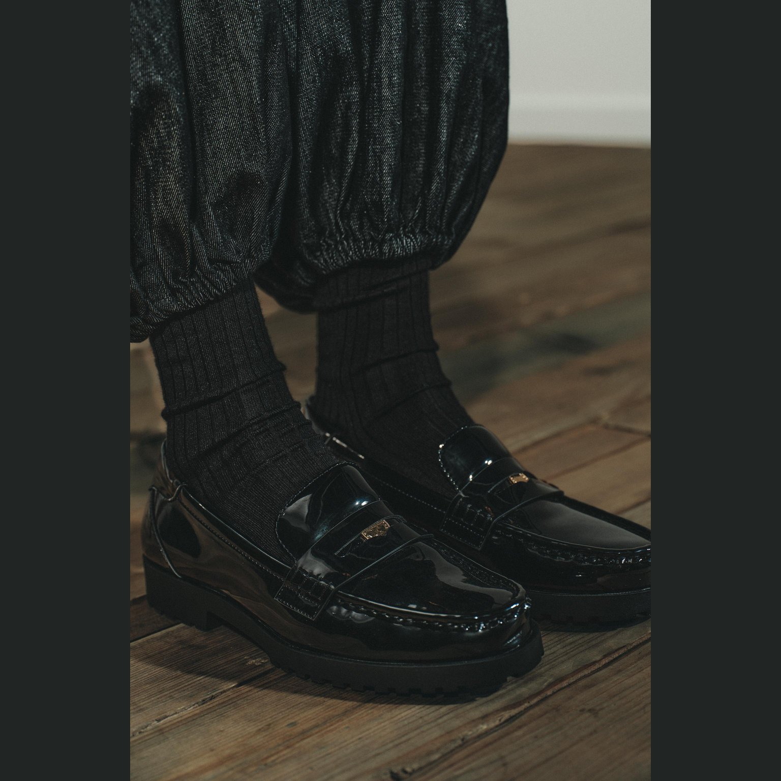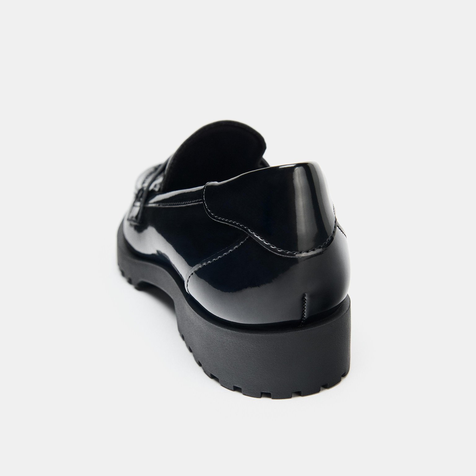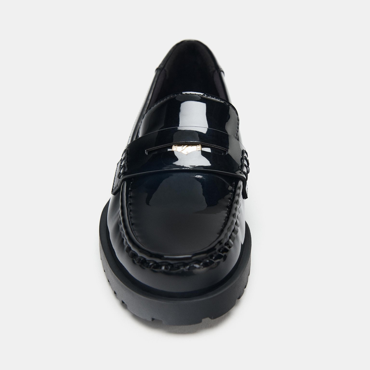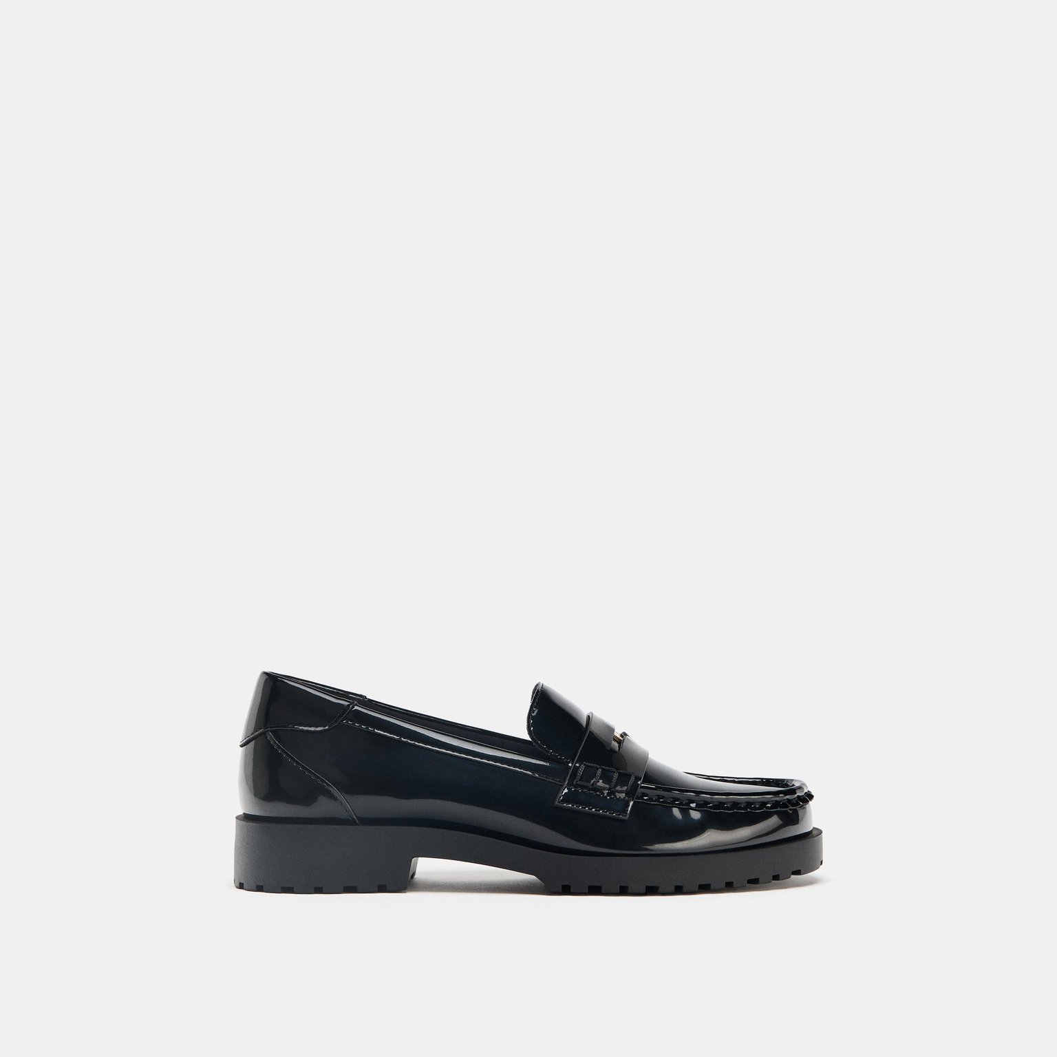 حذاء لوفر مسطّح بتصميم البيني – لون أسود – Black (Penny Loafers) لوفر كلاسيكي بتصميم البيني الأيقوني، يتميز بواجهة مرتفعة وسير أمامي تقليدي يمنح لمسة فاخرة. يأتي بنعل مسطّح بأسنان خفيفة لثبات أفضل ومقدمة مستديرة مريحة، مما يجعله خيارًا مثاليًا للإطلالات اليومية العملية والكاجوال.
