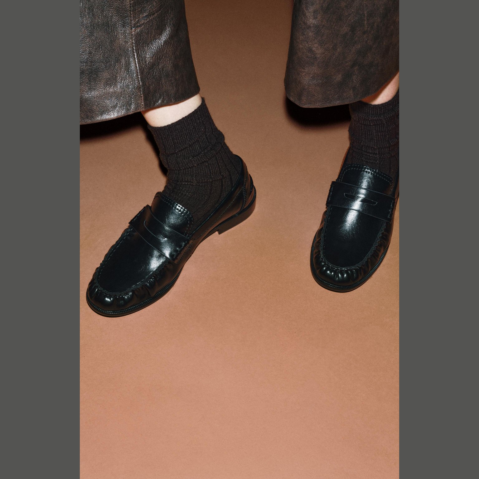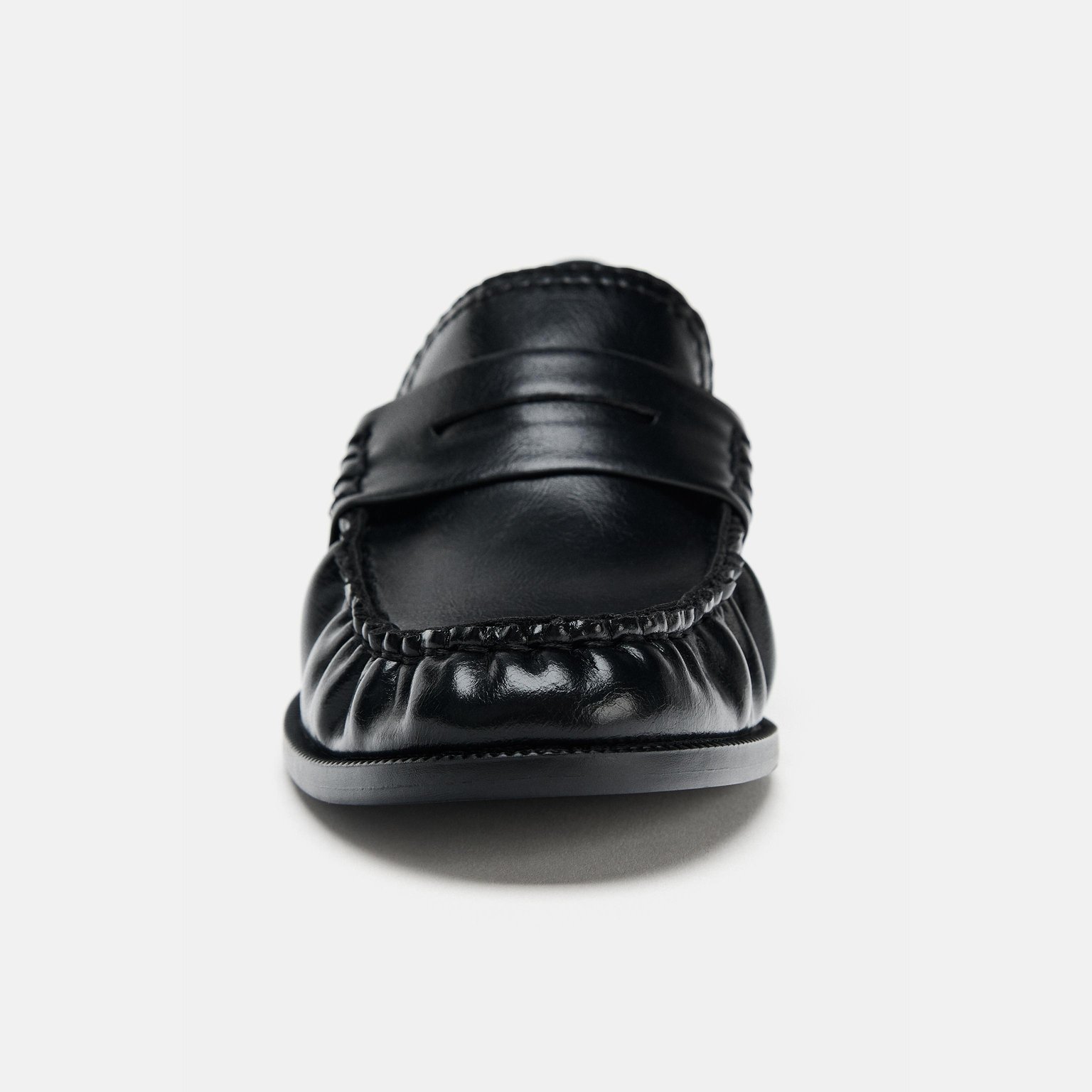حذاء لوفر مسطّح بتجميعة أمامية – لون أسود – Black (Gathered Flat Loafers) لوفر مسطّح بتصميم أنيق يجمع بين البساطة واللمسة العصرية، يتميز بتجميعة أمامية خفيفة تمنح مظهرًا ناعمًا وانسيابيًا. يأتي بمقدمة مستديرة ونعل منخفض مريح، مما يجعله مناسبًا للإطلالات اليومية العملية والكاجوال.