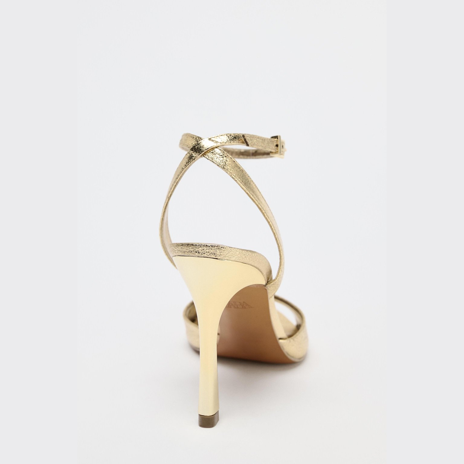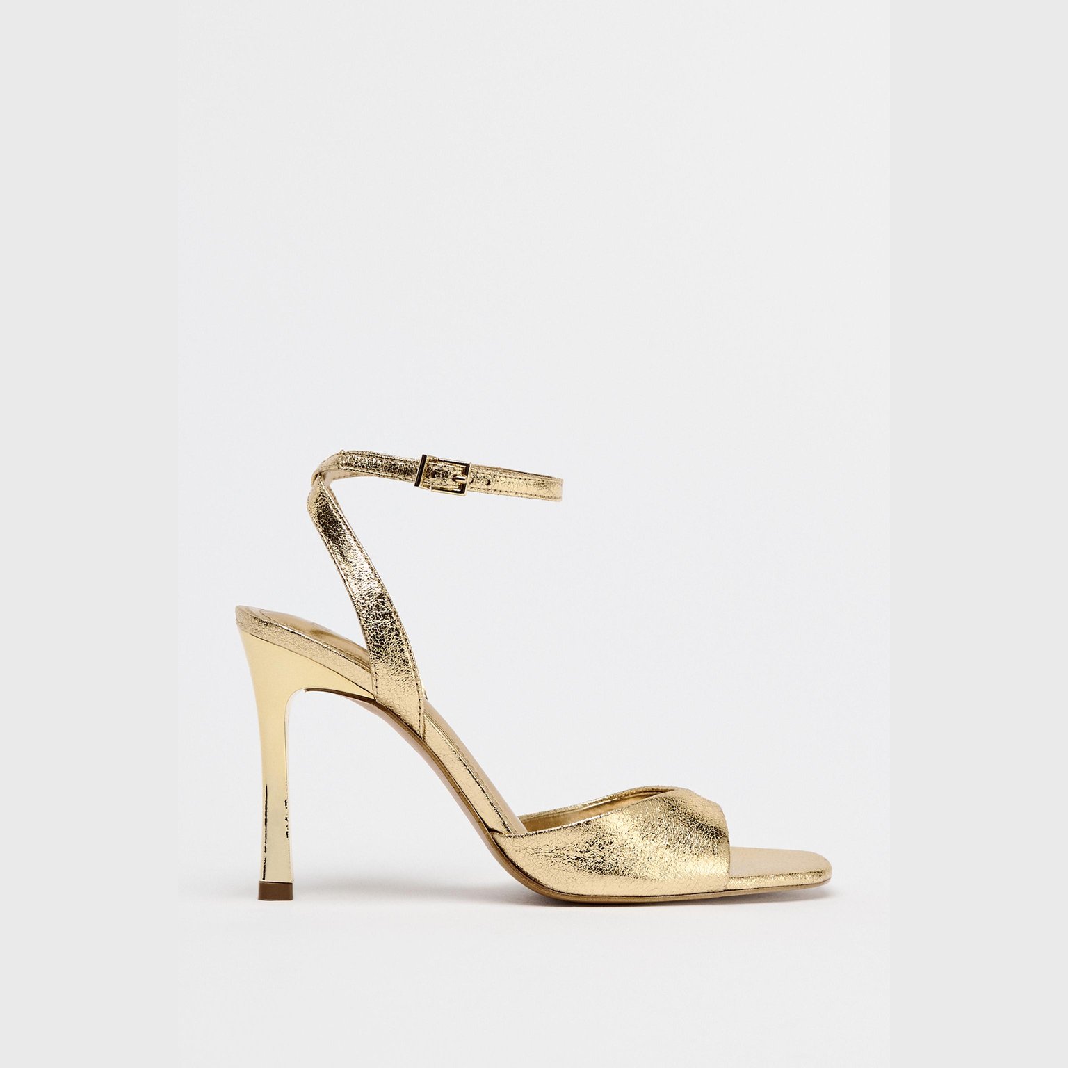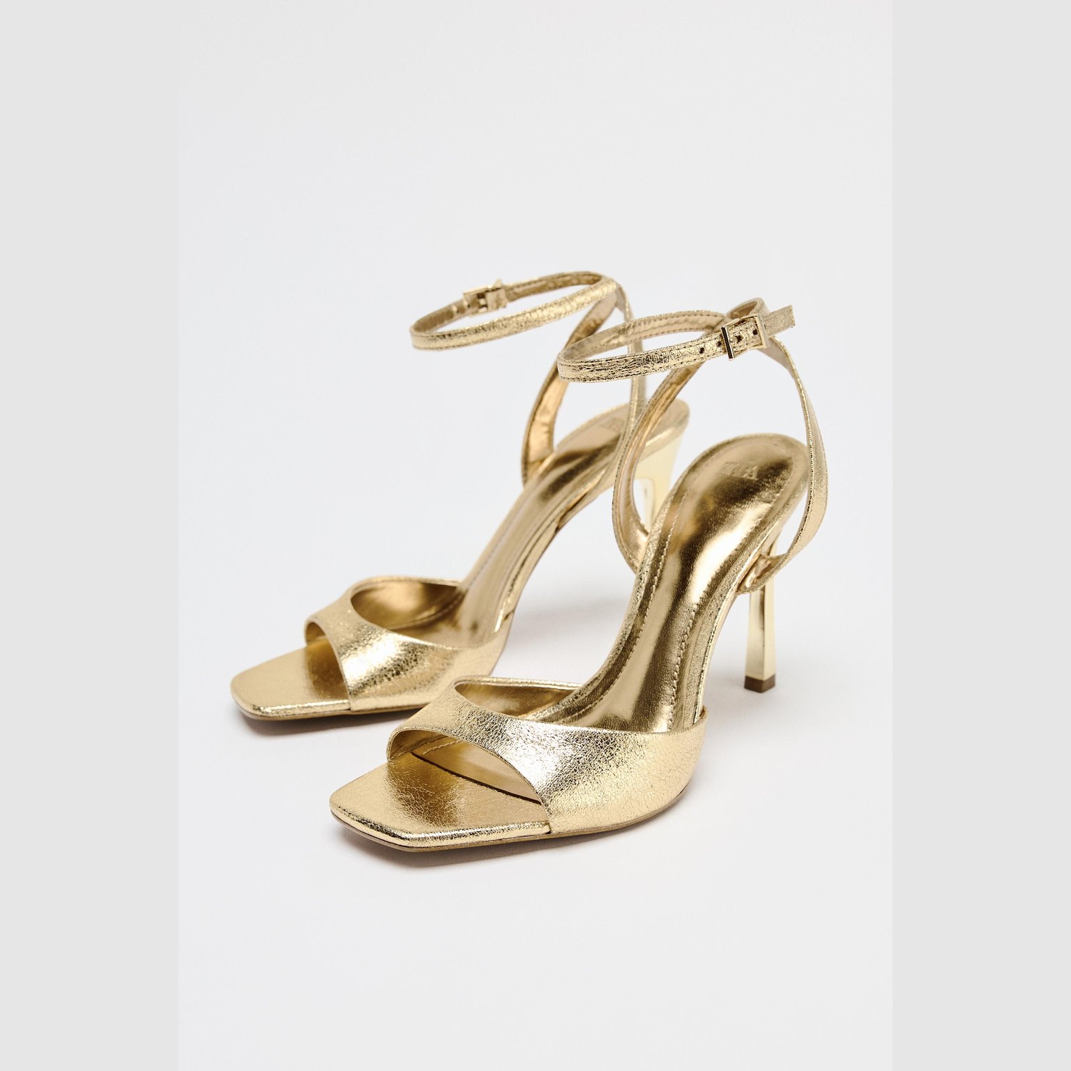 صندل كعب عالي بتأثير لامع – لون ذهبي – Gold (Patent‑Finish High‑Heel Sandals) صندل أنيق بتأثير لامع، يتميز بتصميم مفتوح مع سير رفيع حول الكاحل وإبزيم معدني يمنح ثباتًا وأناقة إضافية. يأتي بكعب رفيع يمنح إطلالة أنثوية راقية، مناسب للمناسبات والإطلالات المسائية.