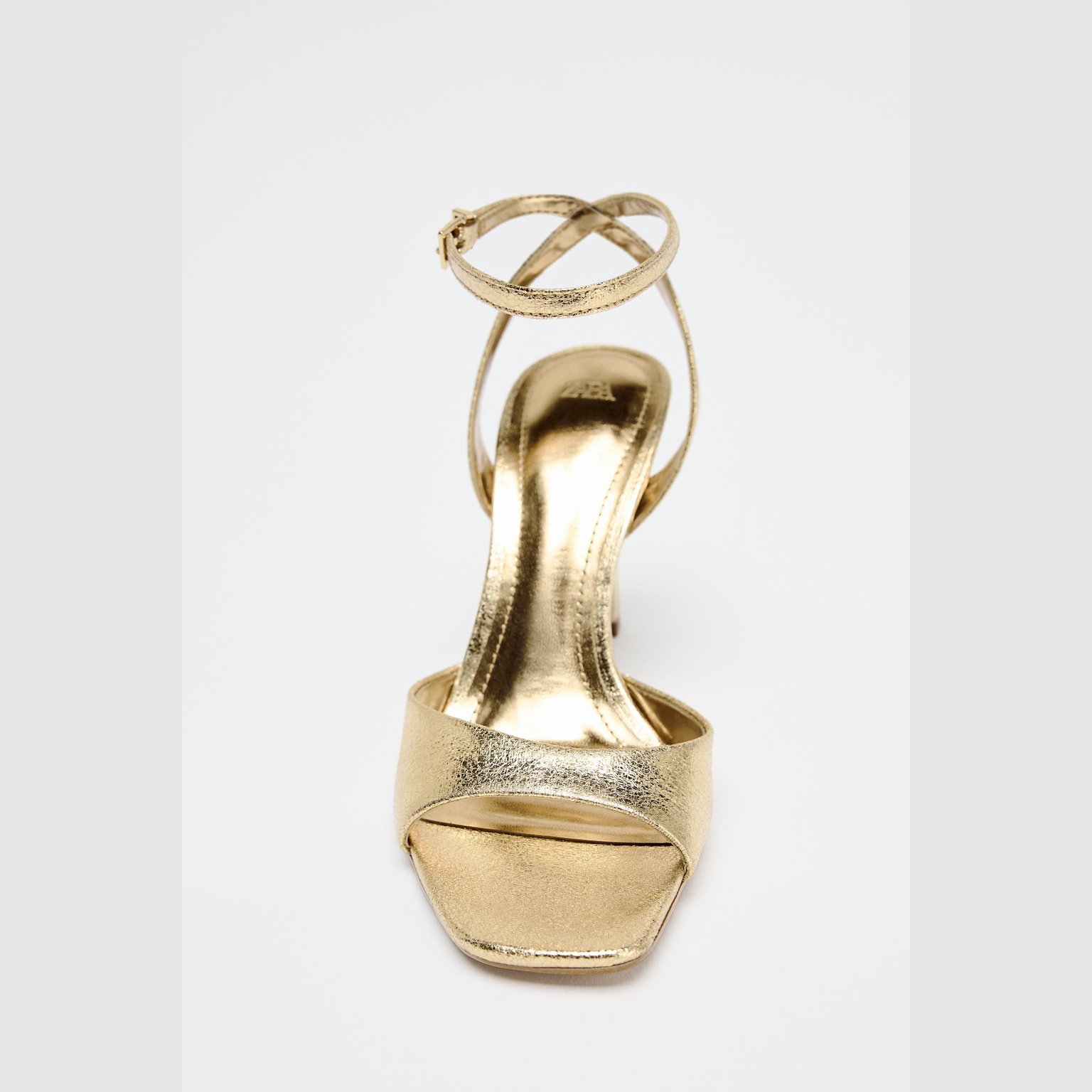- التصميم: صندل كعب عالي بتأثير لامع مع سير كاحل