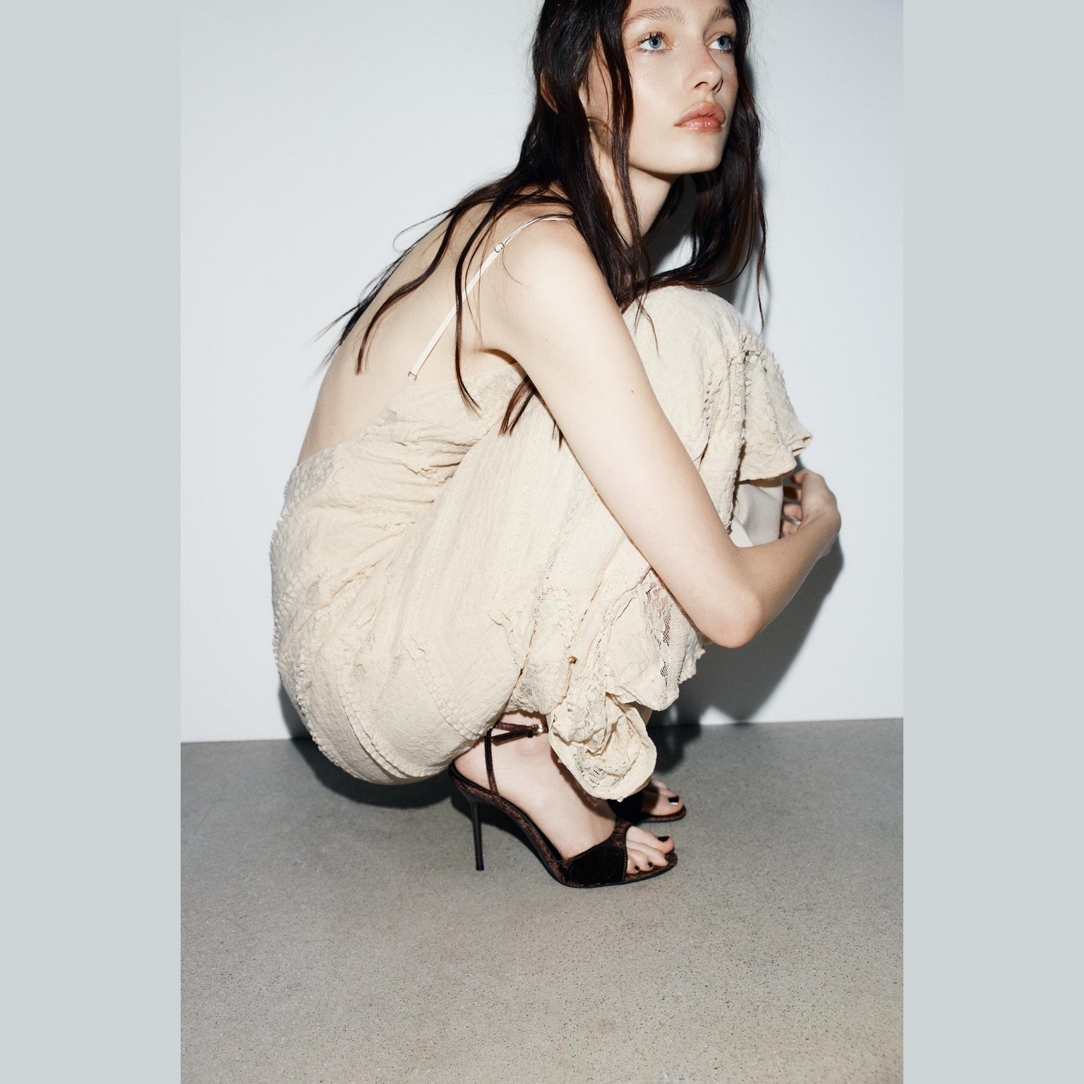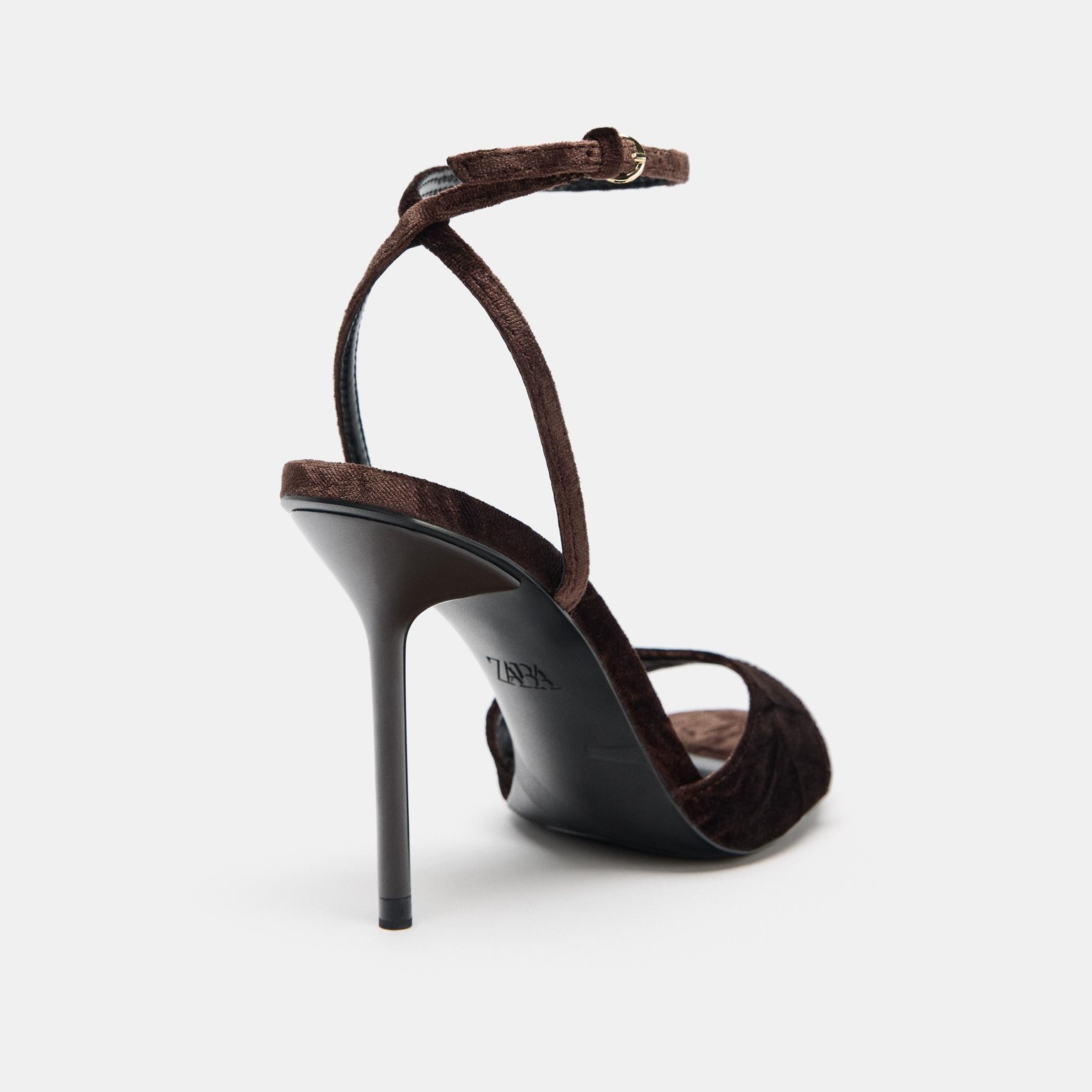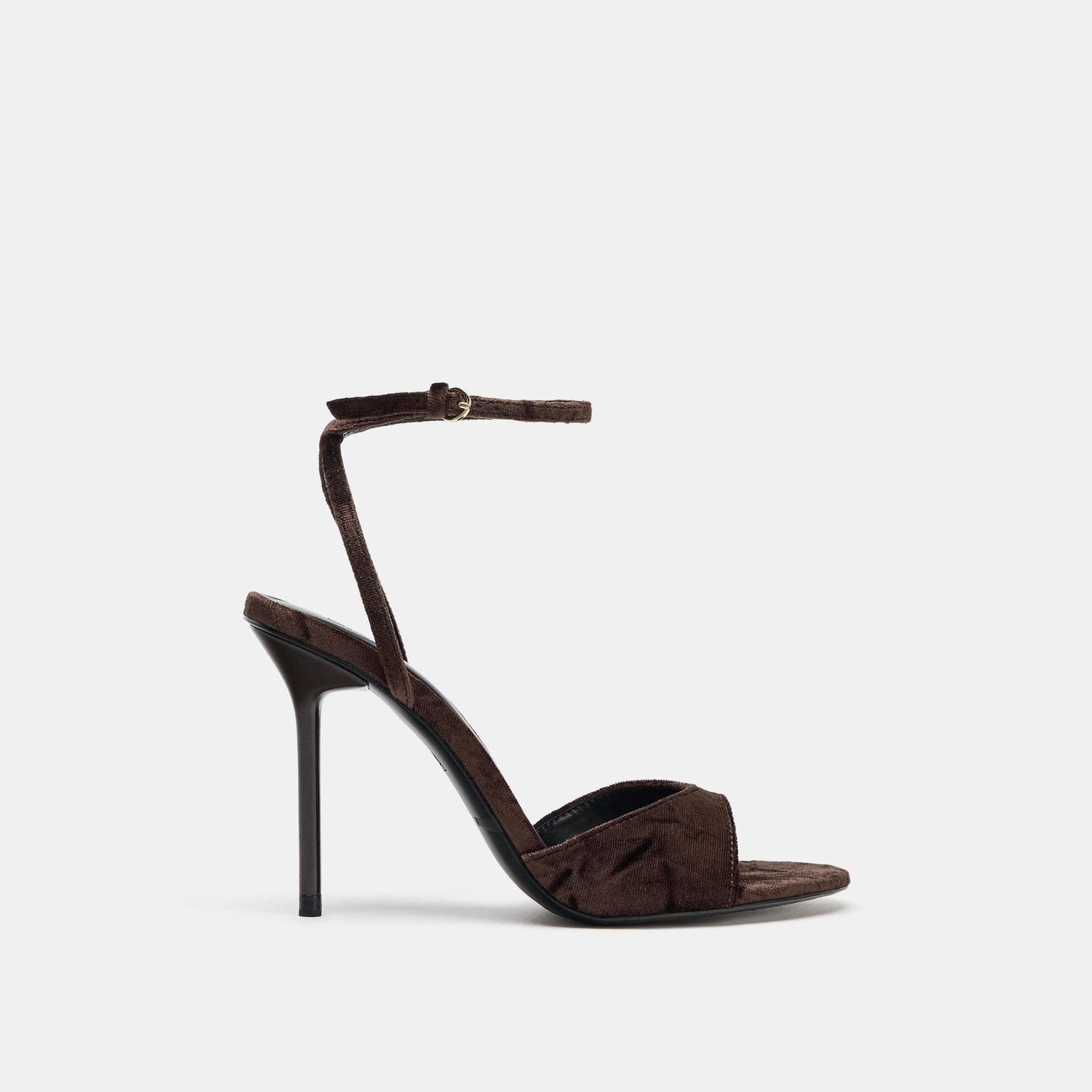 صندل كعب عالي بتأثير مخملي – لون بني – Brown (Velvet‑Effect Heeled Sandals) صندل أنيق بتأثير مخملي ناعم، يتميز بسير أمامي عريض وسير حول الكاحل مع إبزيم معدني يمنح ثباتًا وأناقة إضافية. يأتي بكعب رفيع يمنح إطلالة أنثوية راقية، مناسب للمناسبات والإطلالات المسائية.