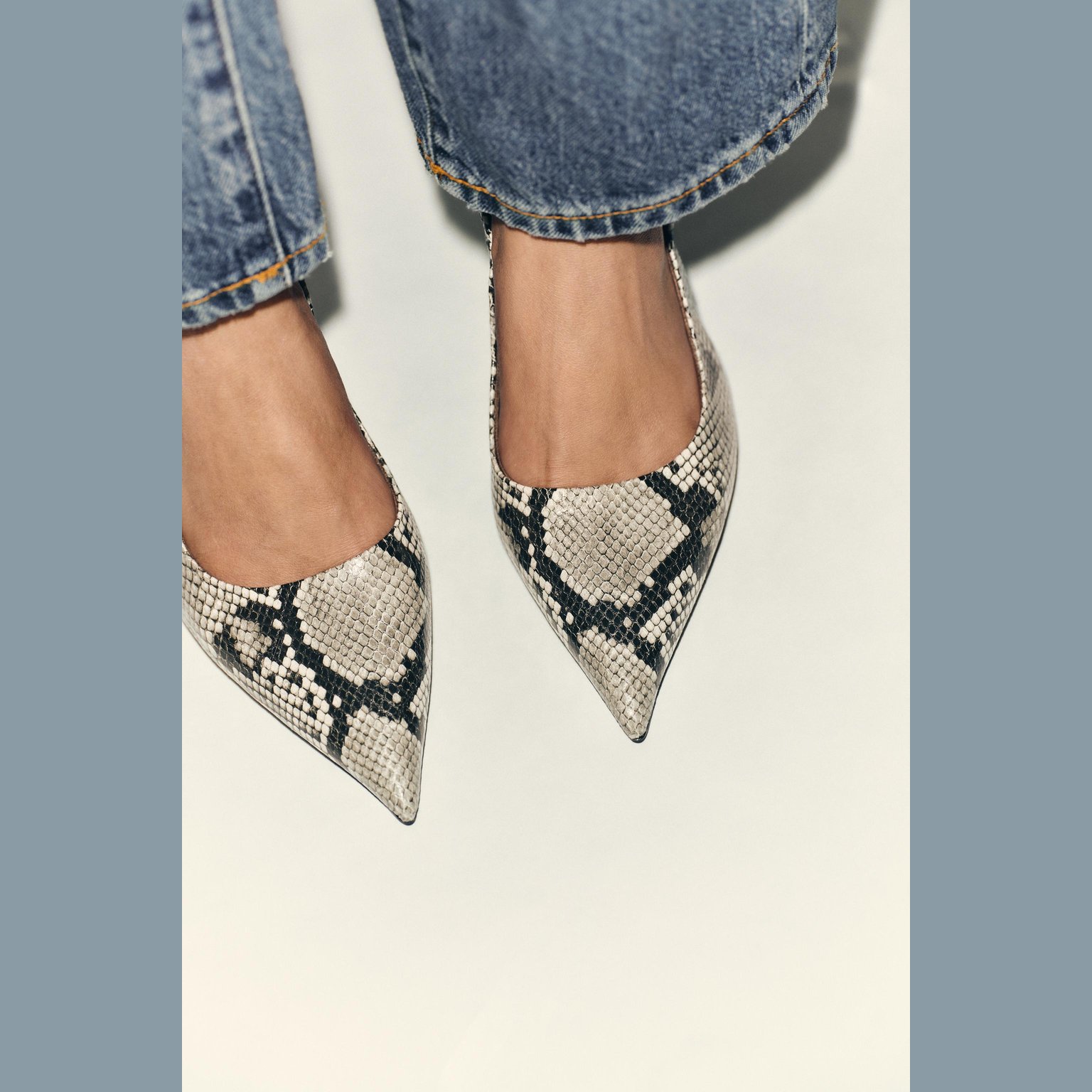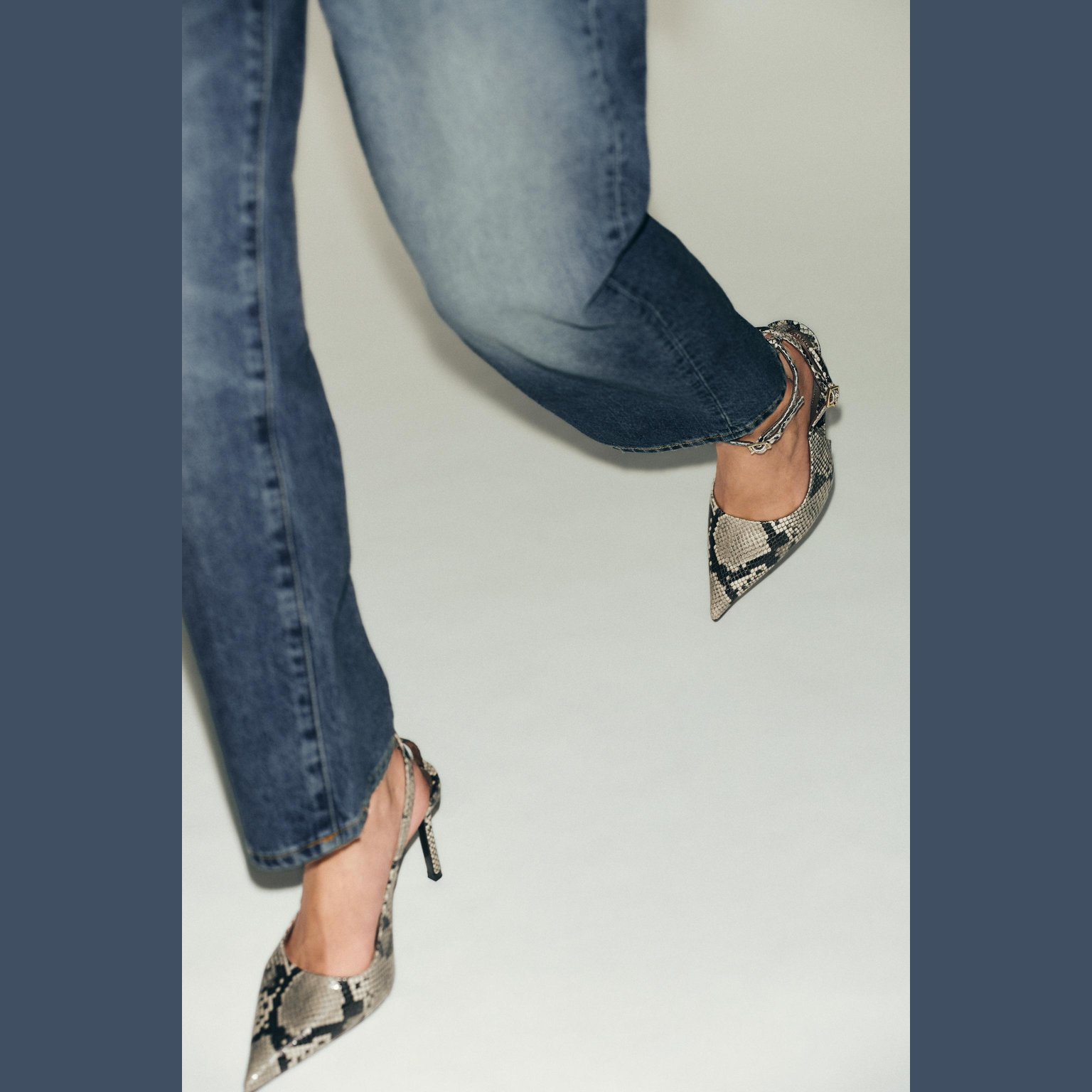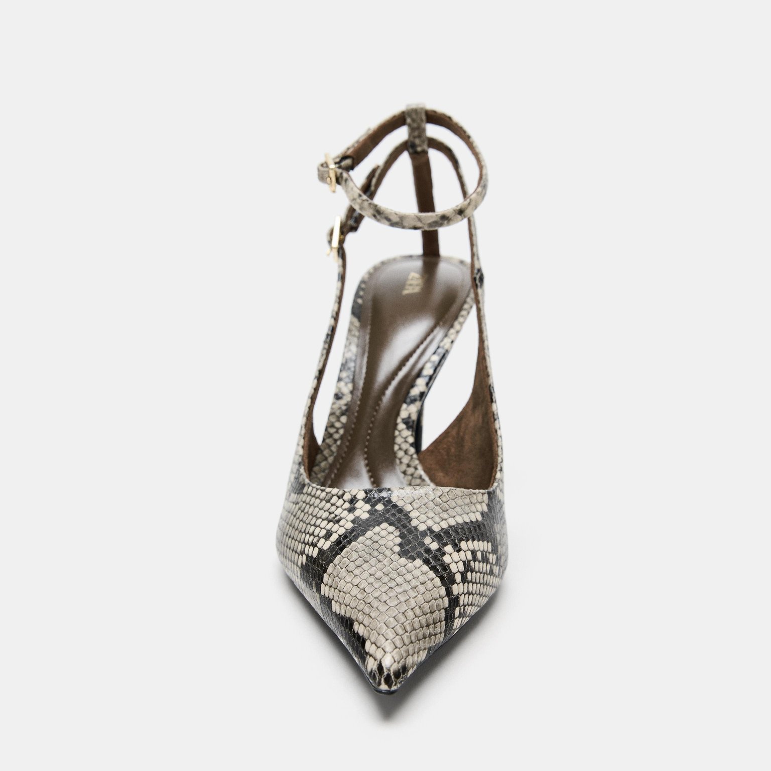 حذاء سلاباك بكعب رفيع بنقشة الحيوانات – لون سنيك سكين – Snakeskin (Animal Print Slingback Heeled Shoes) حذاء أنيق بنقشة الحيوانات يمنح مظهرًا جريئًا وعصريًا، مع تصميم مدبب وكعب رفيع يضيف لمسة أنثوية راقية. يأتي مع سير خلفي قابل للتعديل وإبزيم معدني لثبات أفضل، مما يجعله مناسبًا للمناسبات والإطلالات المسائية.