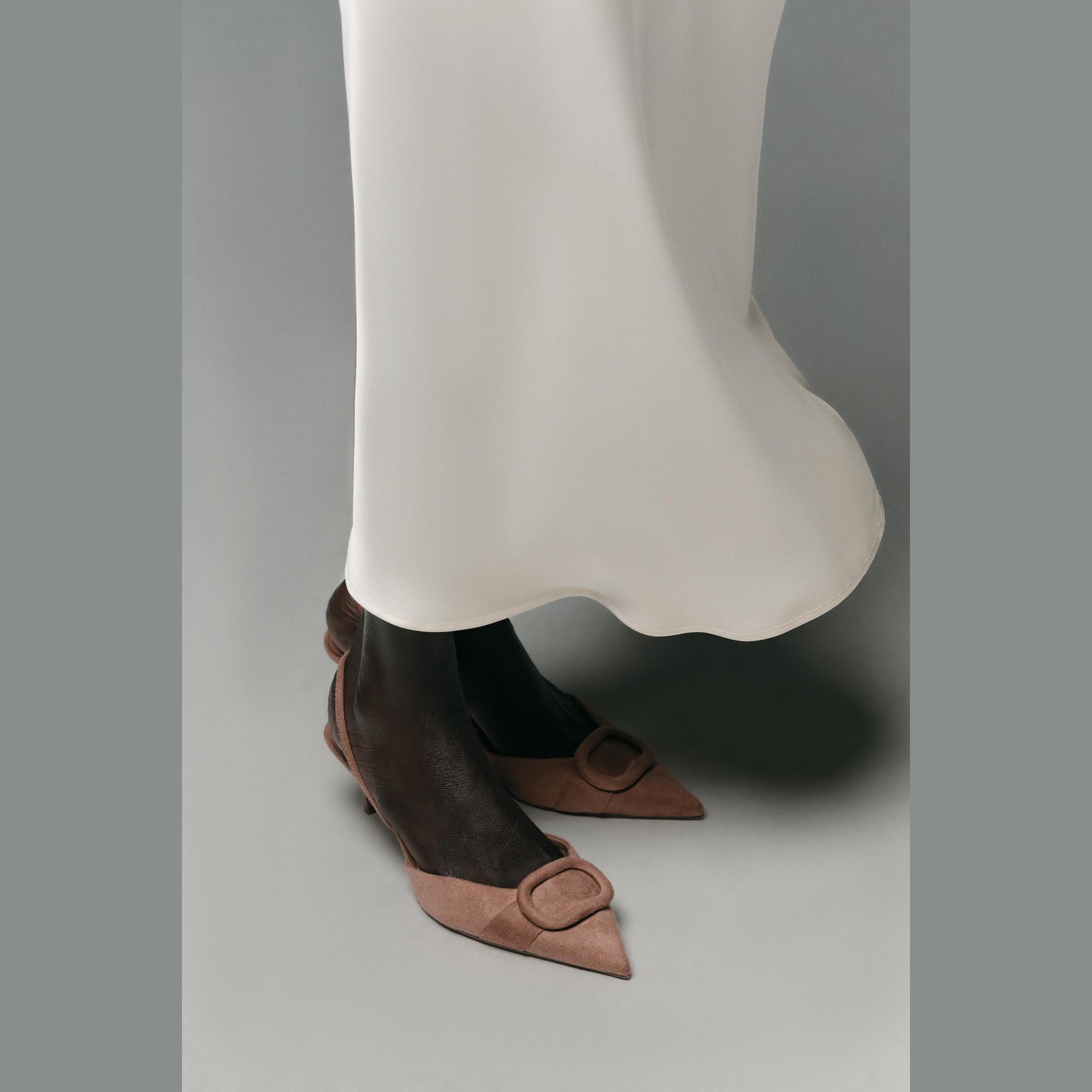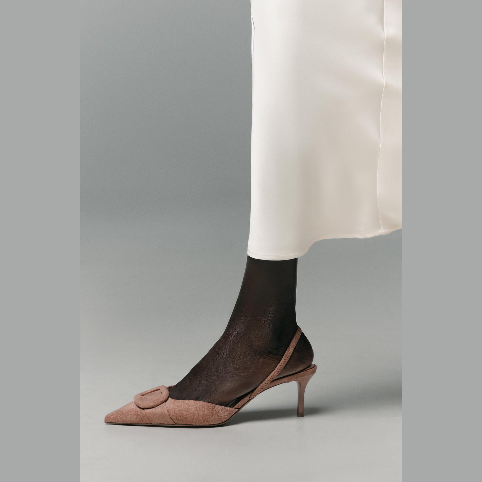 - التصميم: حذاء سلاباك بكعب رفيع مع قطعة أمامية مبطنة