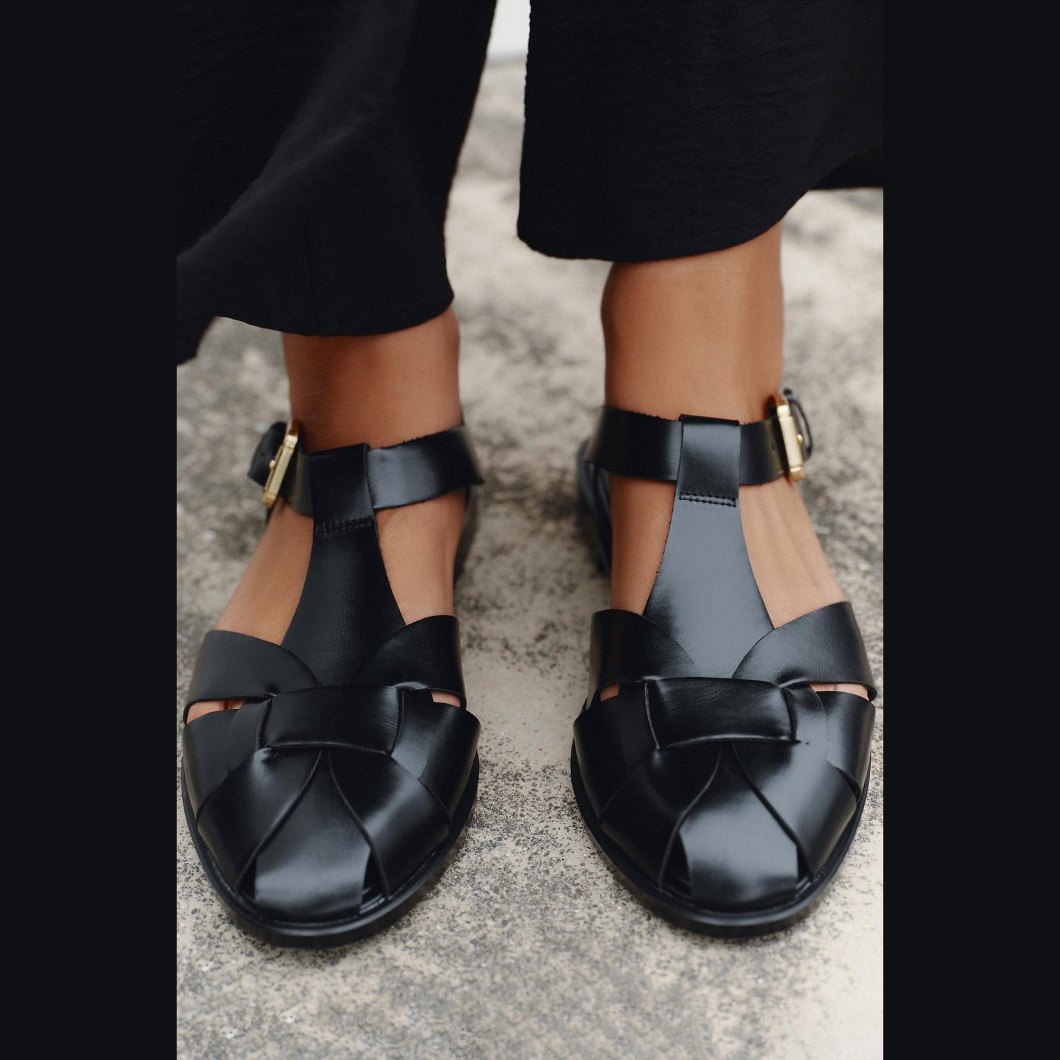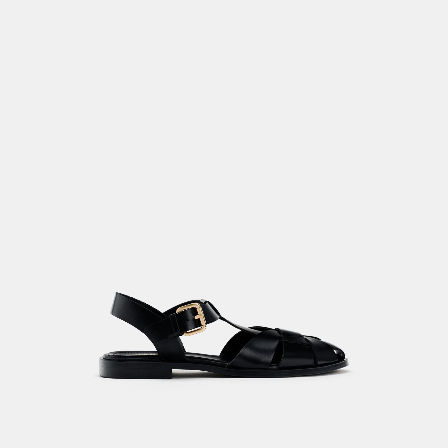 صندل مسطّح بتصميم قفصي – لون أسود – Black (Flat Cage Sandals) صندل مسطّح بتصميم قفصي عصري، يتميز بأشرطة متقاطعة في الأمام تمنح ثباتًا وأناقة بسيطة. يأتي مع سير كاحل بإبزيم قابل للتعديل ونعل مسطّح بارتفاع 2 cm، مما يجعله مناسبًا للاستخدام اليومي والإطلالات الصيفية.