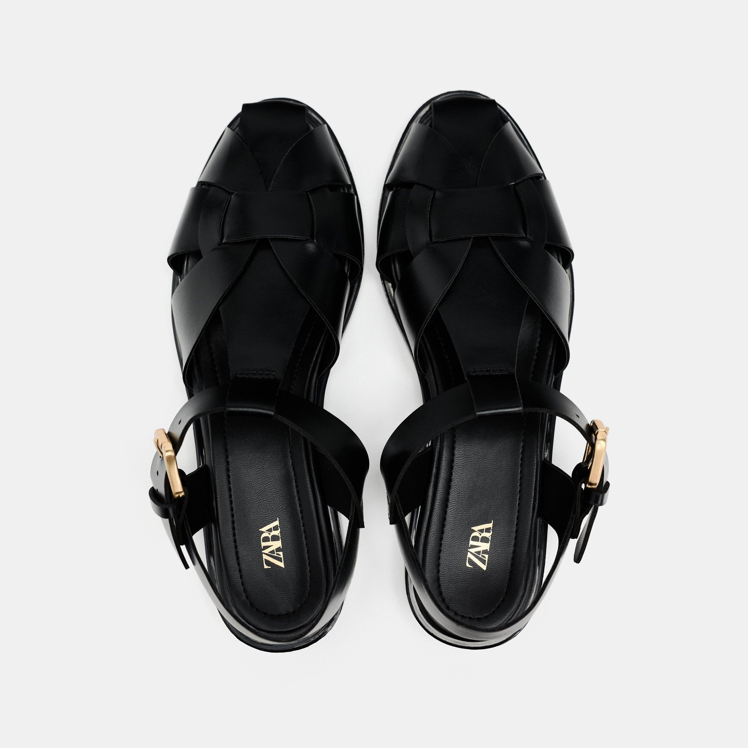 - التصميم: صندل مسطّح بتصميم قفصي مع أشرطة متقاطعة