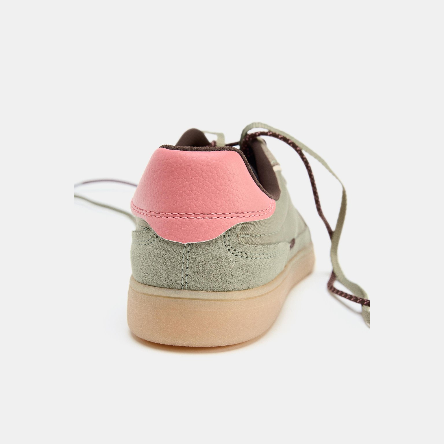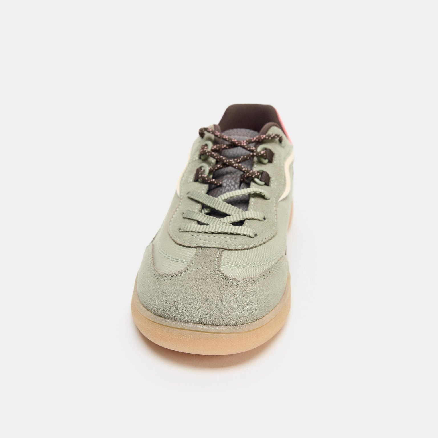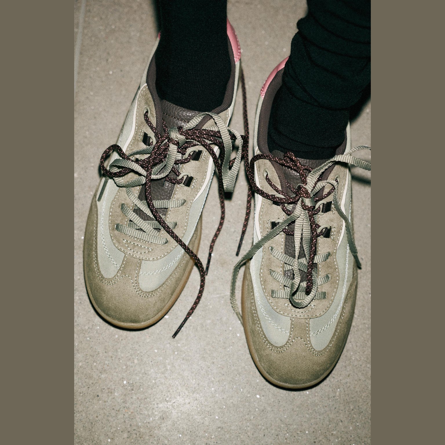 حذاء رياضي بتفاصيل متباينة – لون كاكي أخضر – Khaki Green (Contrast Trainers) حذاء رياضي عصري بتصميم متعدد الخامات، يتميز بتفاصيل لونية متباينة تمنح مظهرًا ديناميكيًا وجريئًا. يأتي بنعل مريح بارتفاع 2.5 cm مع رباط مزدوج بلونين، مما يجعله مناسبًا للاستخدام اليومي والإطلالات الكاجوال.