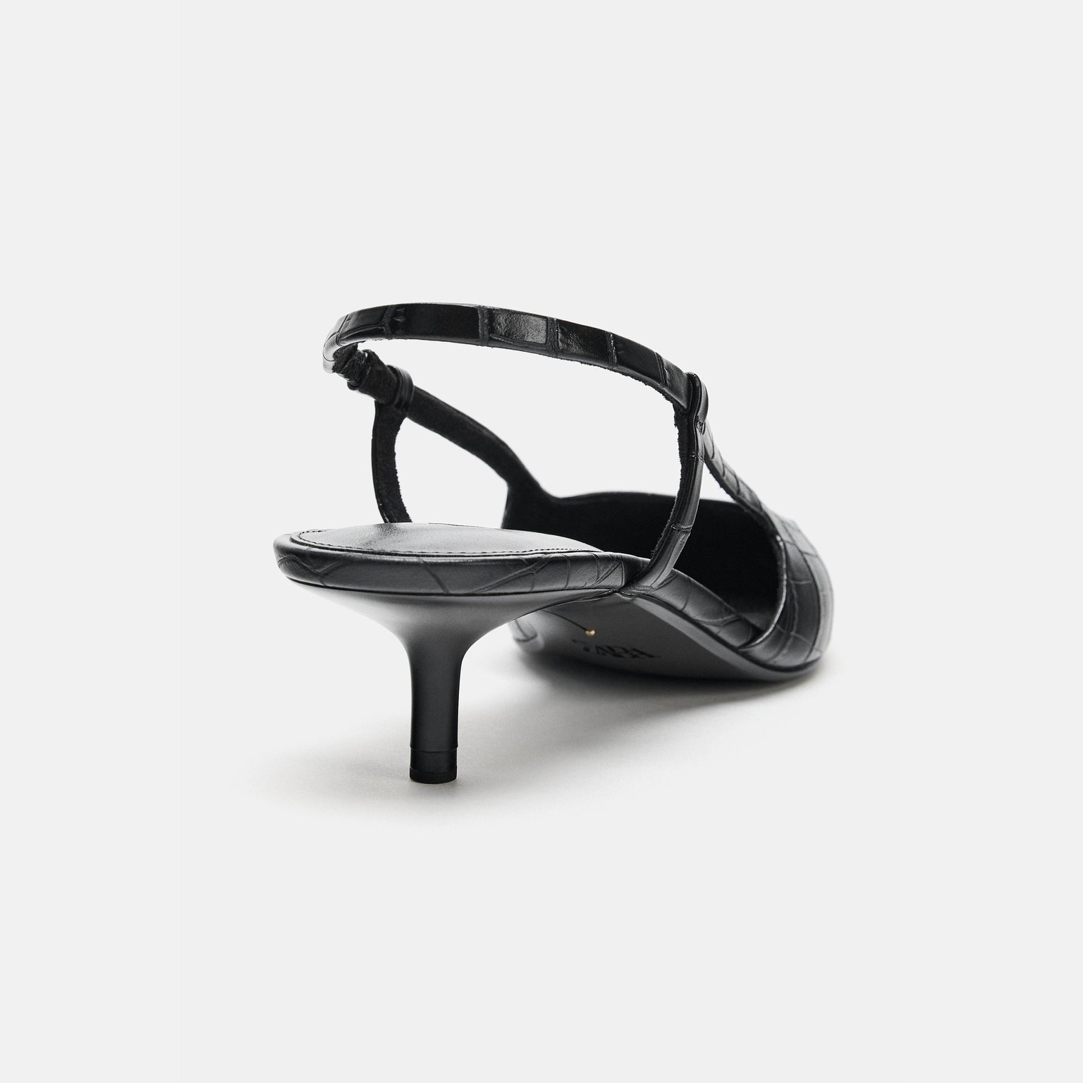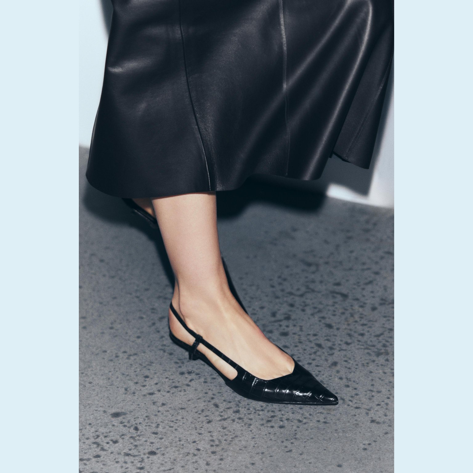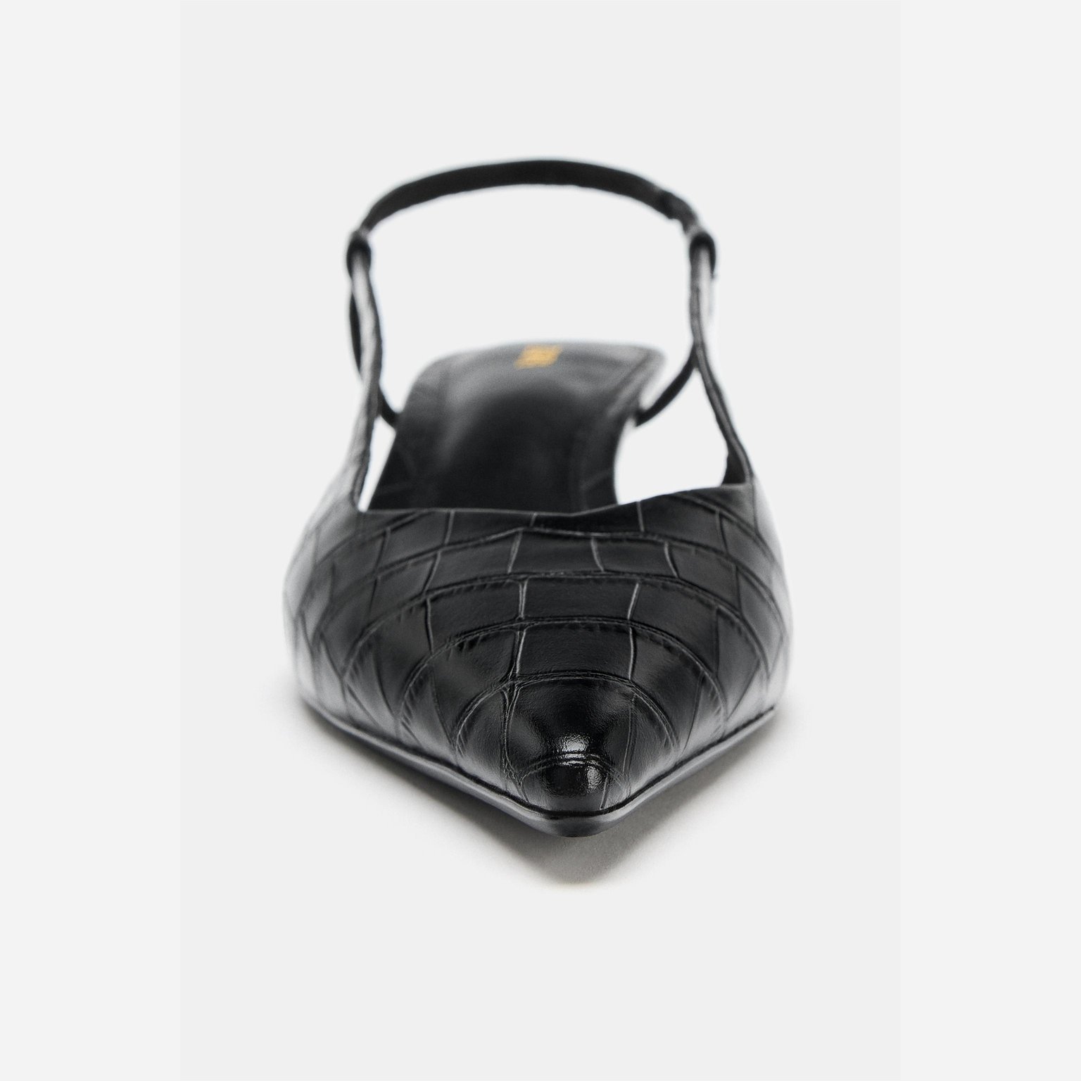 حذاء سلاباك بنقشة بارزة – لون أسود – Black (Embossed Slingback Shoes) حذاء أنيق بتصميم سلاباك عصري، يتميز بنقشة بارزة على السطح تمنح مظهرًا فاخرًا وملمسًا مميزًا. يأتي مع سير خلفي مرن وكعب منخفض مريح، مما يجعله مناسبًا للإطلالات اليومية والمسائية.