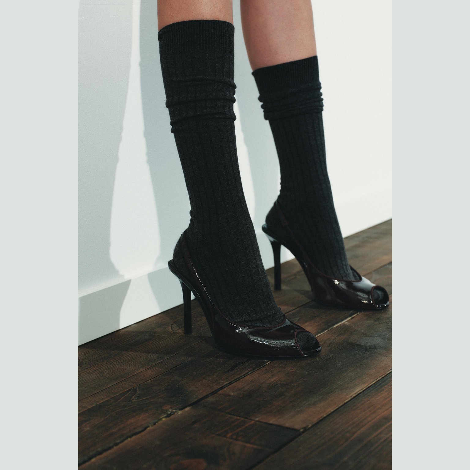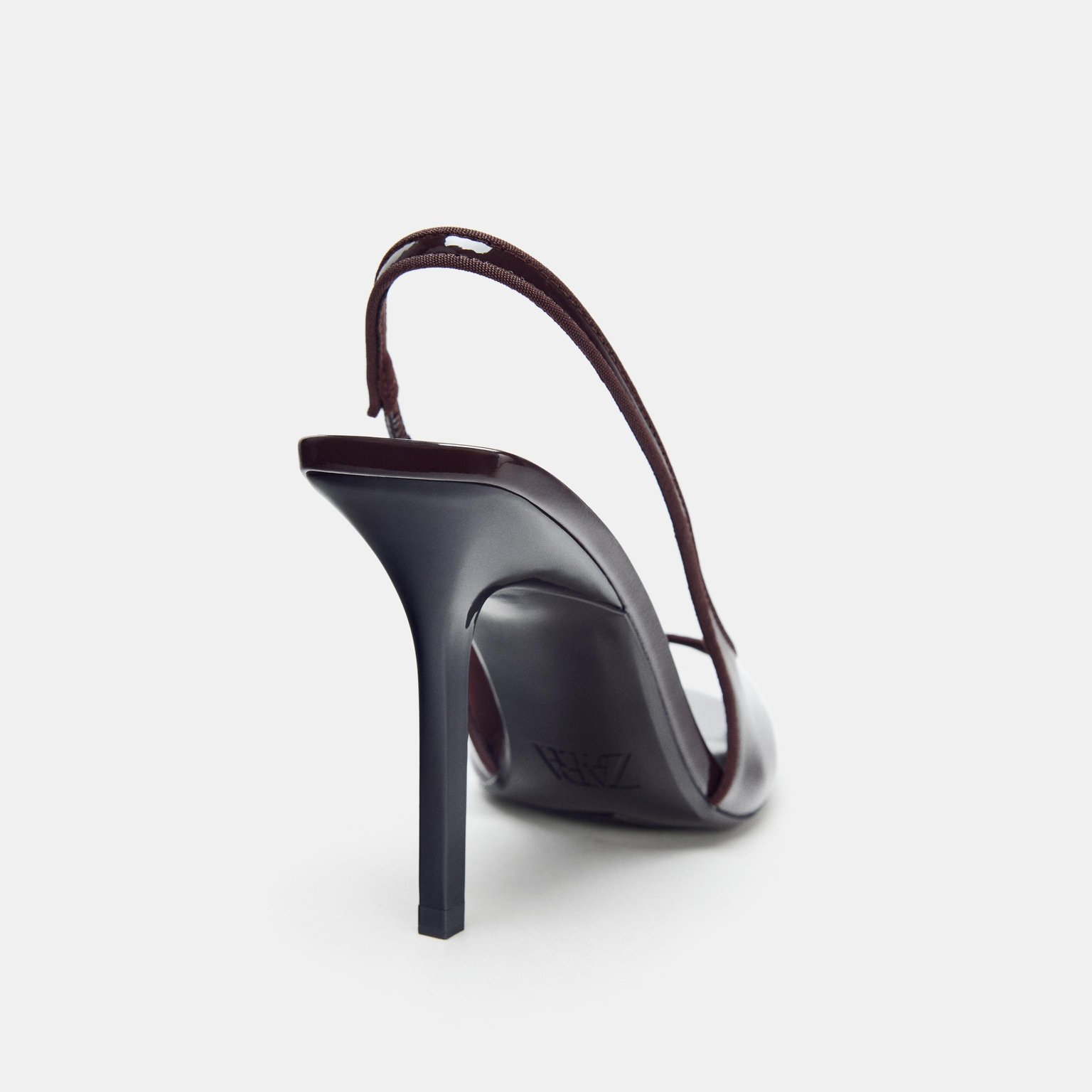 - التصميم: صندل بكعب رفيع بتأثير لامع