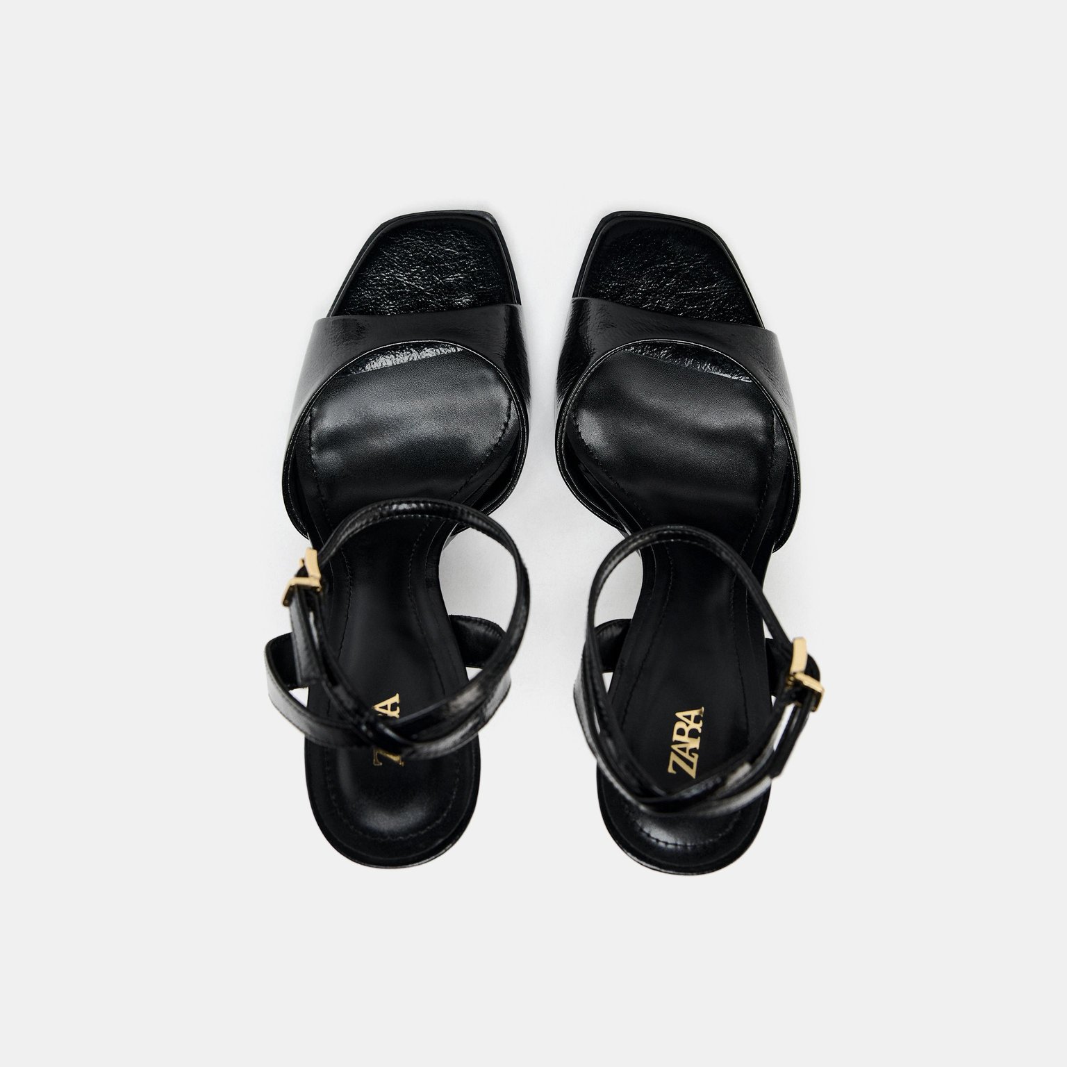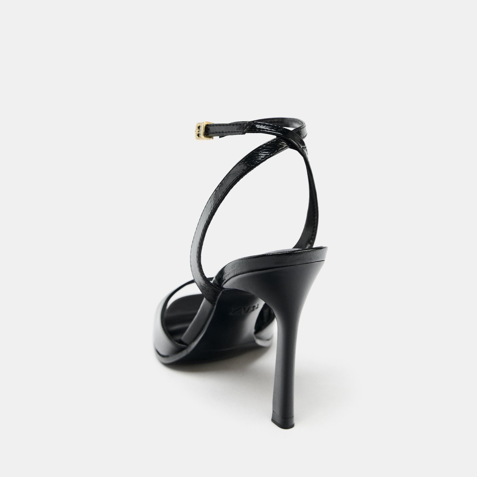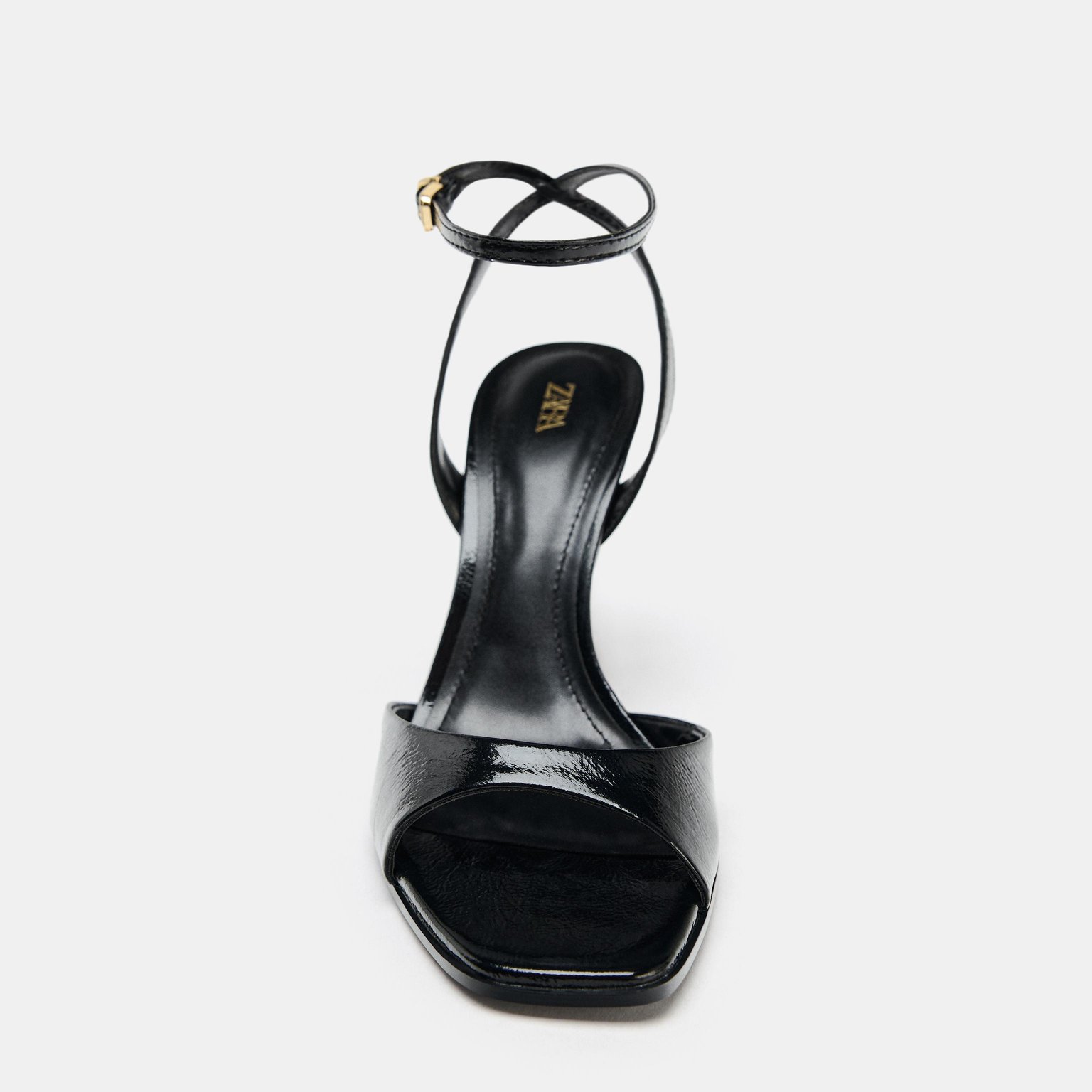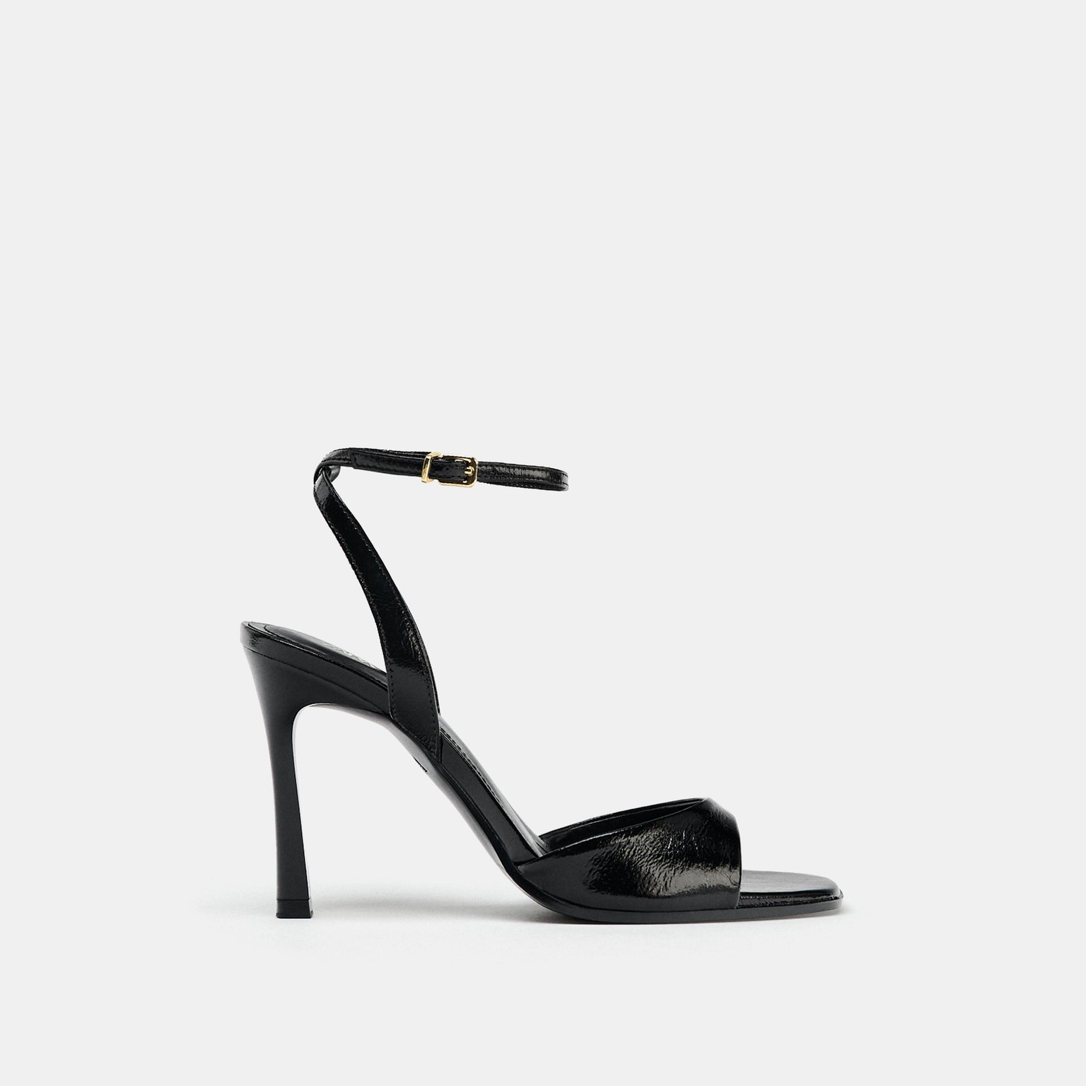 صندل بكعب عالٍ بتأثير لامع – لون أسود – Black (Patent‑Finish High‑Heel Sandals) صندل أنيق بتأثير لامع يمنح مظهرًا فاخرًا، يتميز بسير كاحل قابل للتعديل وكعب رفيع يمنح إطلالة أنثوية راقية. تصميمه البسيط يجعله مناسبًا للمناسبات والإطلالات المسائية.