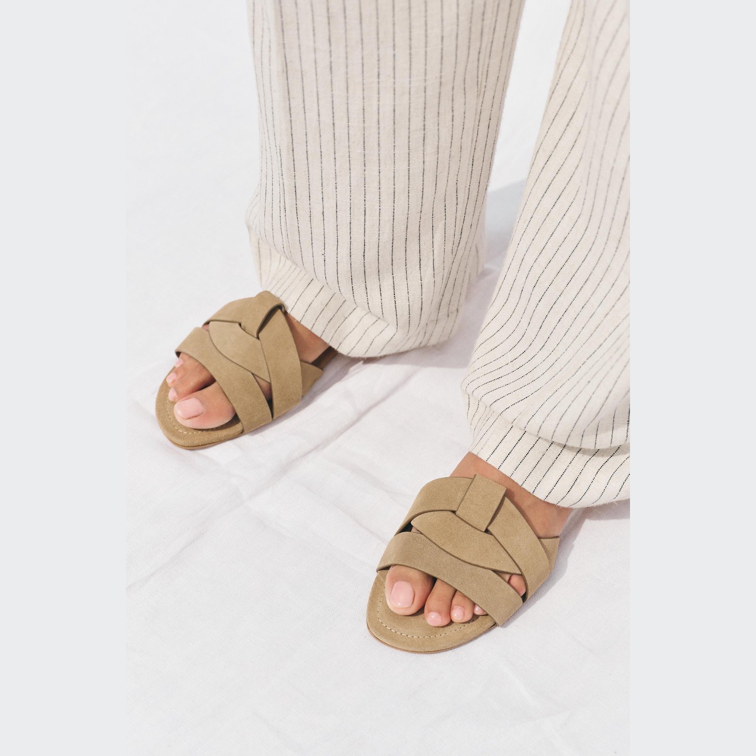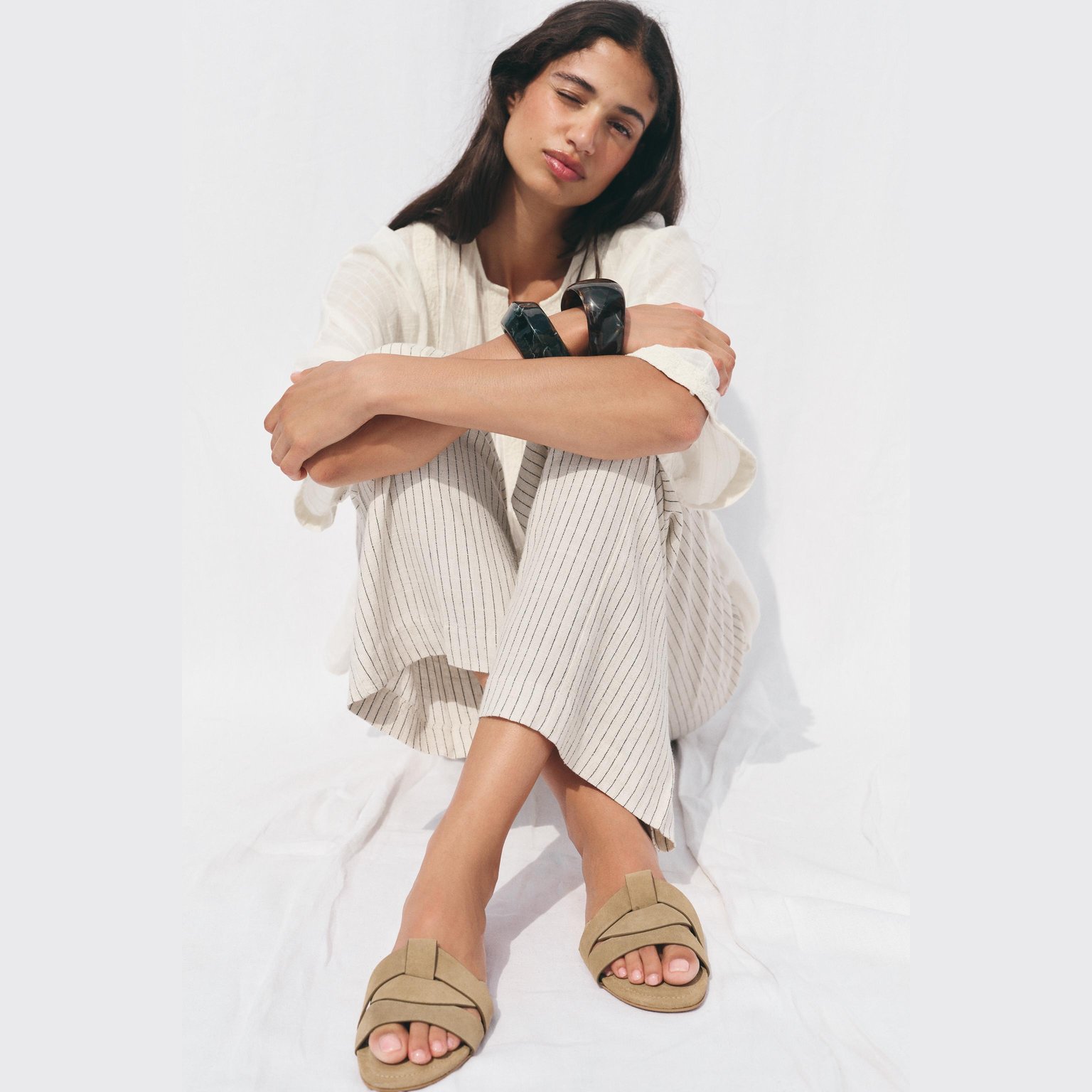 صندل مسطّح من الشمواه بشرائط متقاطعة – لون بني – Brown (Flat Criss‑Cross Split Suede Sandals) صندل مسطّح أنيق مصنوع من الشمواه الطبيعي، يتميز بشرائط متقاطعة في الأمام تمنح مظهرًا عصريًا بسيطًا. يأتي بنعل مسطّح مريح بارتفاع 0.9 cm، مما يجعله خيارًا مثاليًا للإطلالات اليومية والصيفية.