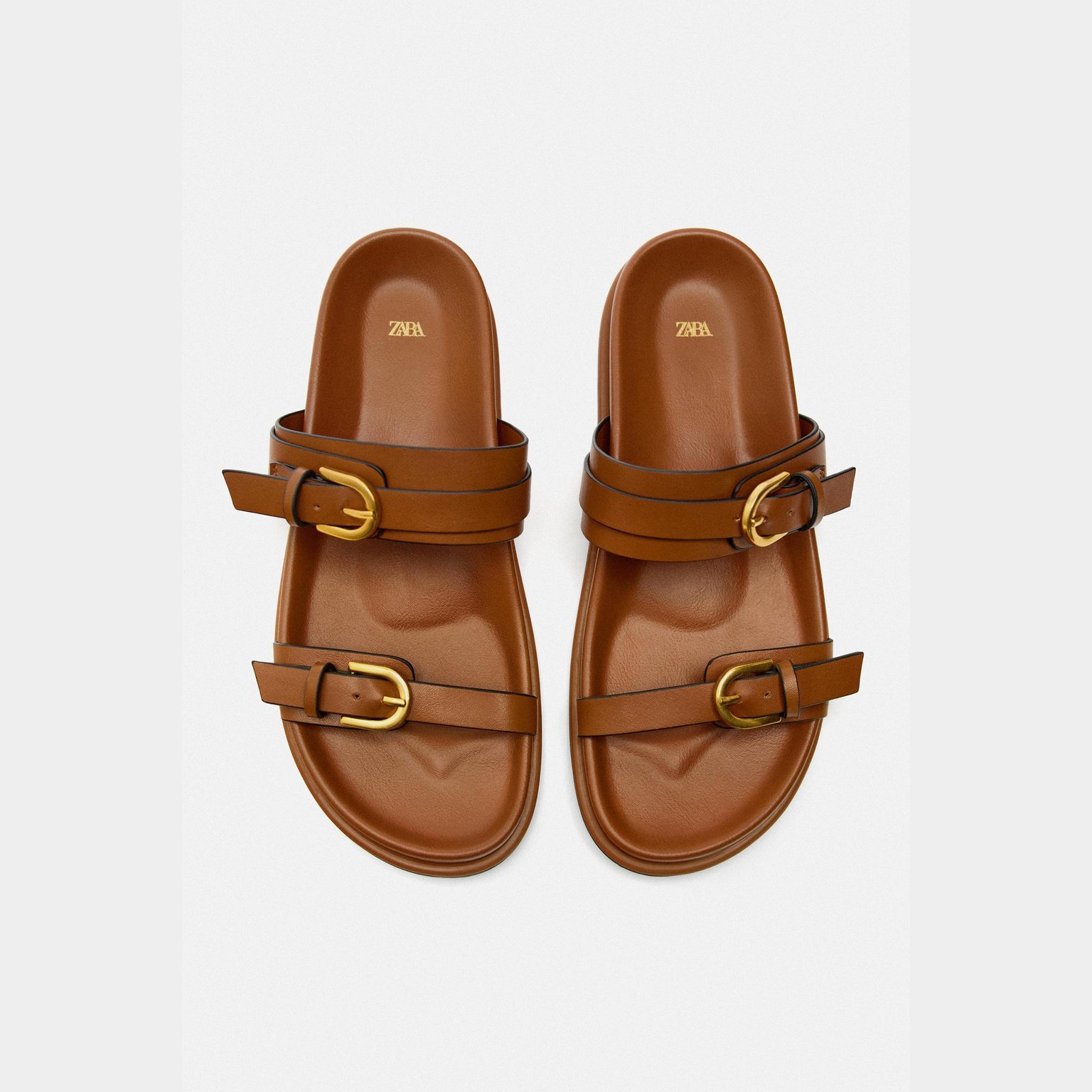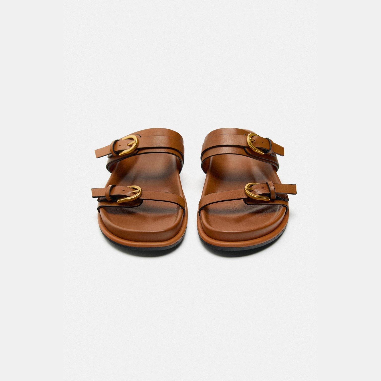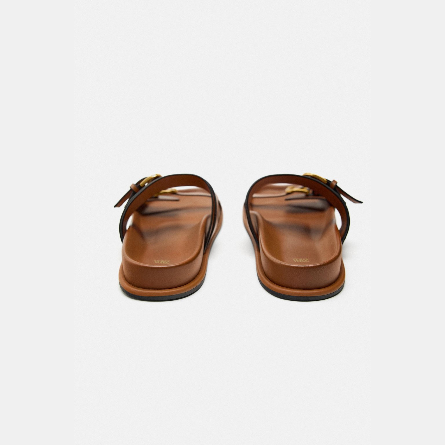 صندل مسطّح بشرائط وإبزيم — لون بني — Brown (Sandals with Buckles) صندل مسطّح بتصميم عصري بسيط، يتميز بشرائط أمامية مع إبزيم معدني يمنح لمسة أنيقة. يأتي بمقدمة مستديرة ونعل مريح بارتفاع 2.5 cm، مما يجعله مناسبًا للإطلالات اليومية والصيفية.