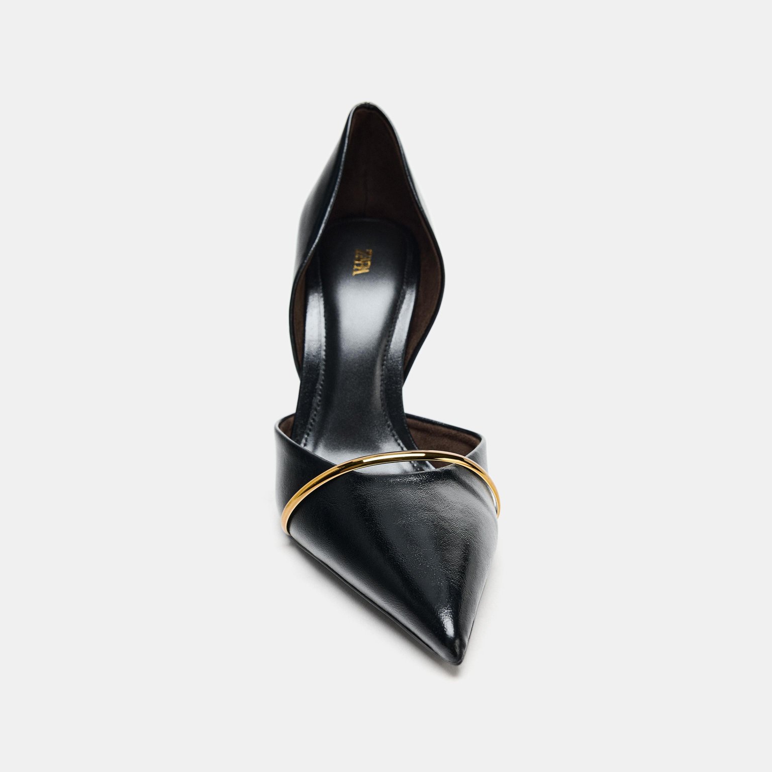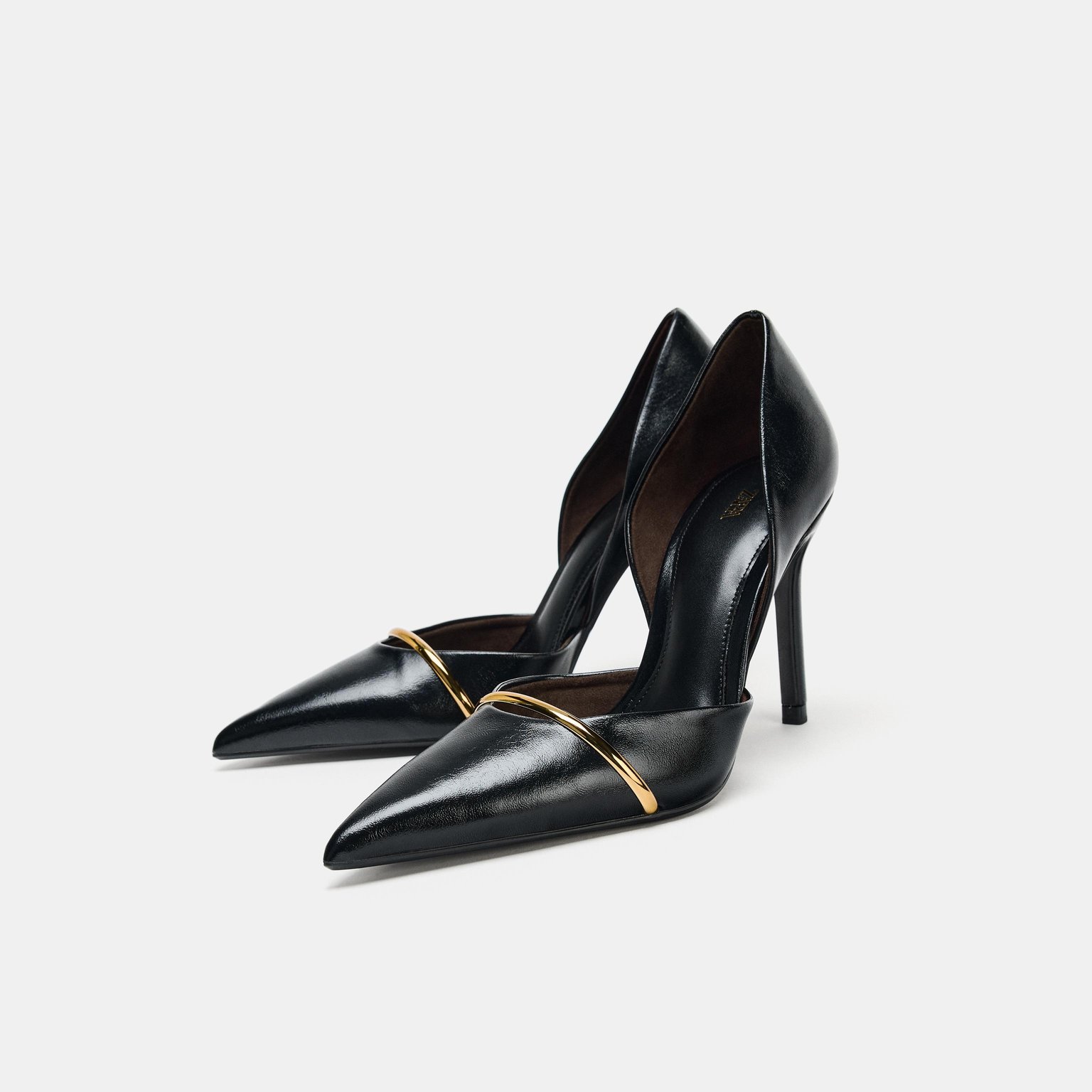حذاء بكعب عالٍ مع سير معدني – لون أسود – Black (High Heel Shoes with Metallic Strap) حذاء أنيق بتصميم عصري، يتميز بسير معدني أمامي يمنح لمسة فاخرة، مع كعب رفيع يضيف إطلالة أنثوية راقية. يأتي بمقدمة مدببة وتصميم بسيط يسهل تنسيقه مع الإطلالات المسائية والرسمية.