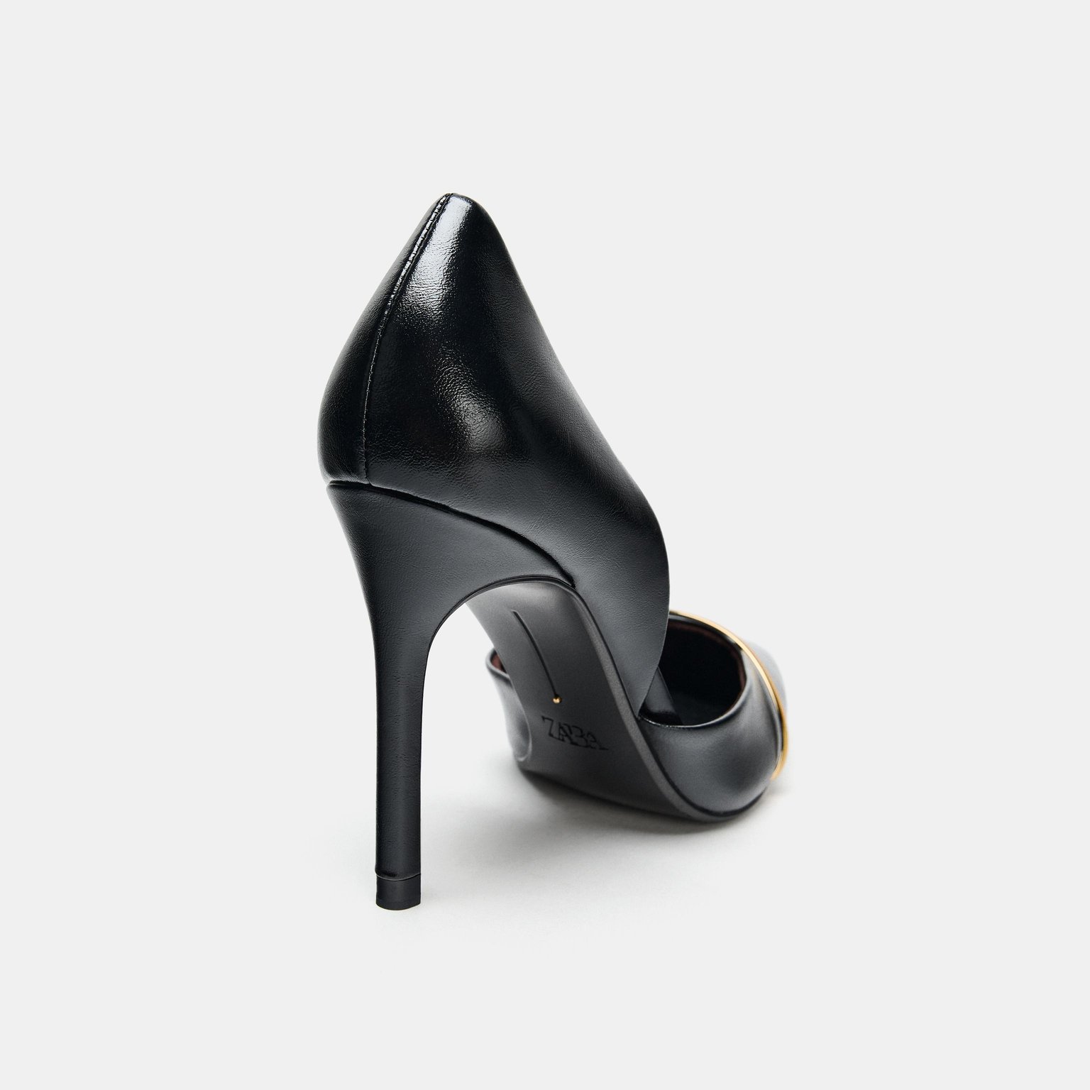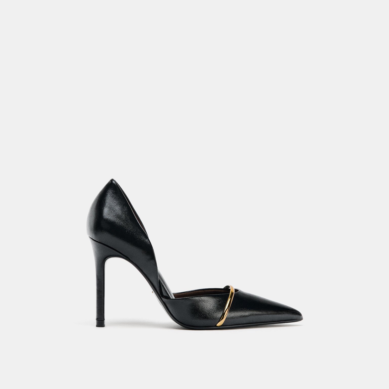 - التصميم: حذاء بكعب رفيع مع سير معدني أمامي