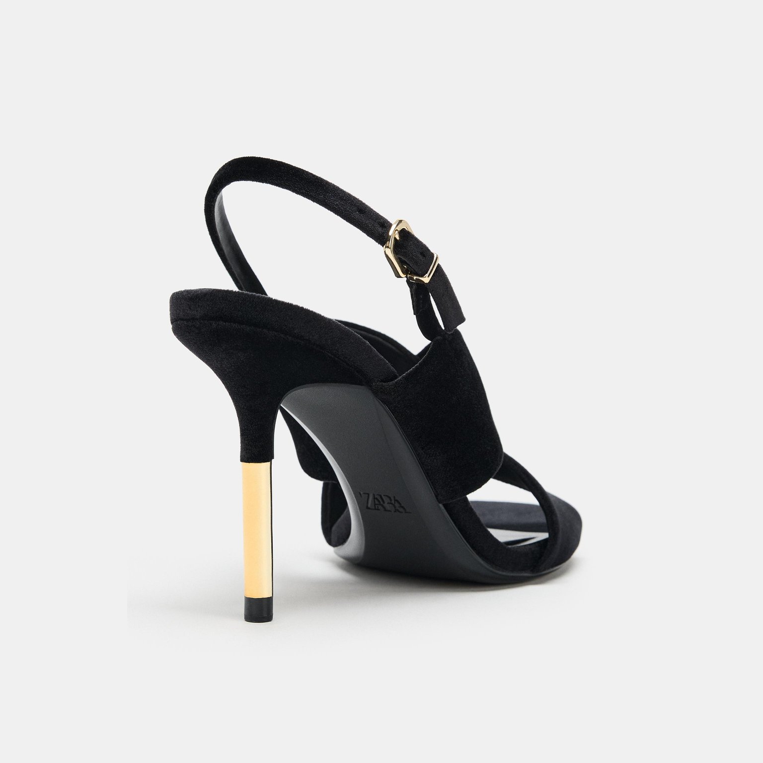 صندل بكعب عالٍ مع أربطة متقاطعة – لون أسود – Black (Crossover Heeled Sandals) صندل أنيق بتصميم مخملي ناعم، يتميز بأربطة متقاطعة في الأمام تمنح مظهرًا راقيًا، مع كعب رفيع مزوّد بتفصيل معدني يضيف لمسة فاخرة. يأتي بسير حول الكاحل مع إبزيم للإغلاق، ومقدمة مدببة تمنح إطلالة أنثوية عصرية.