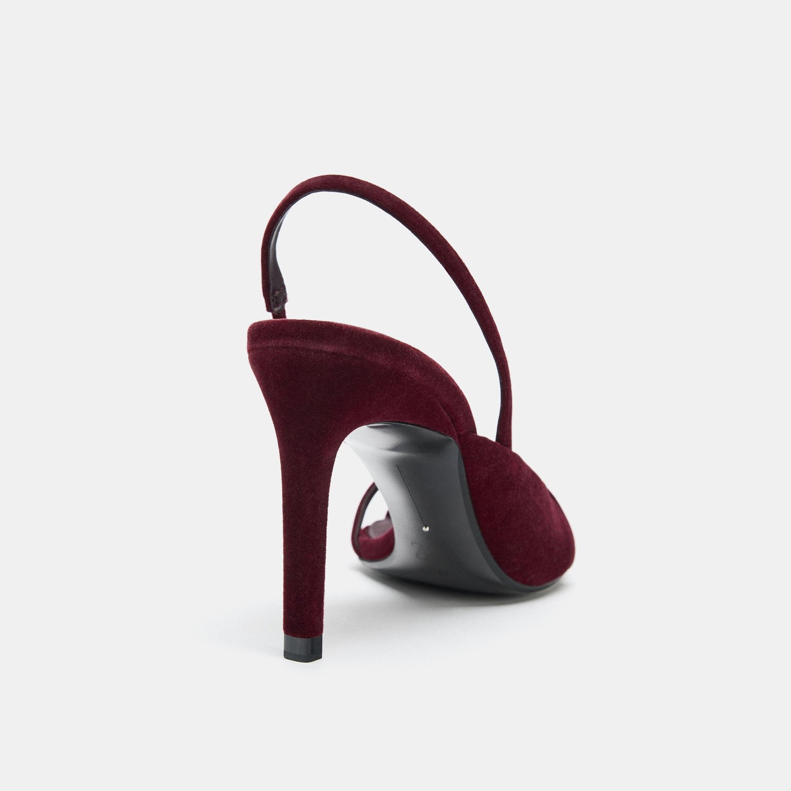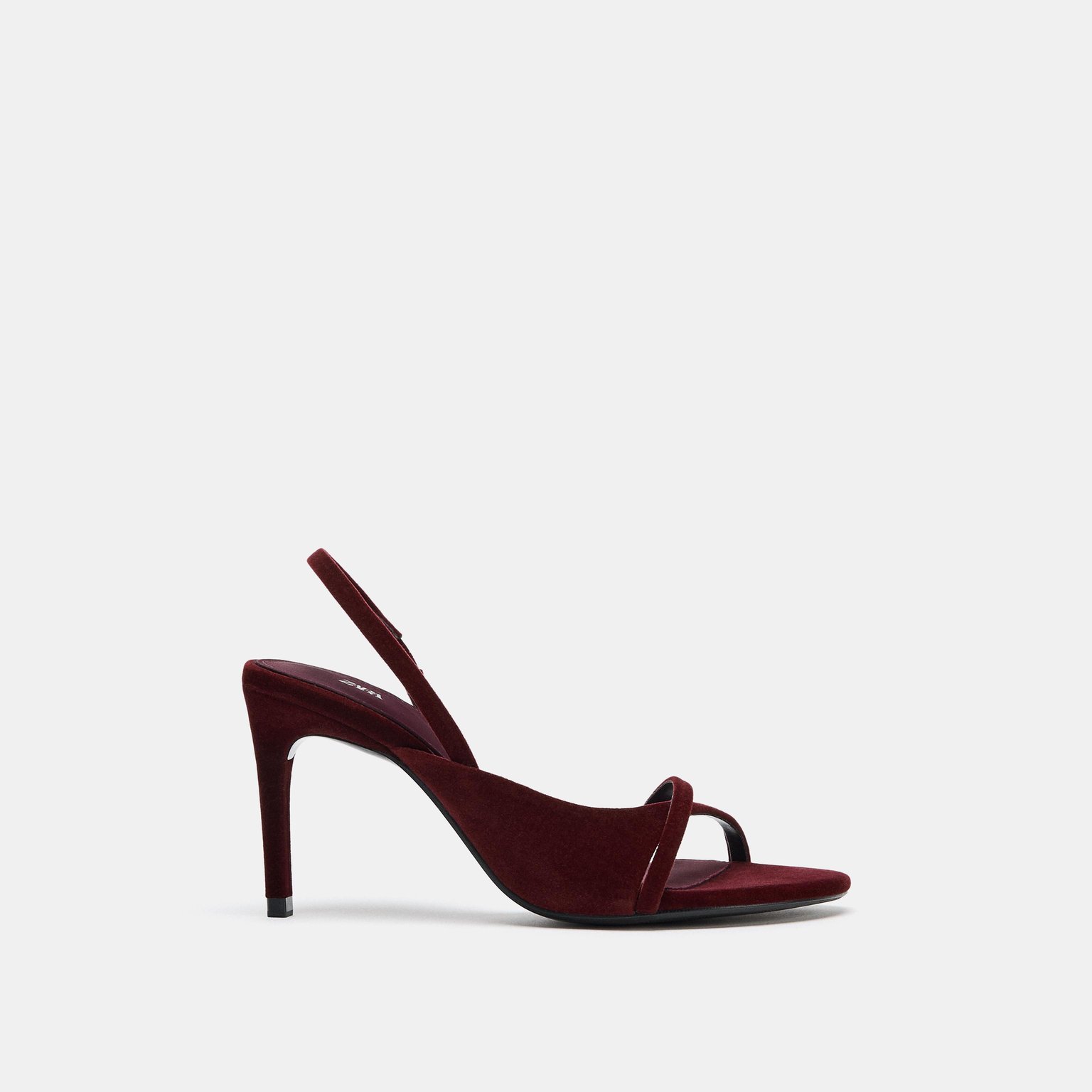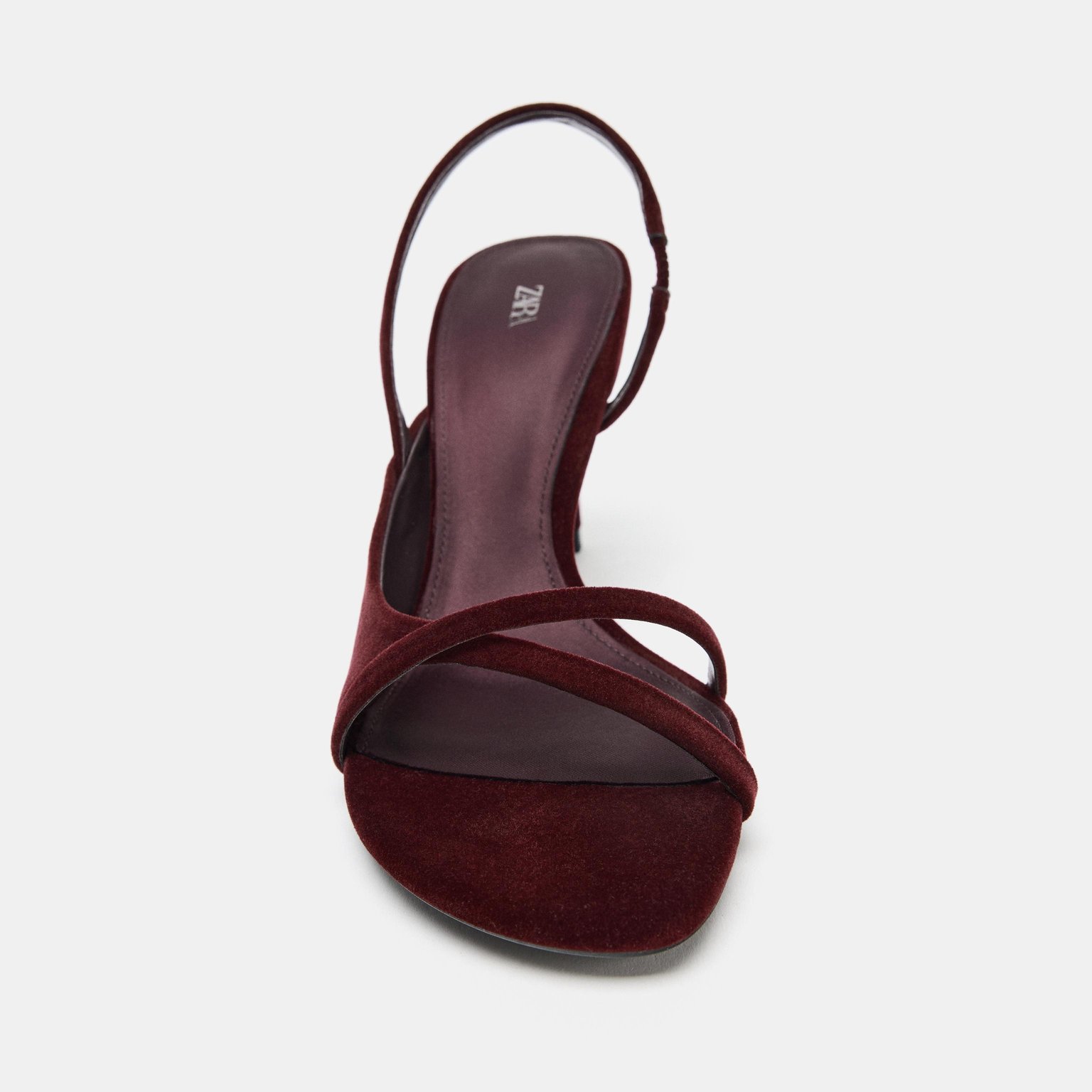 صندل بكعب عالٍ بتأثير مخملي – لون خمري – Burgundy Red (Velvet Effect Heeled Sandals) صندل أنيق بتصميم مخملي ناعم، يتميز بأربطة متقاطعة في الأمام مع فاصل إصبع يمنح ثباتًا وأناقة. يأتي بكعب رفيع ومقدمة مستديرة، إضافة إلى سير خلفي مطاطي لسهولة الارتداء. تصميمه الفاخر يجعله مناسبًا للإطلالات المسائية والمناسبات.