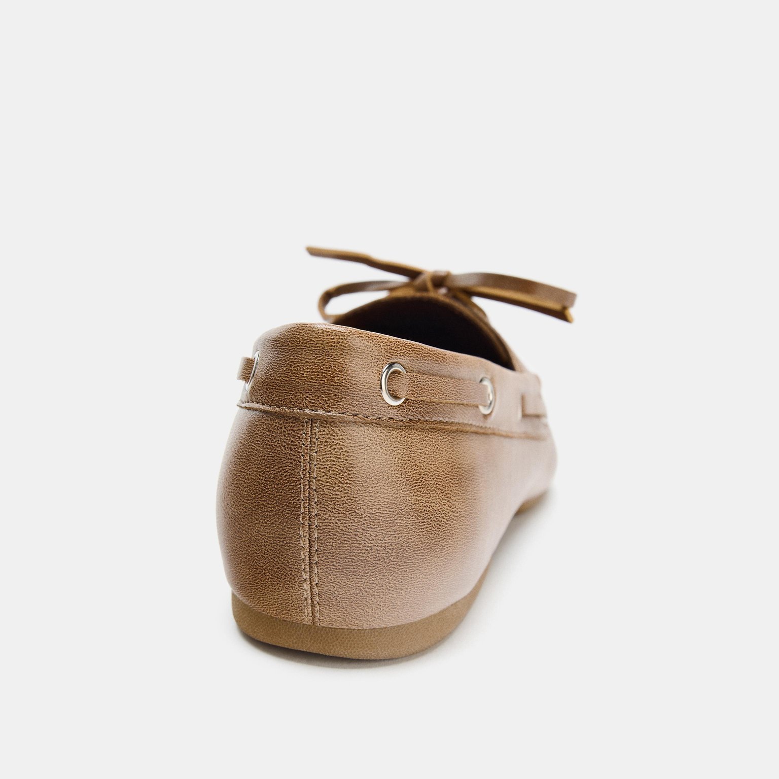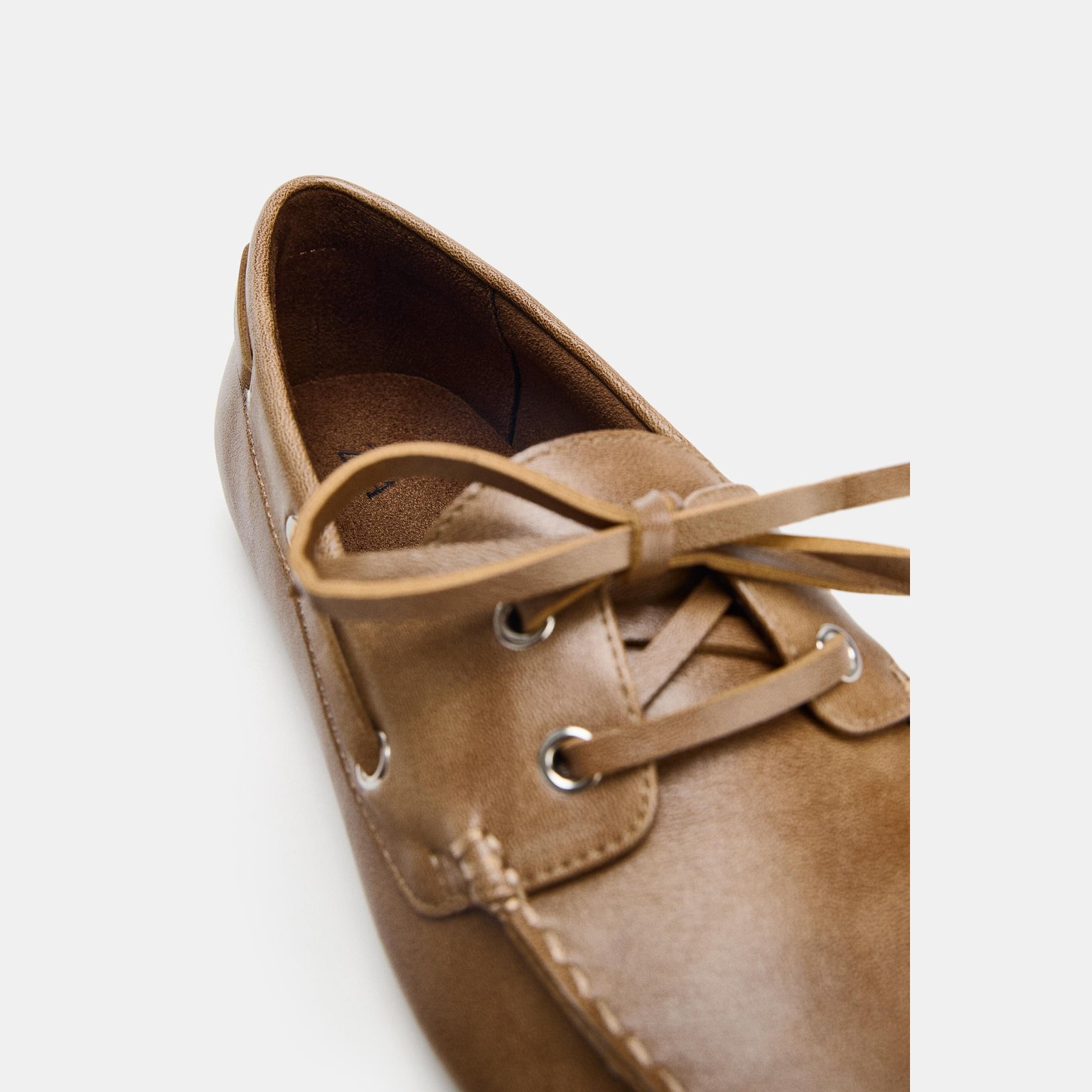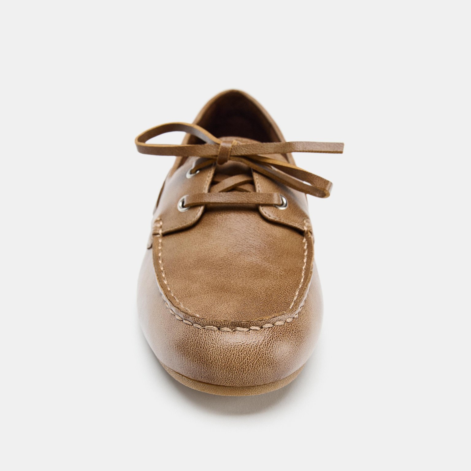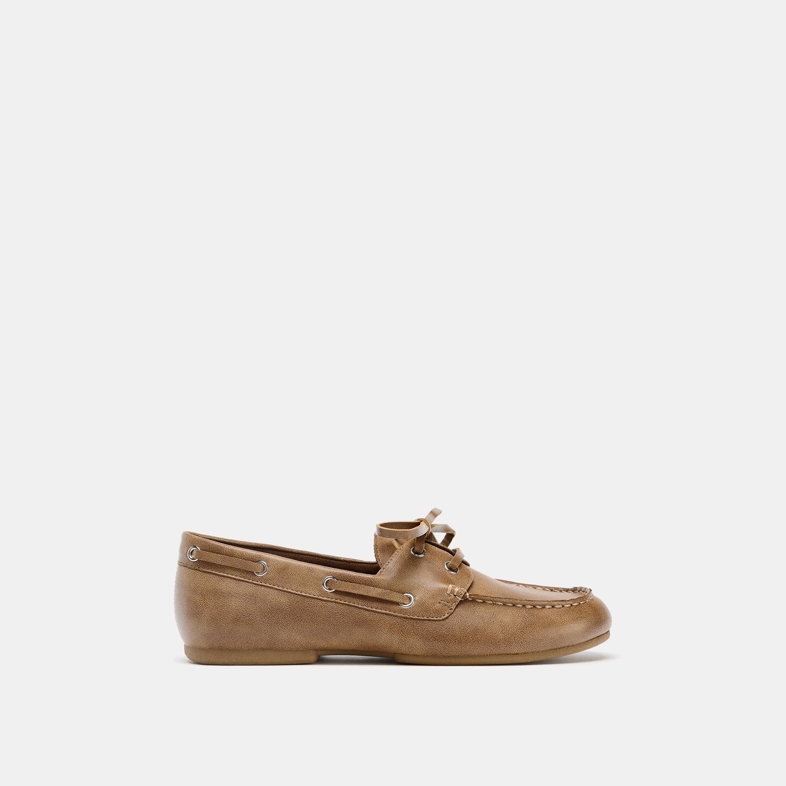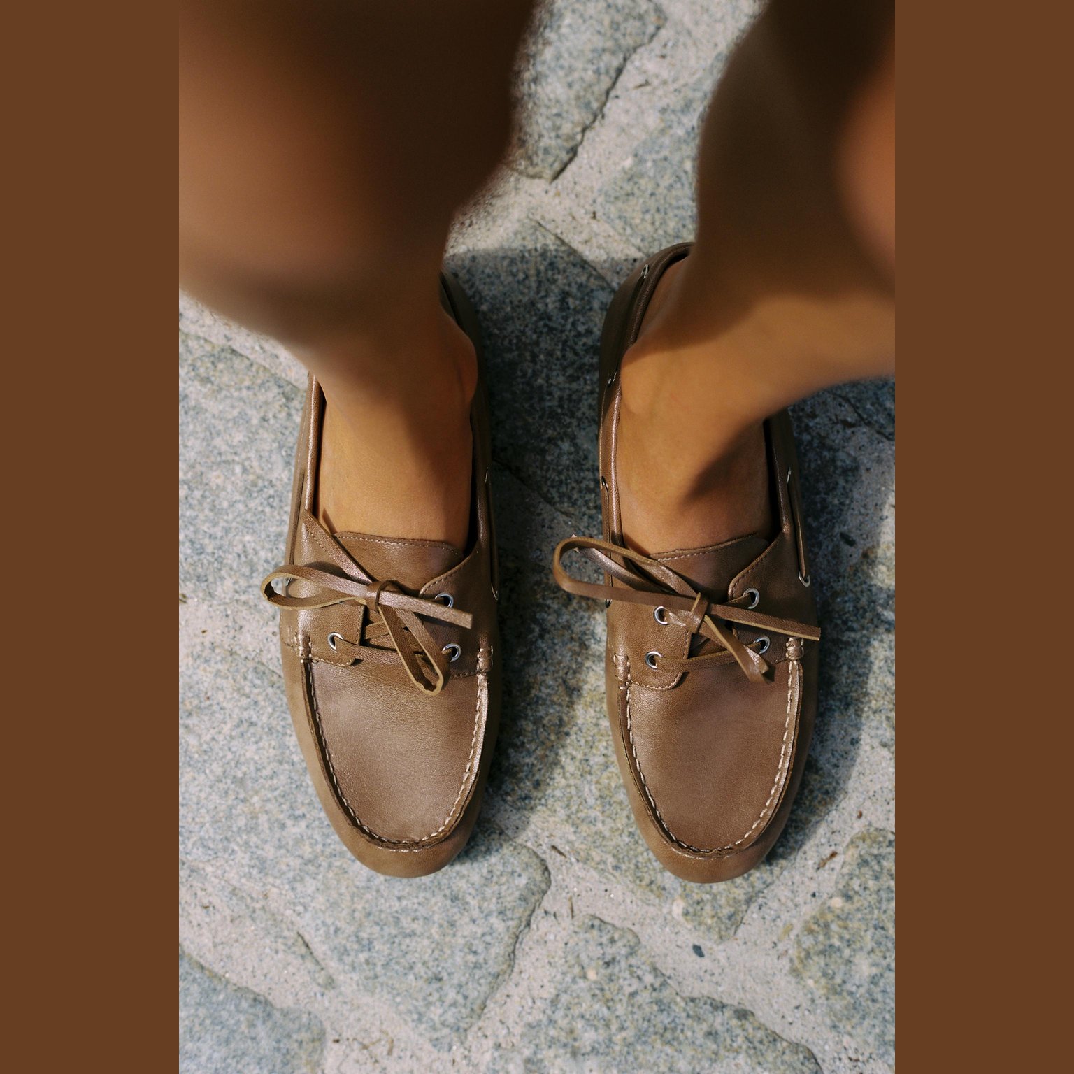 حذاء فلات برباط أمامي – لون بني – Brown (Lace‑Up Flat Shoes) حذاء فلات أنيق بتصميم مستوحى من الطابع البحري، يتميز بتجميع أمامي يمنح مظهرًا عصريًا، مع نعل متباين اللون يضيف لمسة مميزة. يأتي برباط أمامي للإغلاق وثبات أفضل، مما يجعله مناسبًا للإطلالات اليومية والكاجوال.