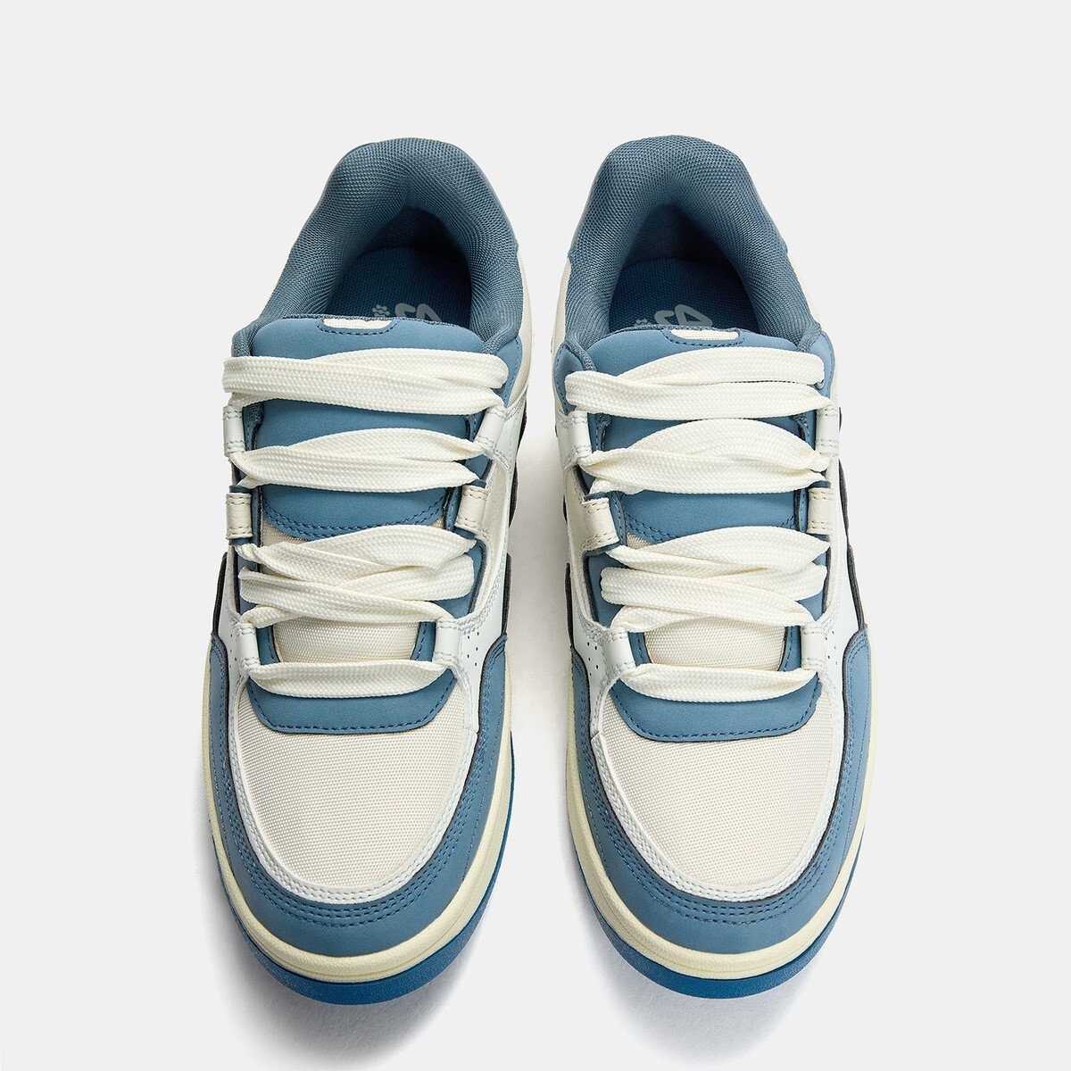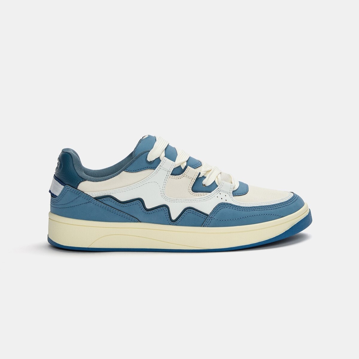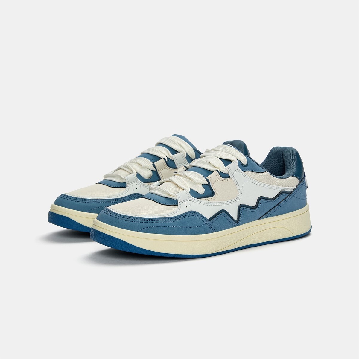 ارتقِ بإطلالتك اليومية مع هذا الحذاء الرياضي من Pull & Bear، المصمم بأسلوب سكايت عصري يجمع بين الجلد الطبيعي وخامة Rugan اللامعة. يأتي بلون أزرق أنيق مع نعل سميك بارتفاع 3.5 سم، ويمنحك راحة فائقة بفضل النعل الداخلي OrthoLite® المصنوع من الجلد الأصلي.