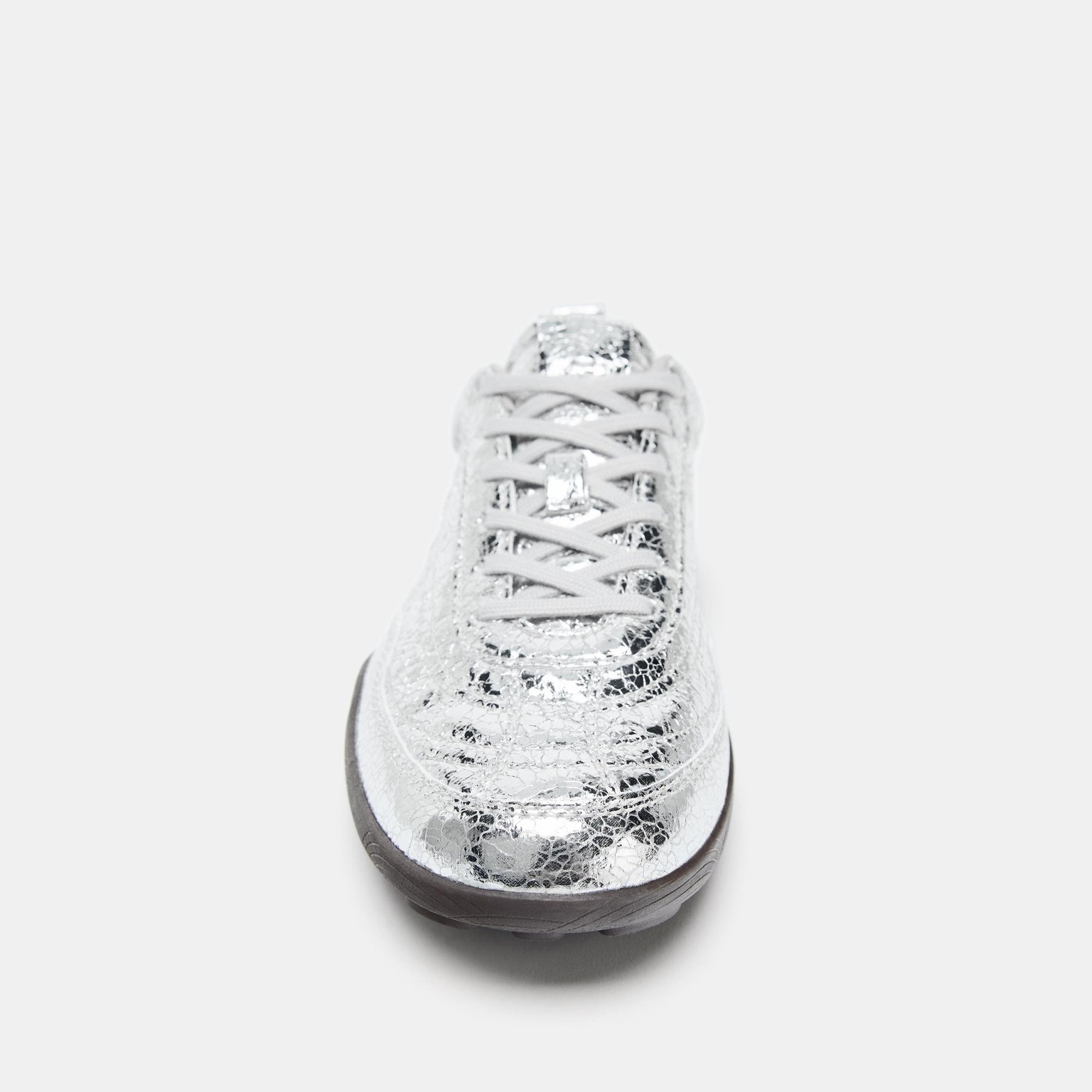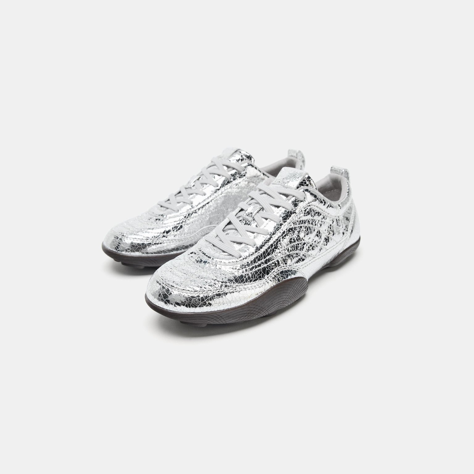 حذاء رياضي بتأثير معدني – لون فضي – Silver (Metallic‑Effect Trainers) حذاء رياضي عصري بتصميم لامع بتأثير معدني يمنح مظهرًا جريئًا ومميزًا. يتميز بخياطات متباينة ونعل مريح، مع لسان خلفي لسهولة الارتداء. تصميمه اللافت يجعله خيارًا مثاليًا للإطلالات اليومية والكاجوال التي تحتاج لمسة مختلفة.