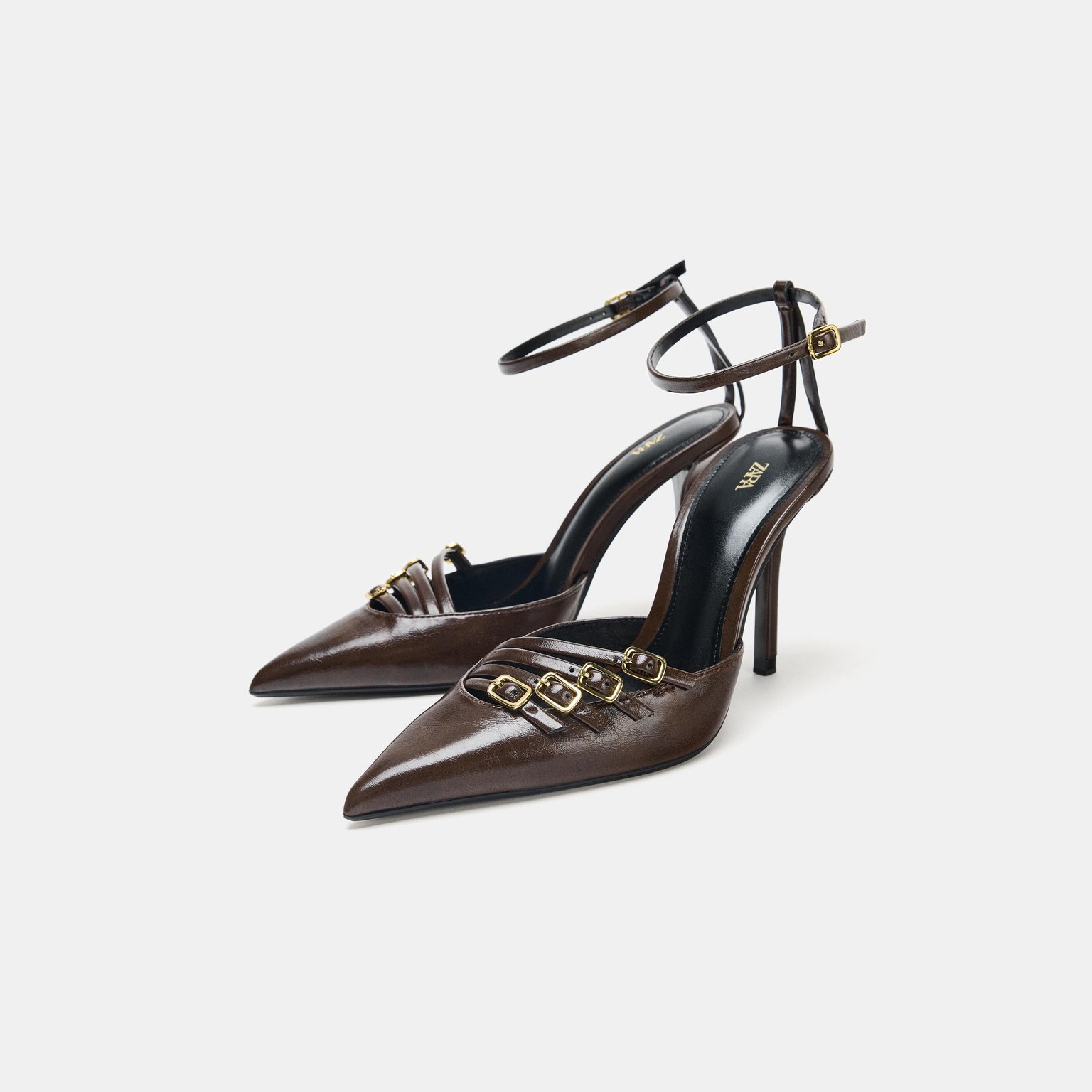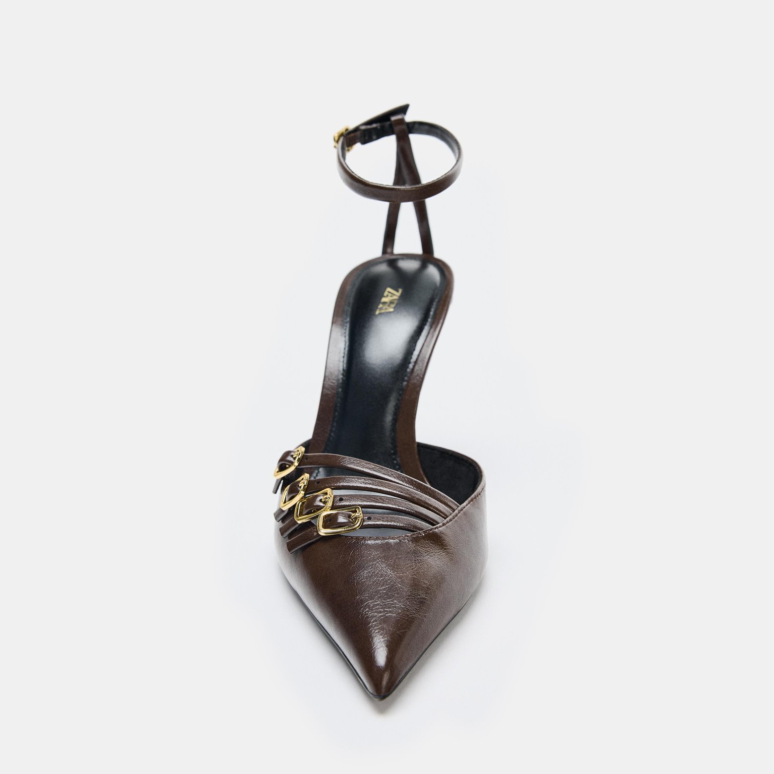 حذاء بكعب عالٍ مع إبزيم أمامي – لون بني – Brown (Buckled High‑Heel Shoes) حذاء أنيق بتصميم عصري، يتميز بأحزمة أمامية مع إبزيم معدني يمنح مظهرًا راقيًا. يأتي بسير حول الكاحل لثبات أفضل، مع كعب رفيع ومقدمة مدببة تضيف لمسة أنثوية جذابة. تصميمه الفاخر يجعله مناسبًا للإطلالات المسائية والرسمية.