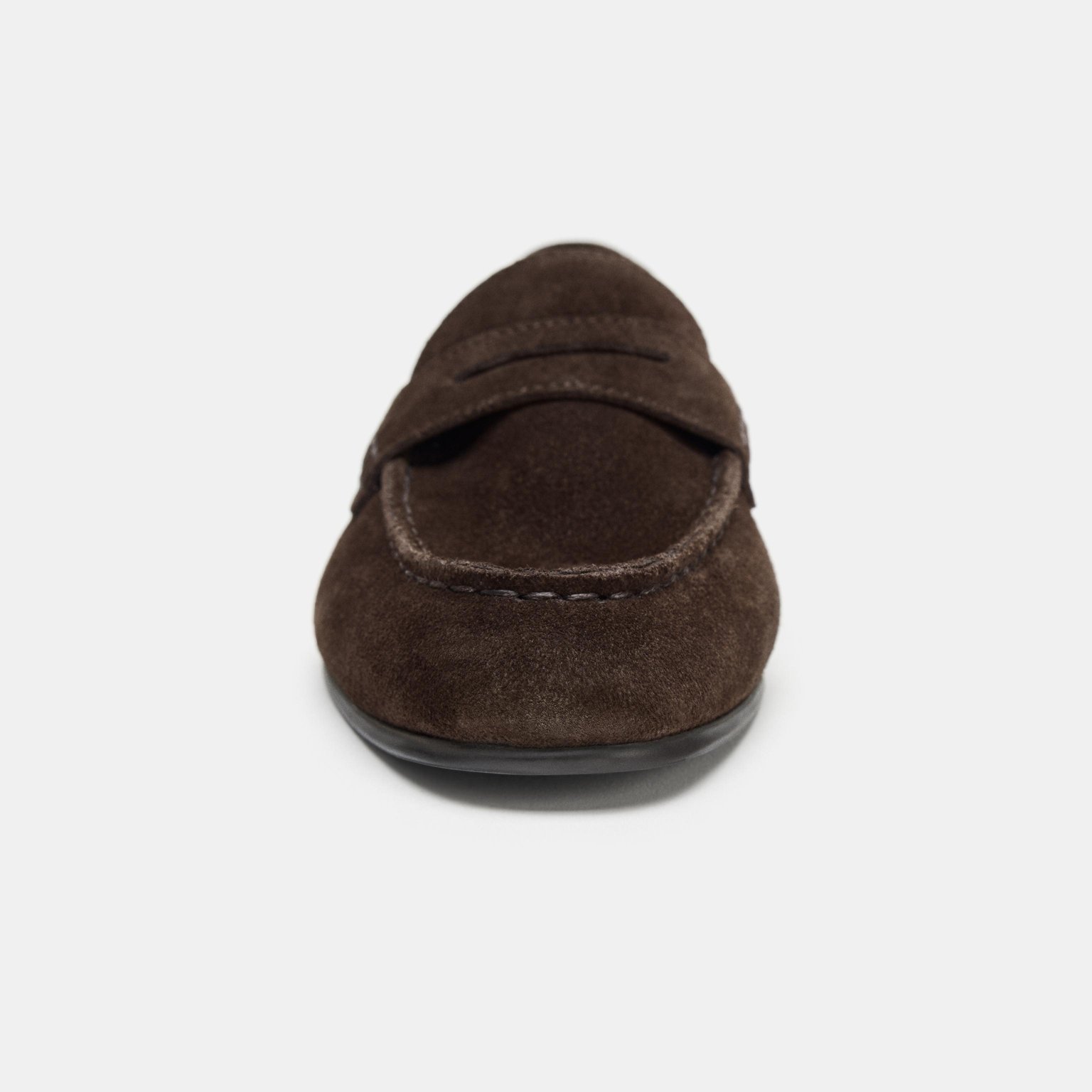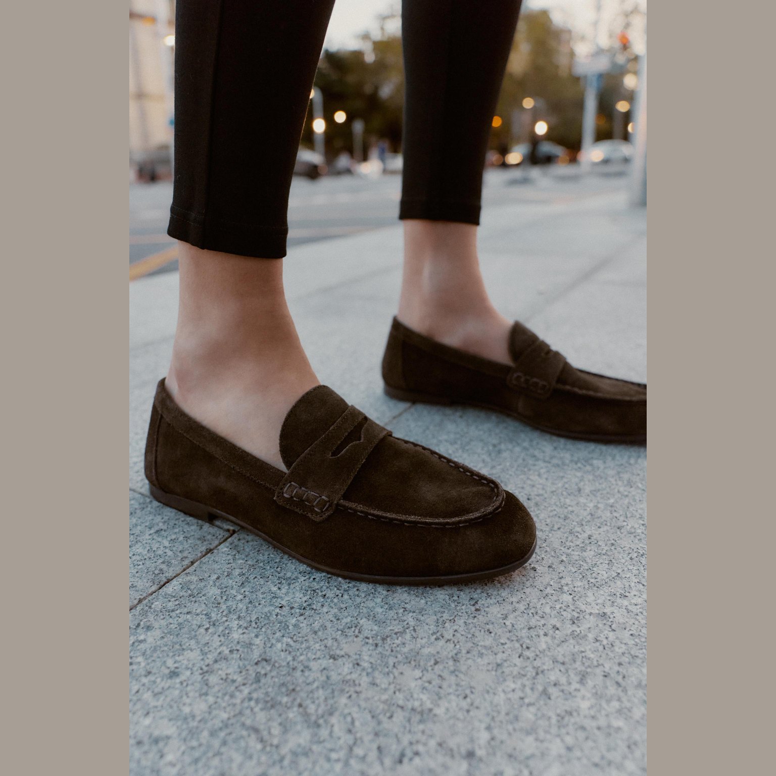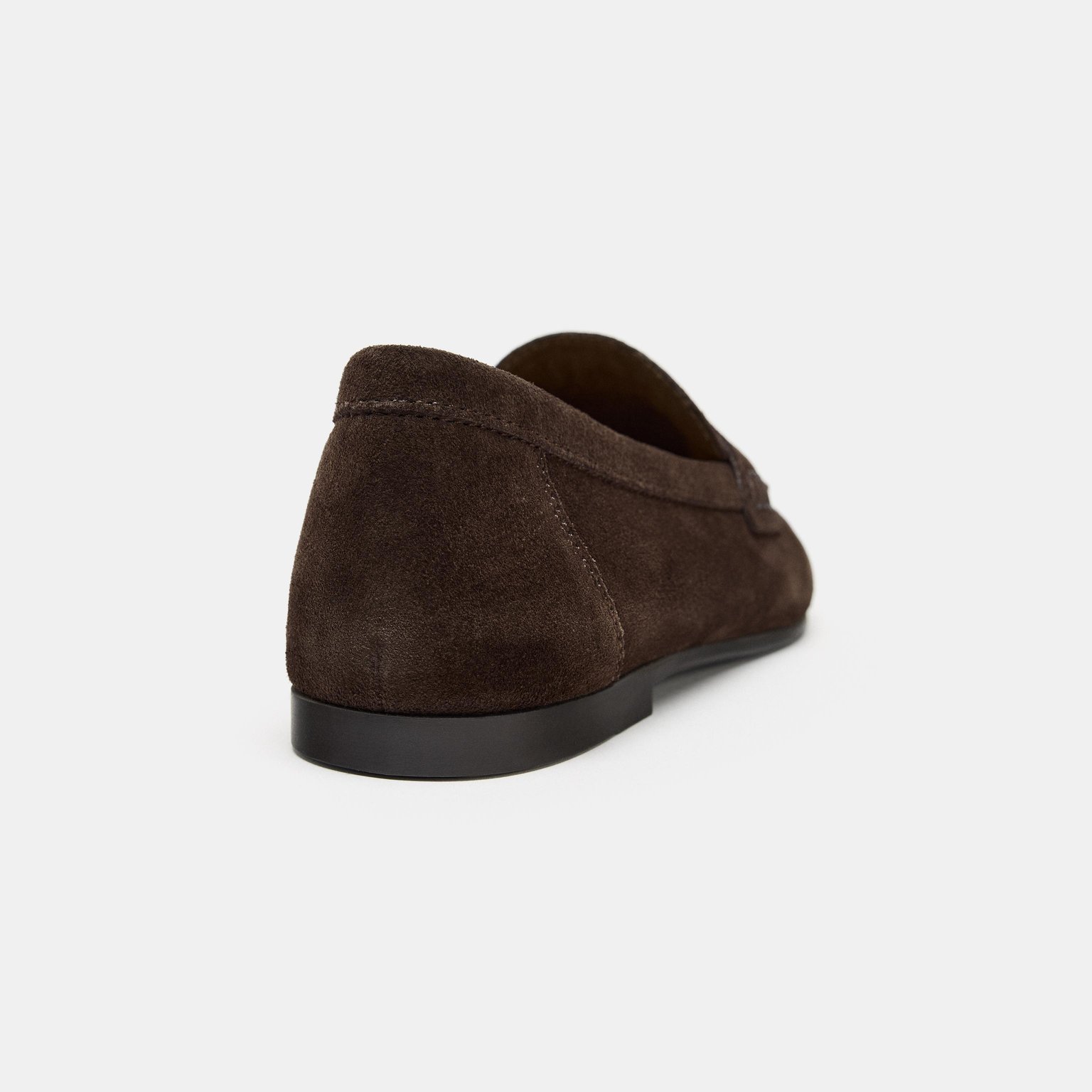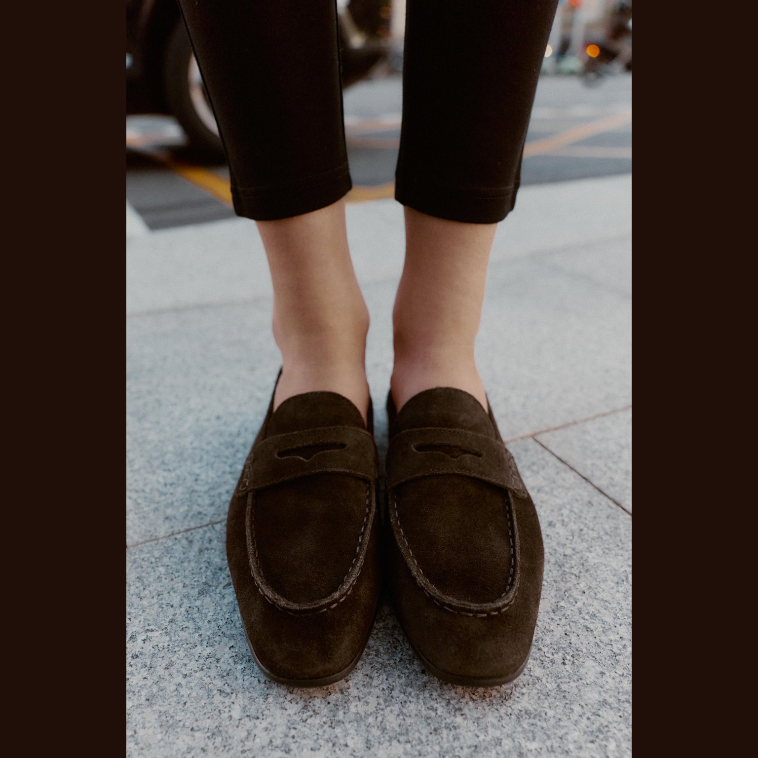 لوفر من الشمواه مع خياطة علوية – لون بني شوكولاتة – Chocolate Brown (Topstitched Split Suede Loafers) لوفر أنيق بتصميم كلاسيكي من الشمواه الطبيعي، يتميز بخياطات علوية بارزة تضيف لمسة فاخرة، مع شريط أمامي بتفصيلة البيني التقليدية. يأتي بمقدمة مستديرة ونعل مريح، مما يجعله خيارًا مثاليًا للإطلالات اليومية والكاجوال الراقية.