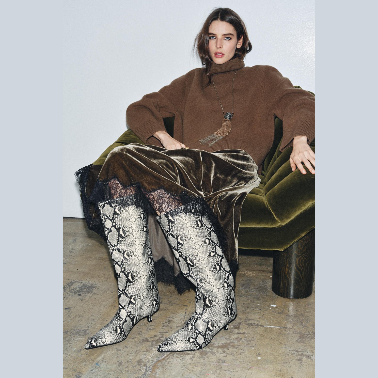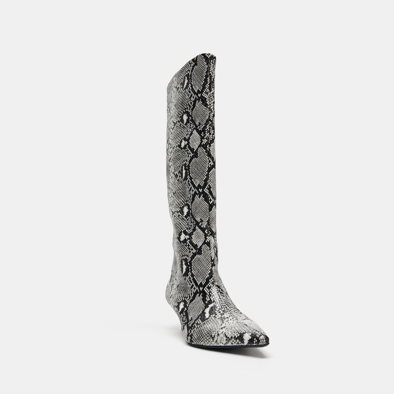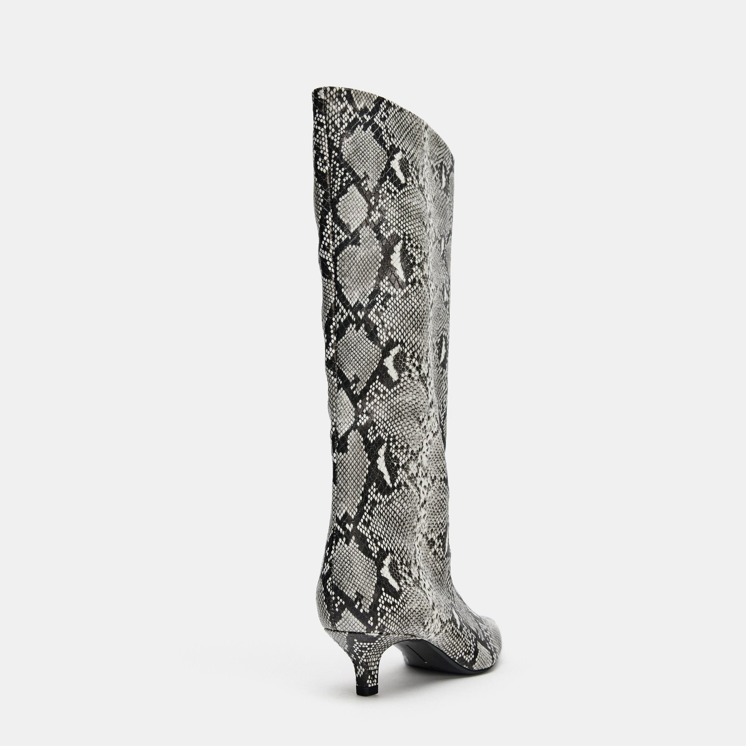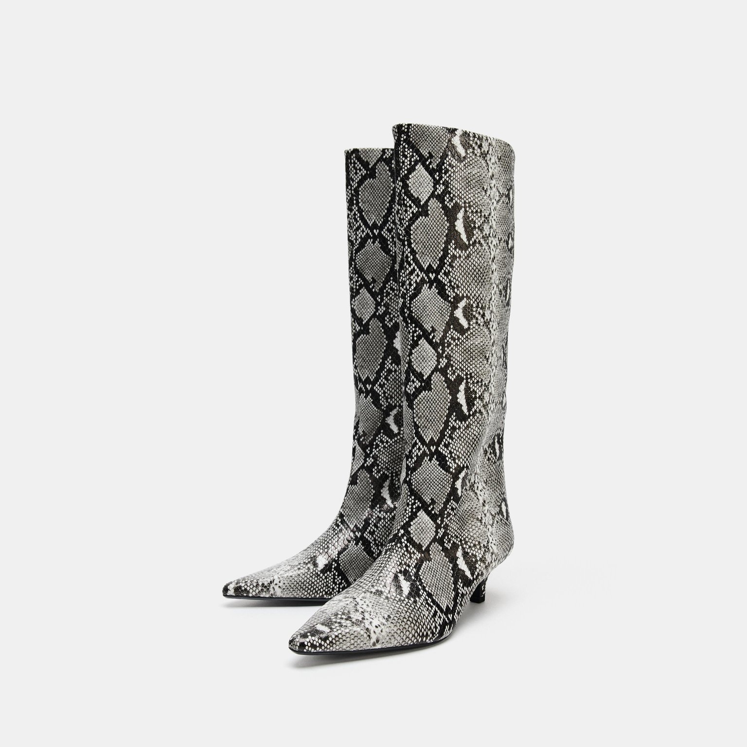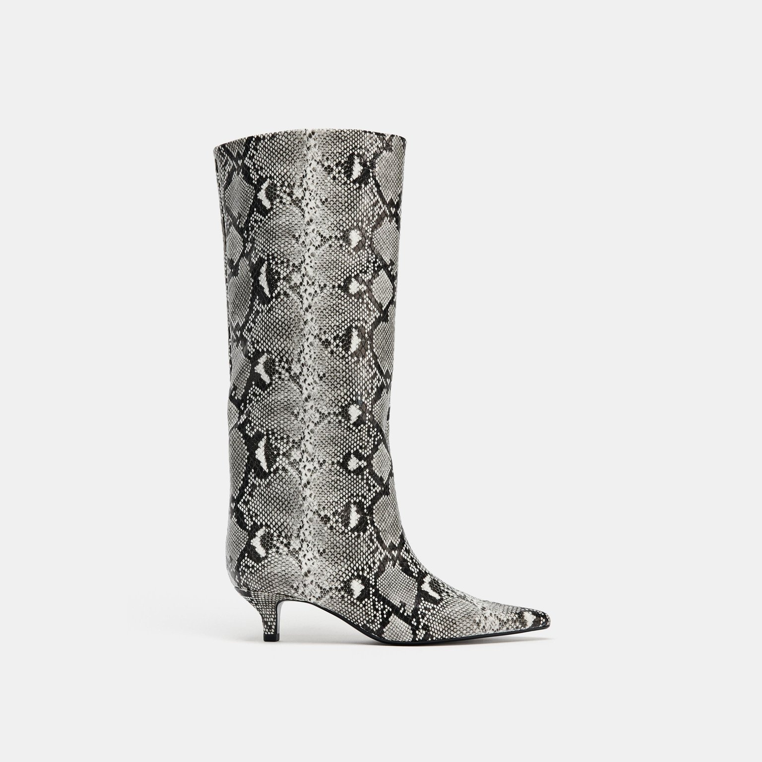 بوت بكعب منخفض بطبعة حيوانية – نقشة جلد الثعبان – Snakeskin (Animal Print Heel Boots) بوت أنيق بتصميم عصري بطبعة جلد الثعبان يمنح مظهرًا جريئًا ولافتًا. يتميز بقصة تصل إلى منتصف الساق مع مقدمة مدببة وكعب صغير يمنح توازنًا مثاليًا بين الراحة والأناقة. تصميمه السهل بالارتداء يجعله خيارًا مثاليًا للإطلالات اليومية والكاجوال الراقية.
