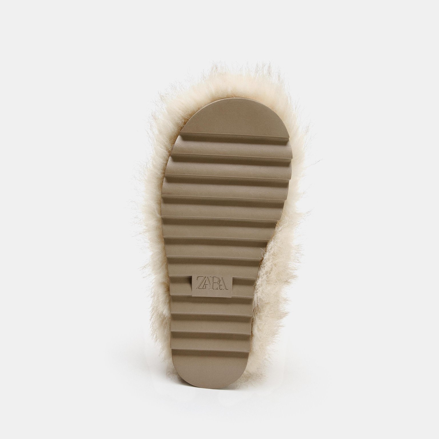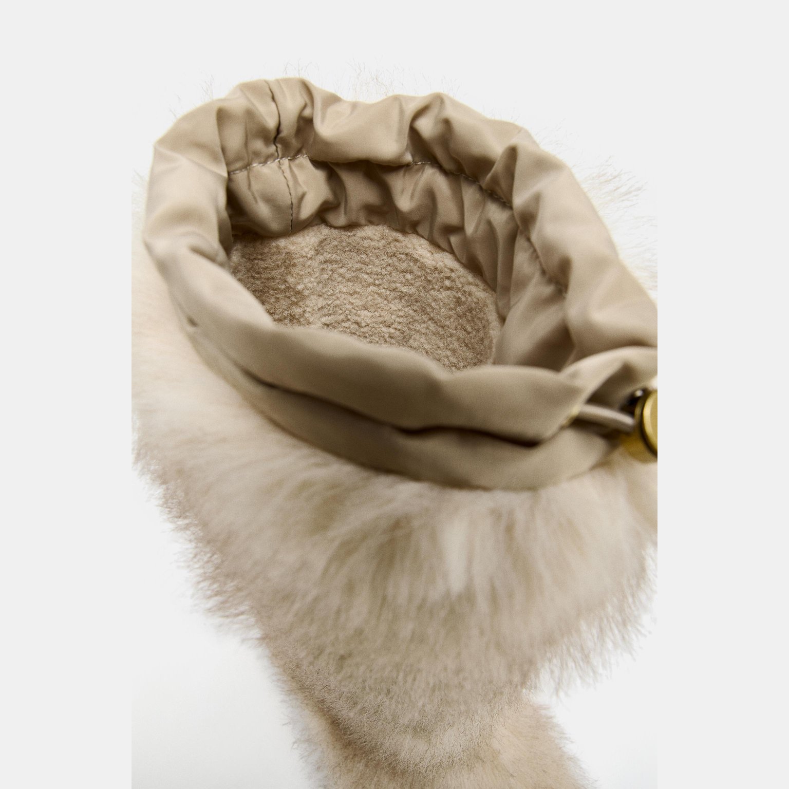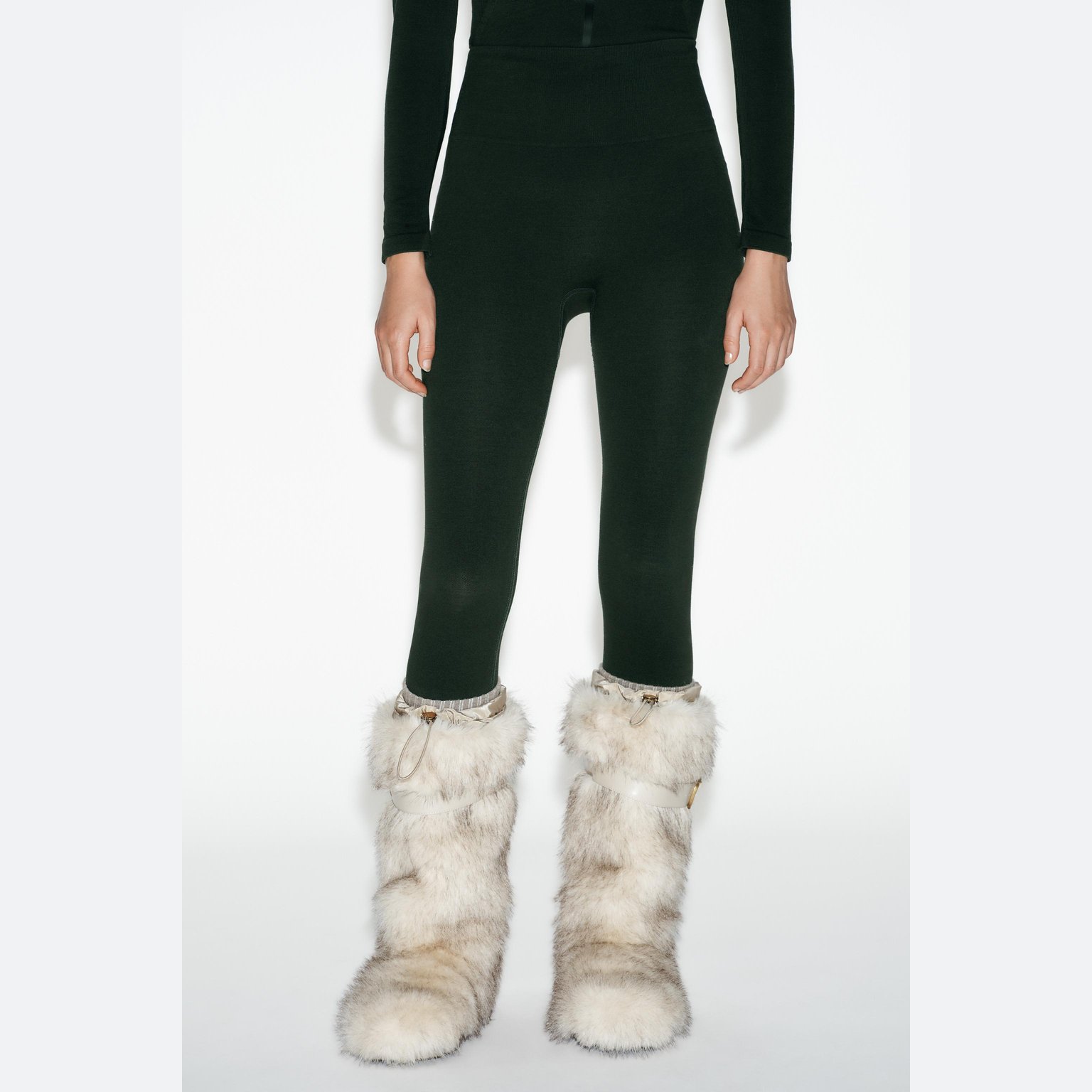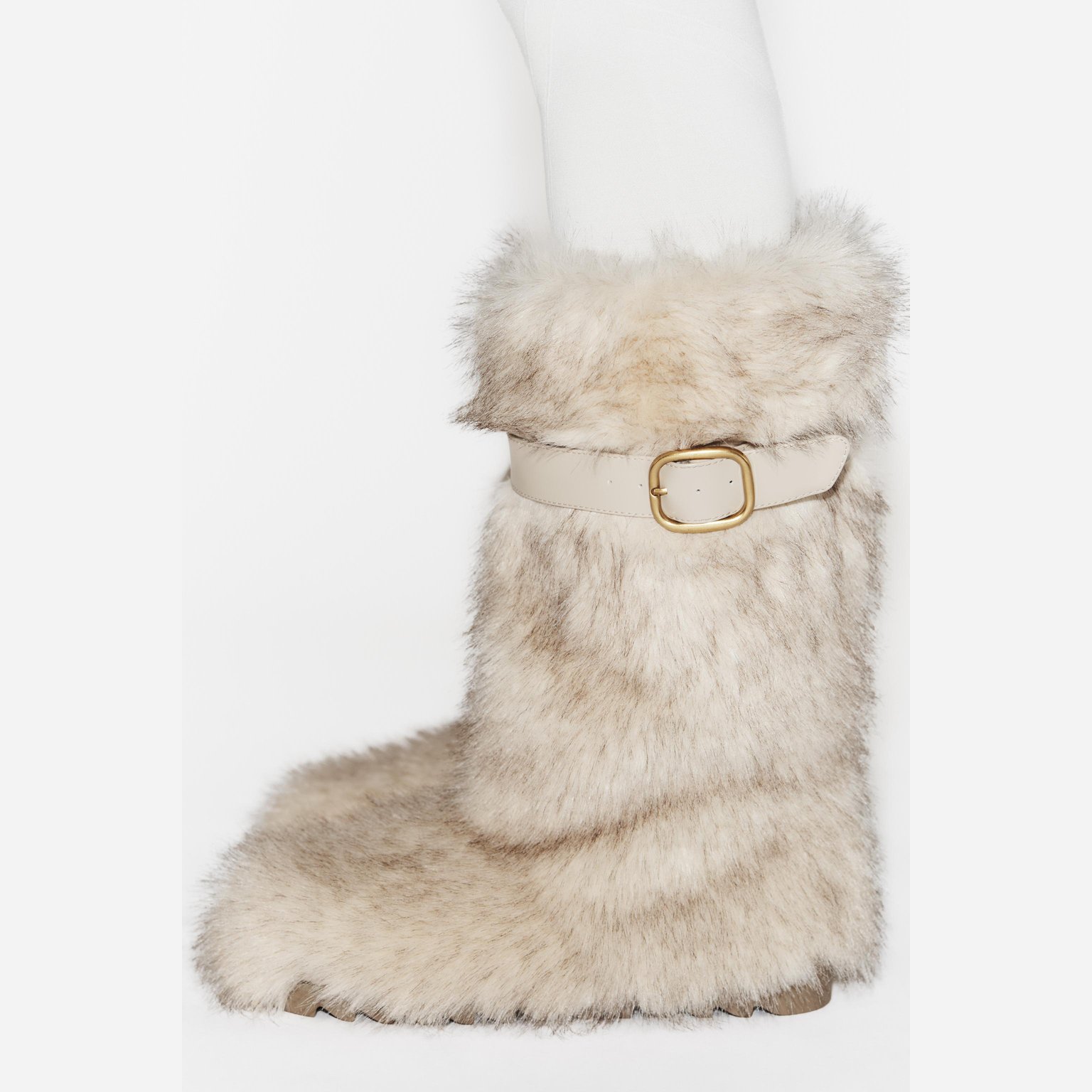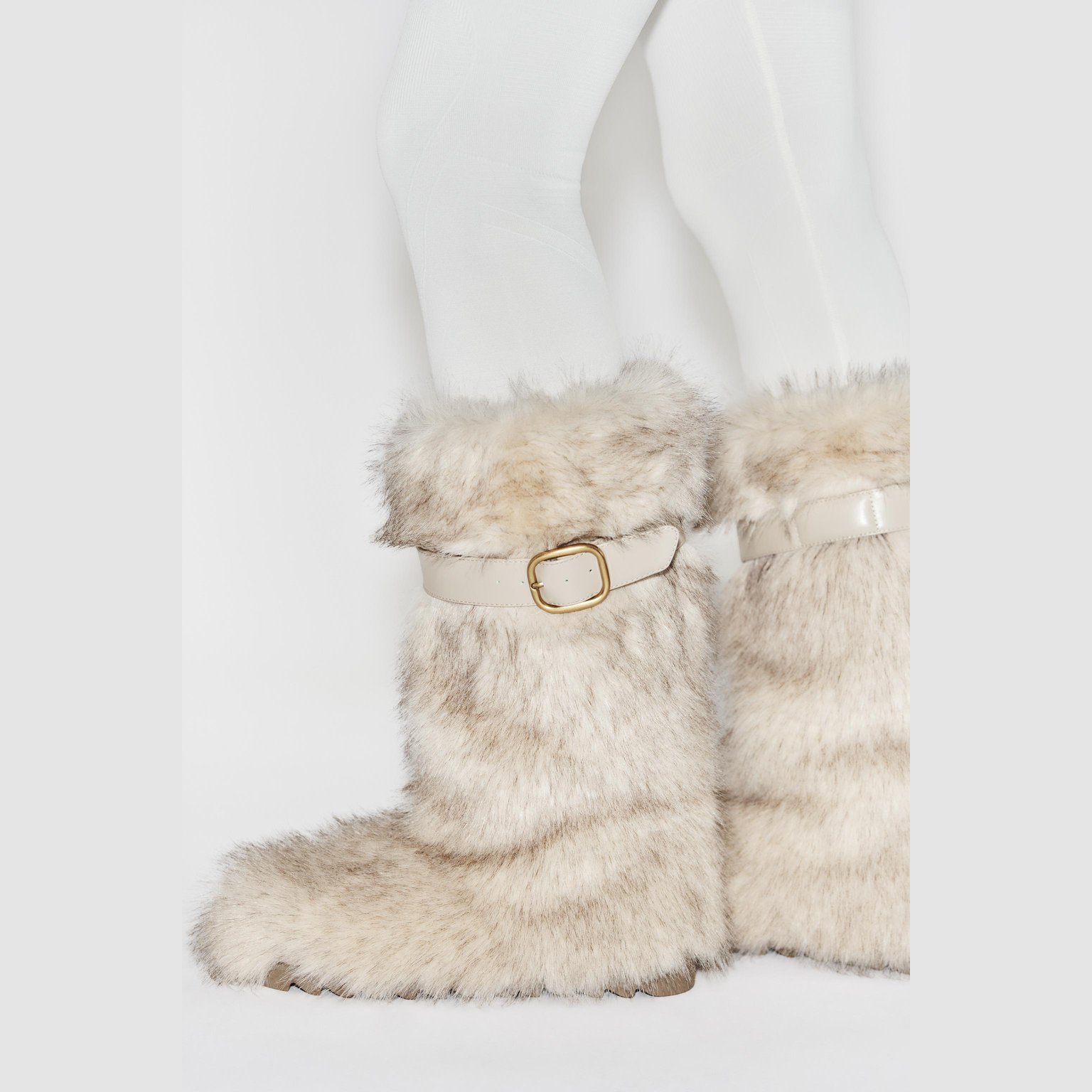 بوت فرو صناعي بتصميم سكّي – لون أبيض عاجي – Ecru White (Faux Fur Boots with Strap – Ski Collection) بوت دافئ بتصميم مستوحى من أحذية التزلج، مصنوع من فرو صناعي ناعم مع بطانة شيرلين تمنح دفئًا وراحة فائقة. يتميز بحزام على الساق مع إبزيم معدني ولمسة عملية بفضل الإغلاق المطاطي العلوي. تصميمه العصري يجعله خيارًا مثاليًا للأجواء الباردة والإطلالات الشتوية.