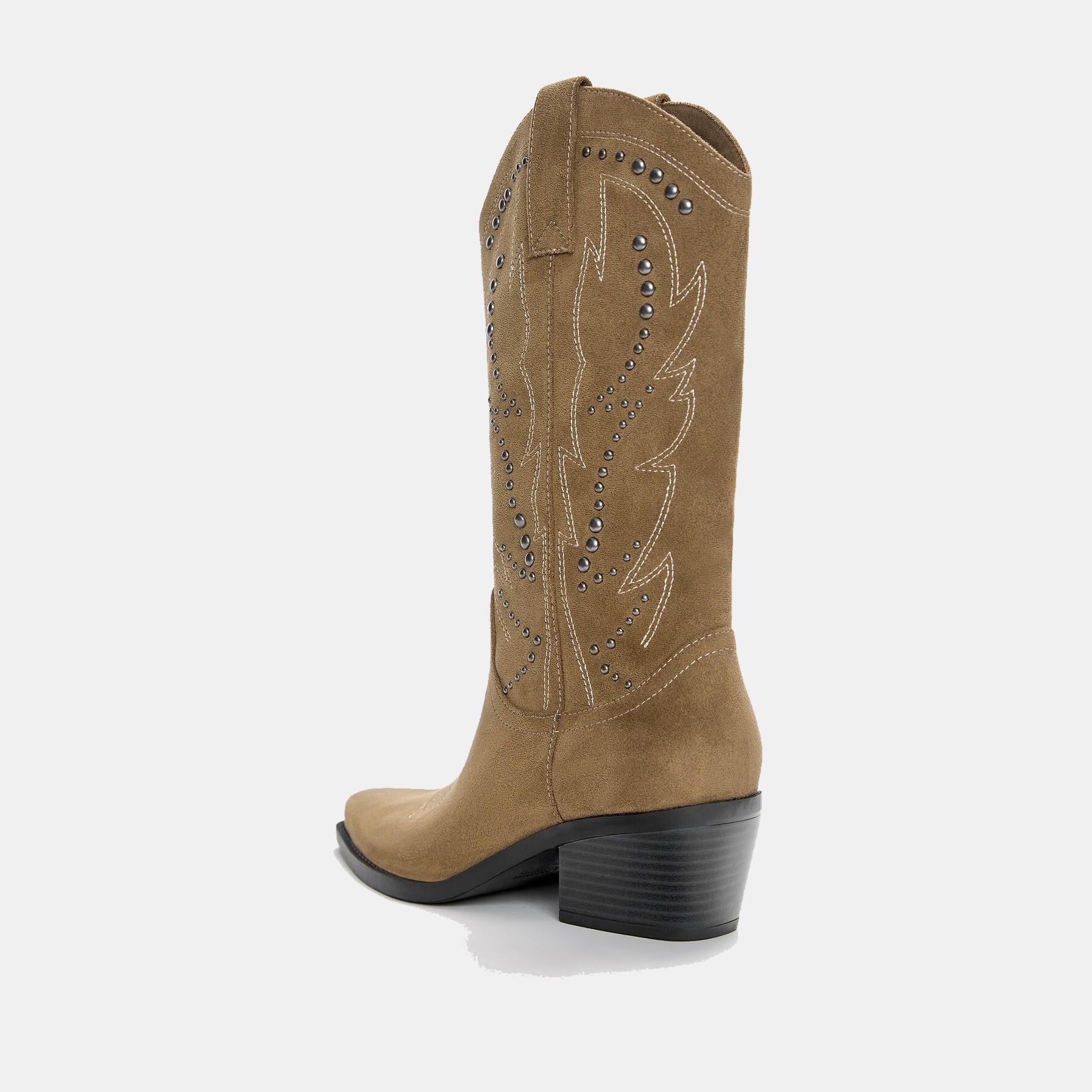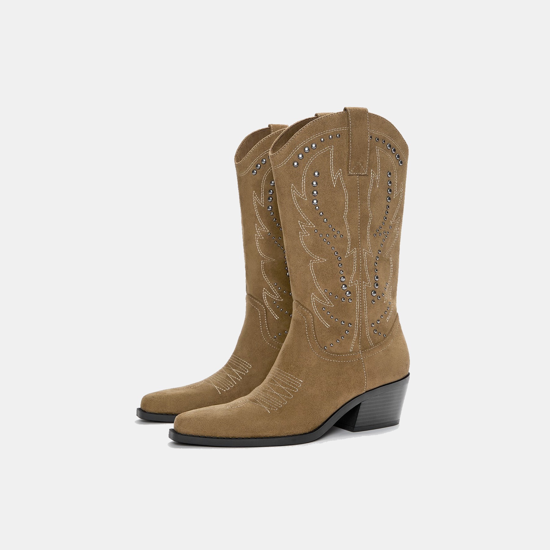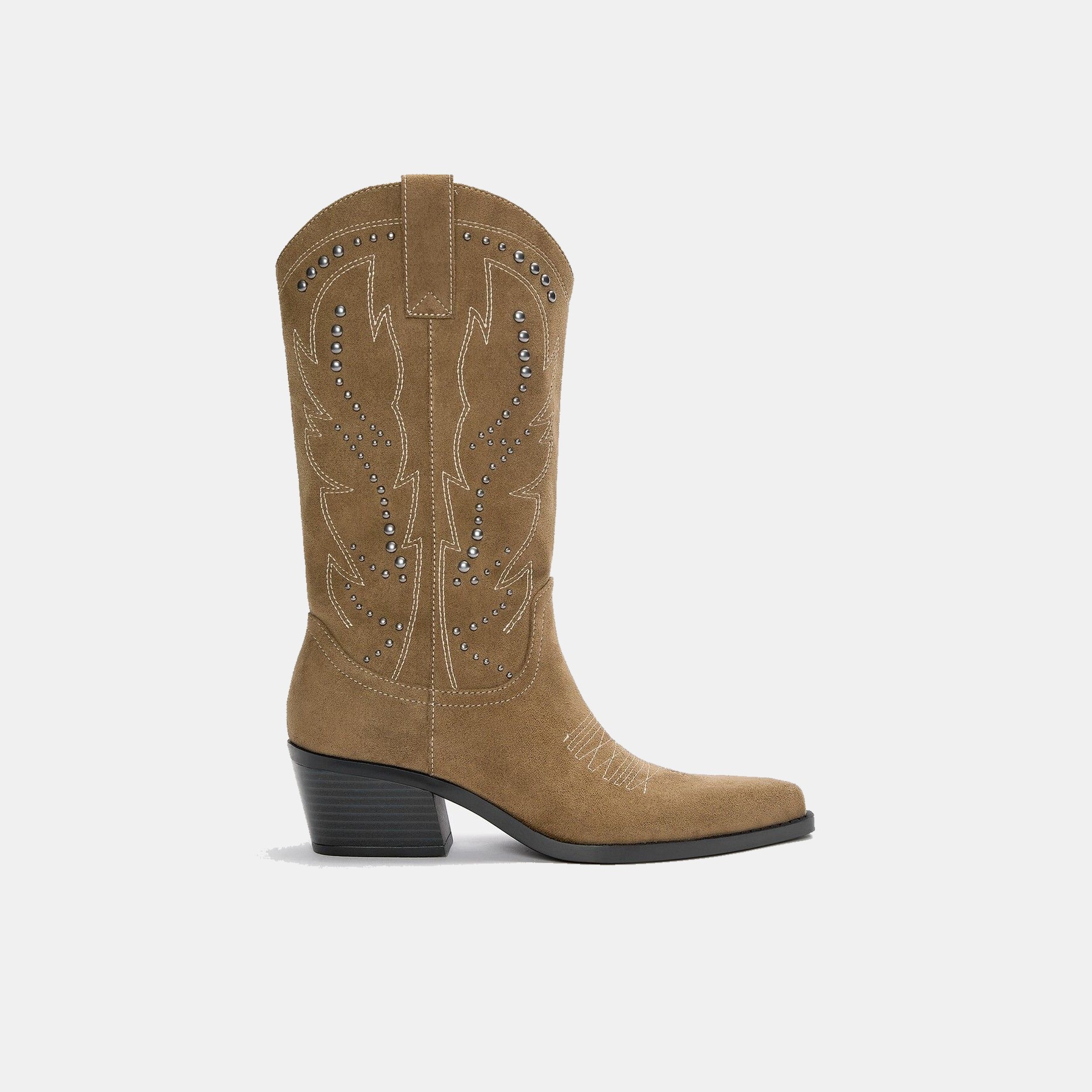 Pull & Bear – جزمة نسائية بتصميم كاوبوي مزينة بزِمب وكعب متوسط بلون بني