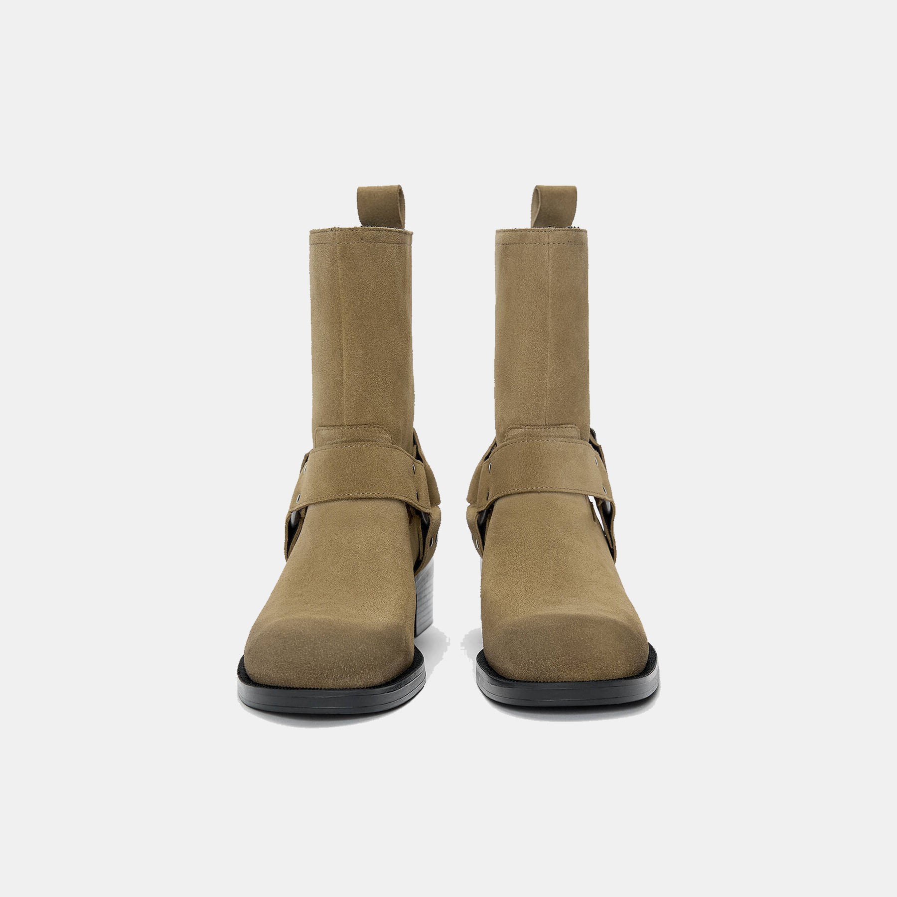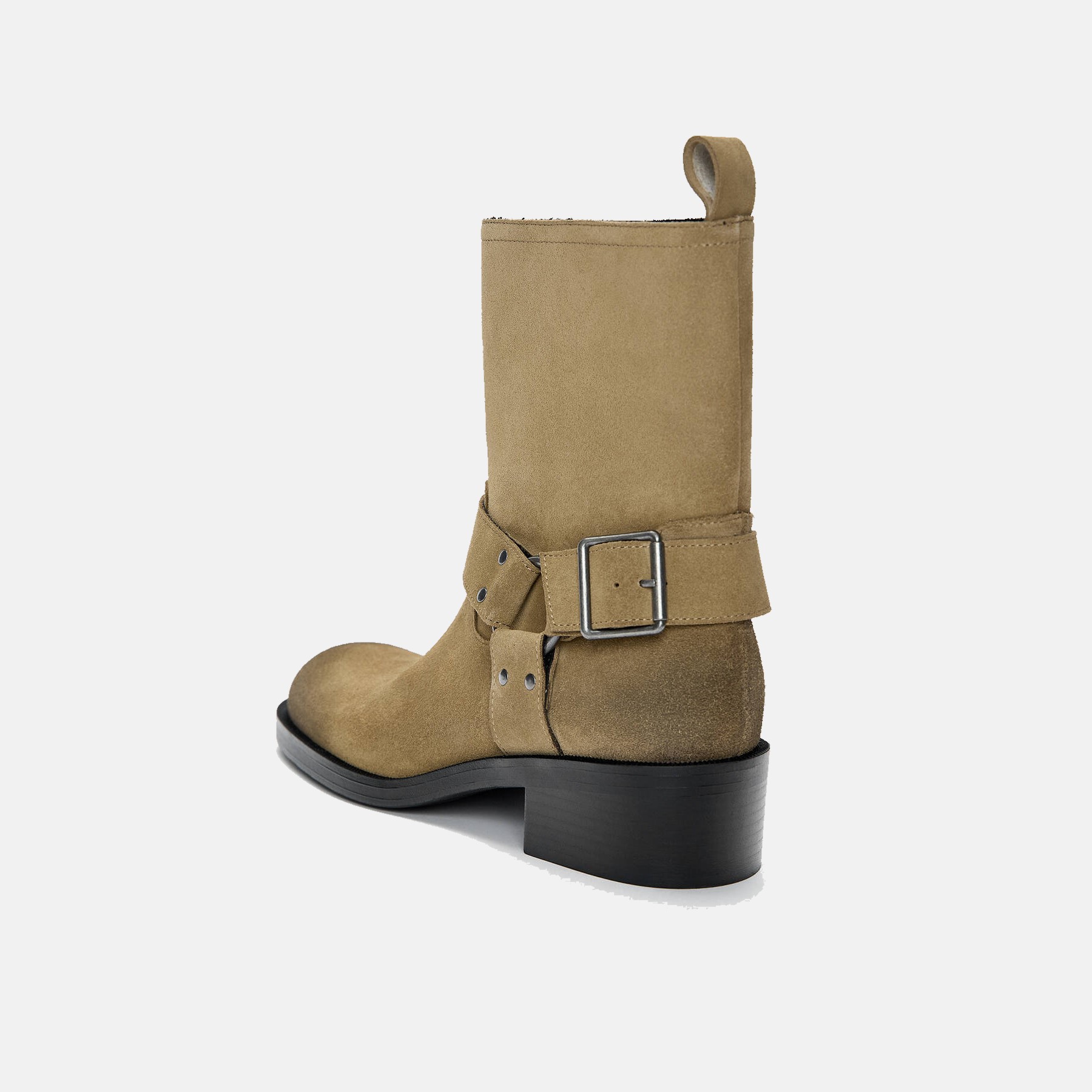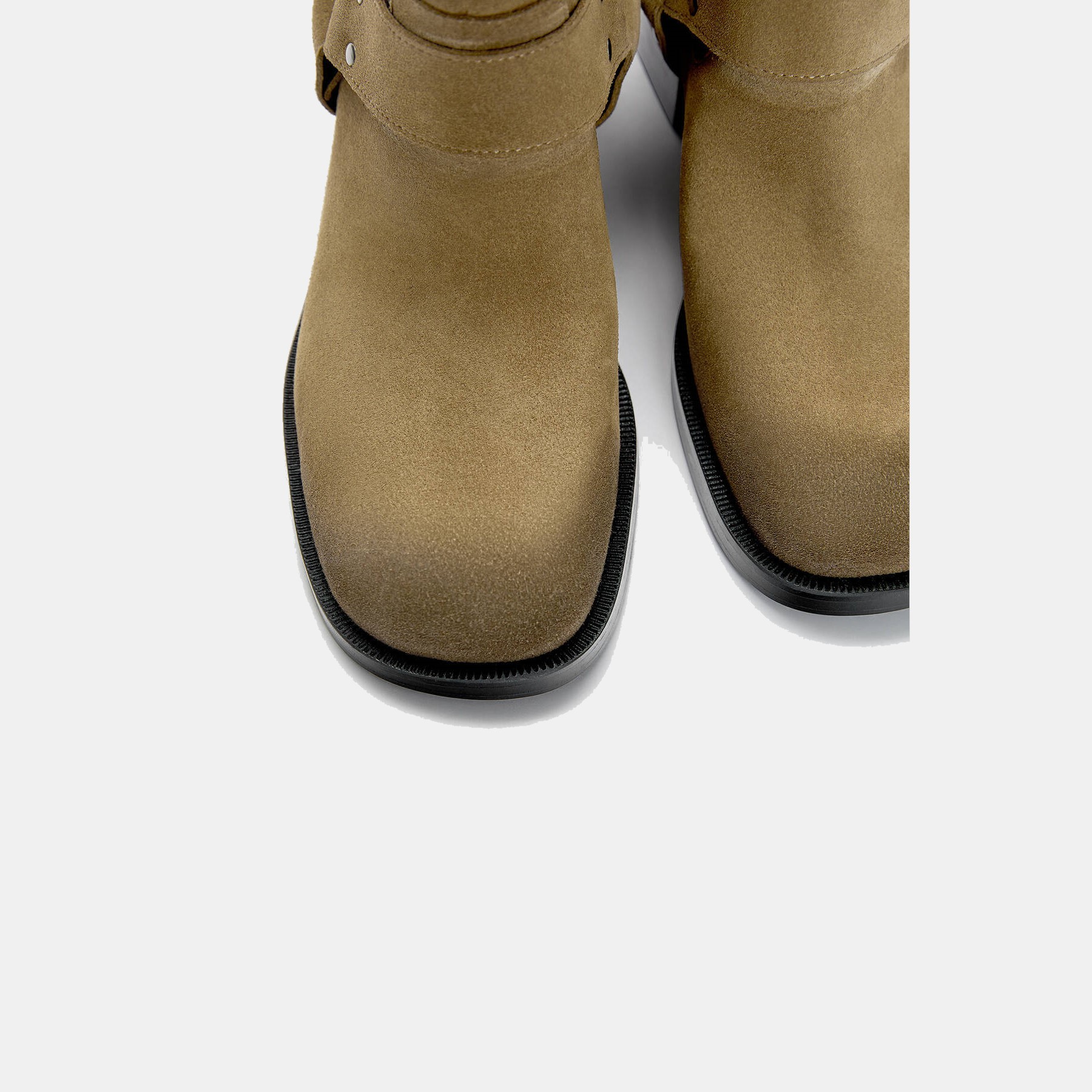 Pull & Bear – بوت نسائي Biker من الجلد الطبيعي بتصميم سويدي وكعب متوسط بلون بيج