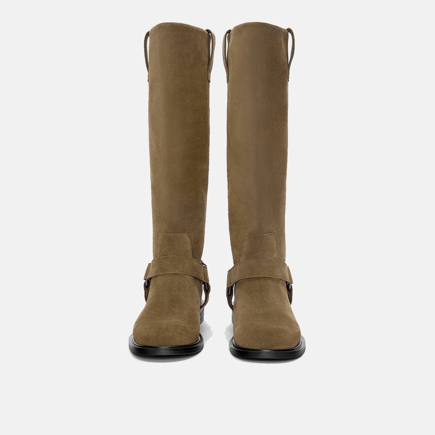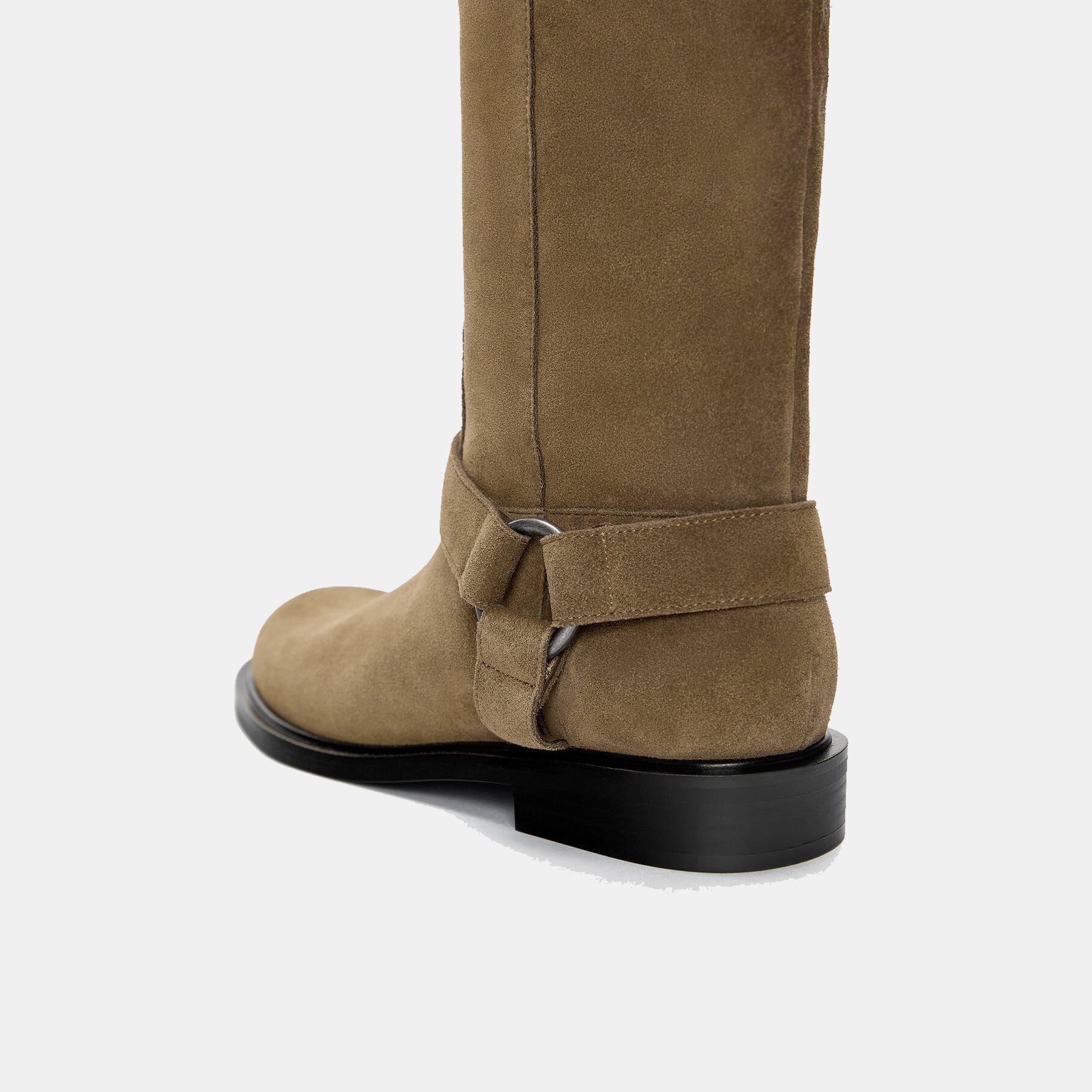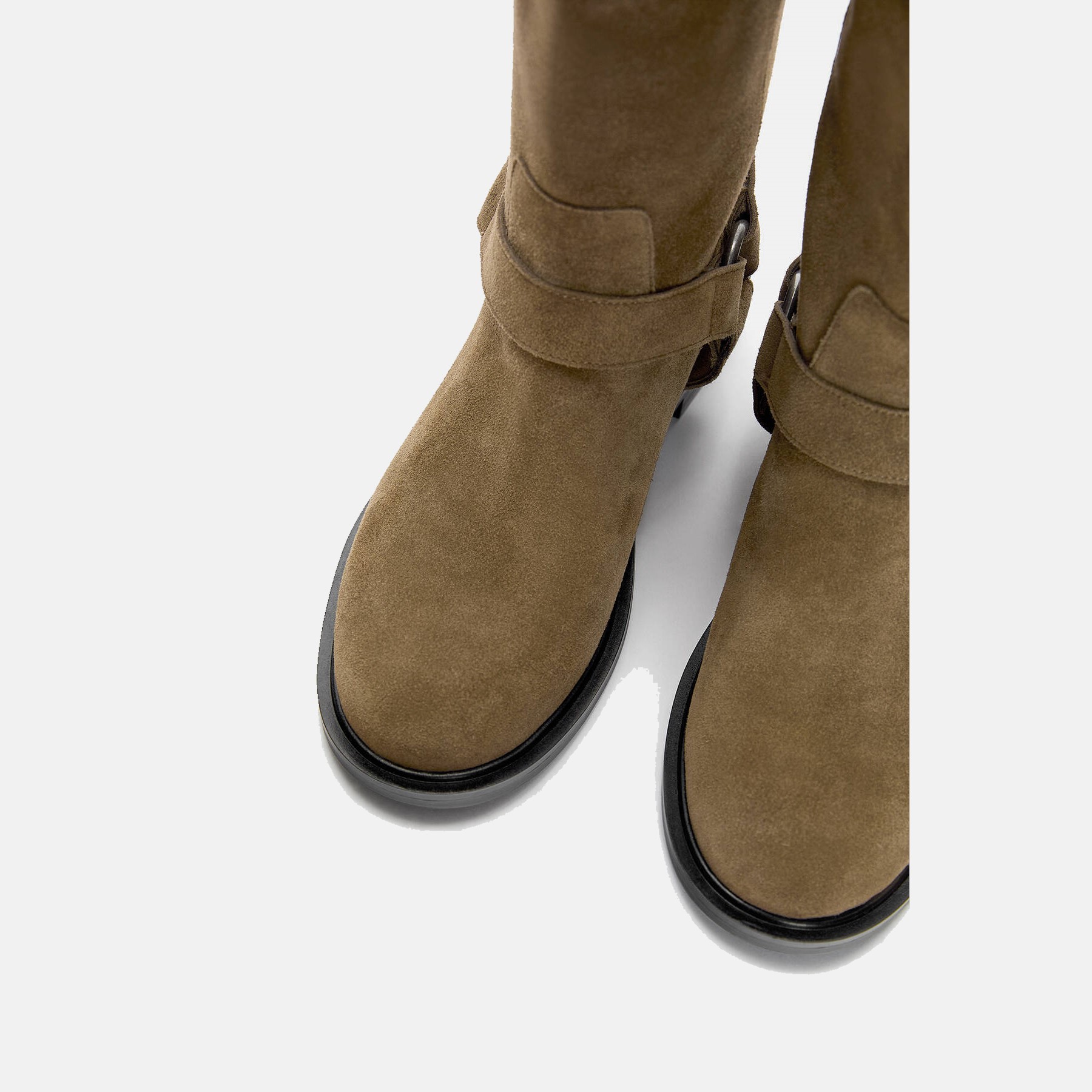Pull & Bear – بوت نسائي Biker من الجلد الطبيعي بكعب منخفض وتفاصيل معدنية بلون بني سويدي