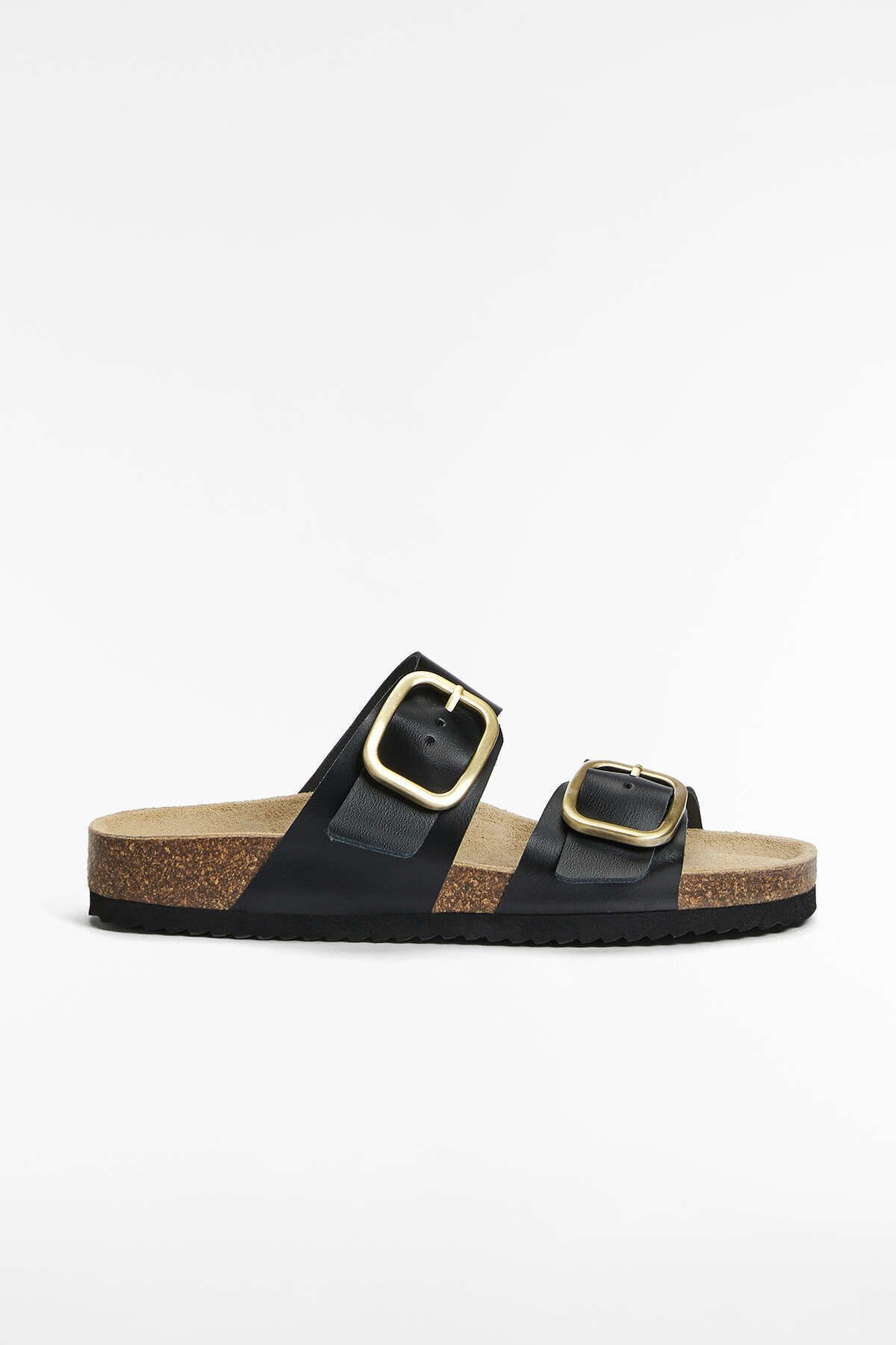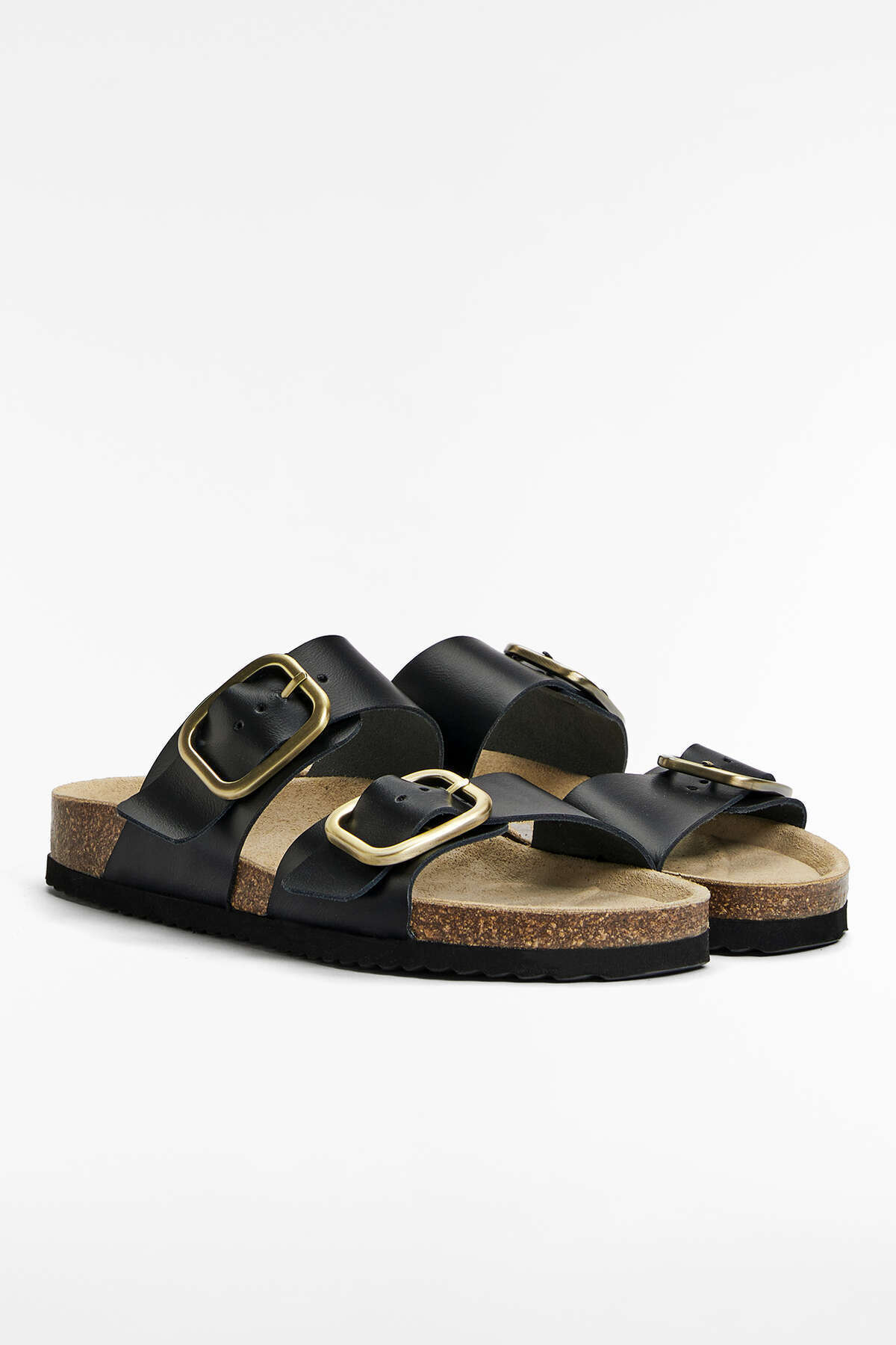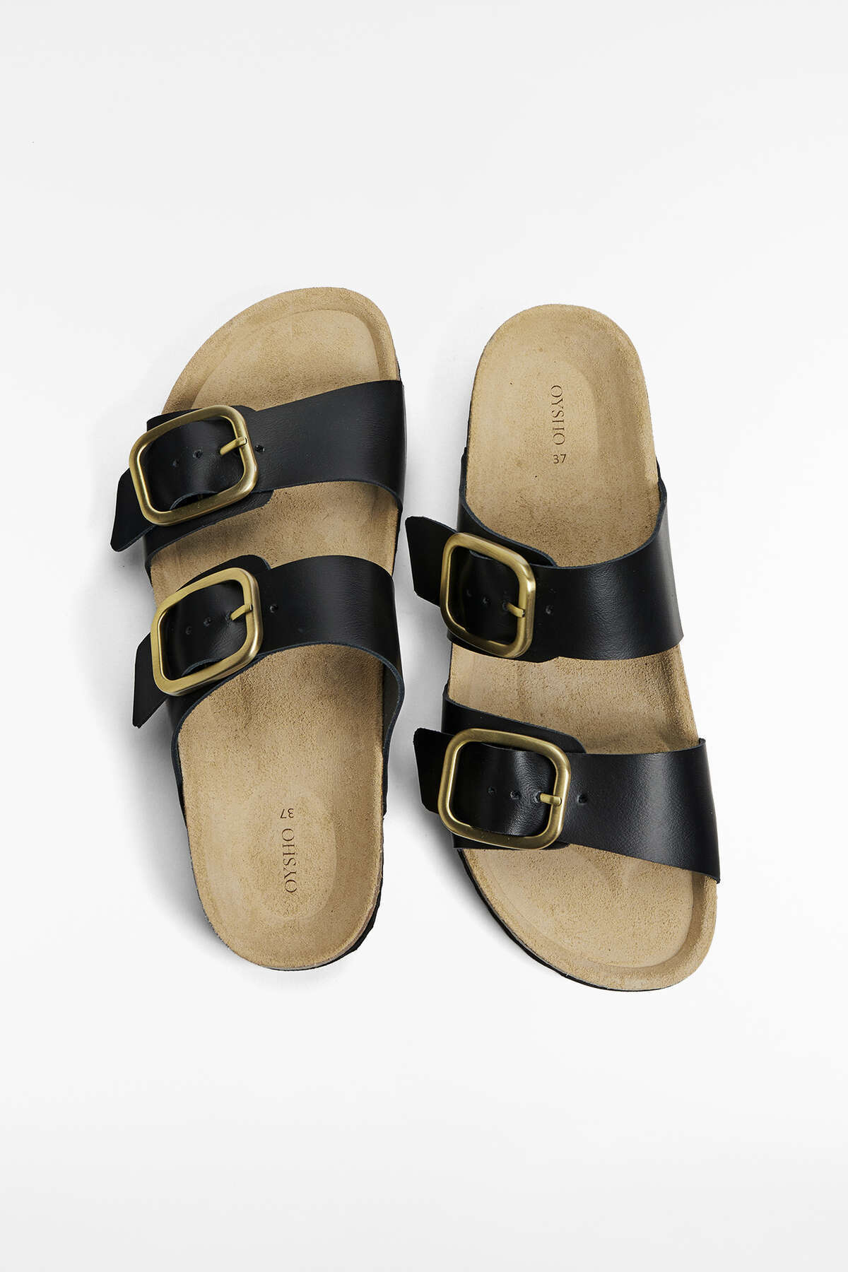 استمتعي بالراحة والأناقة في آنٍ واحد مع هذا الشبشب الكلاسيكي من Oysho، المصمم من جلد بقر طبيعي 100% بلمسة مطفية فاخرة. يأتي بلون أسود أنيق مع تصميم مزدوج الشريط وتفاصيل توكة معدنية، بالإضافة إلى نعل مريح بارتفاع 3.5 سم يوفّر دعماً مثالياً للمشي اليومي.