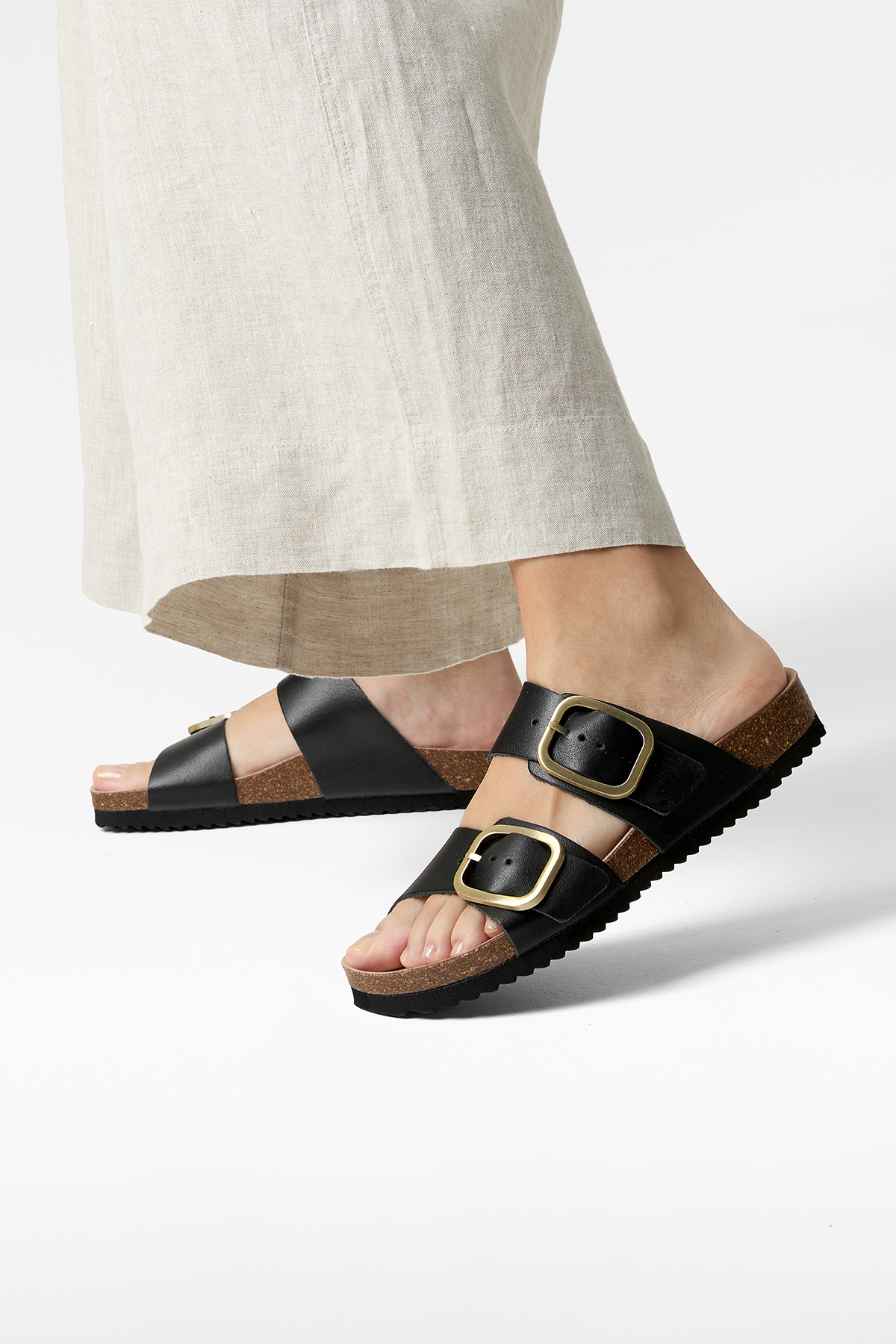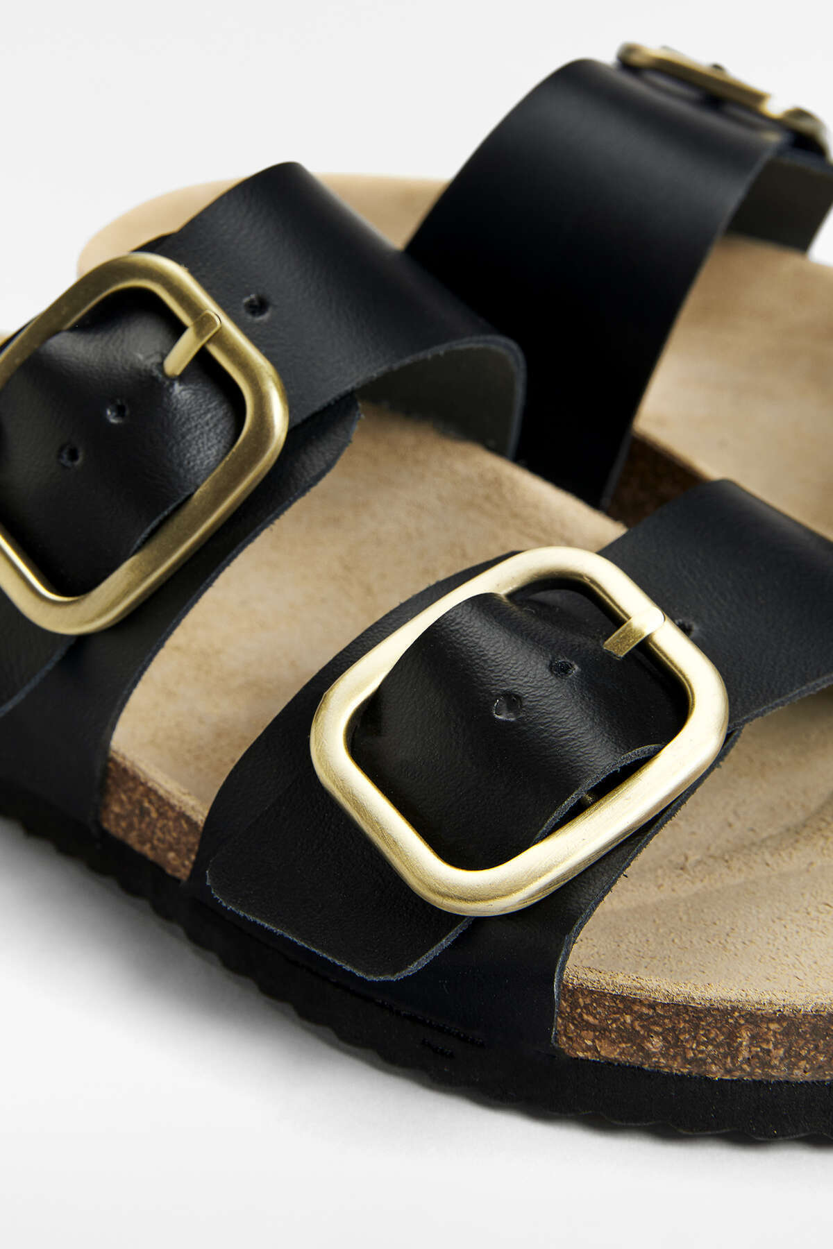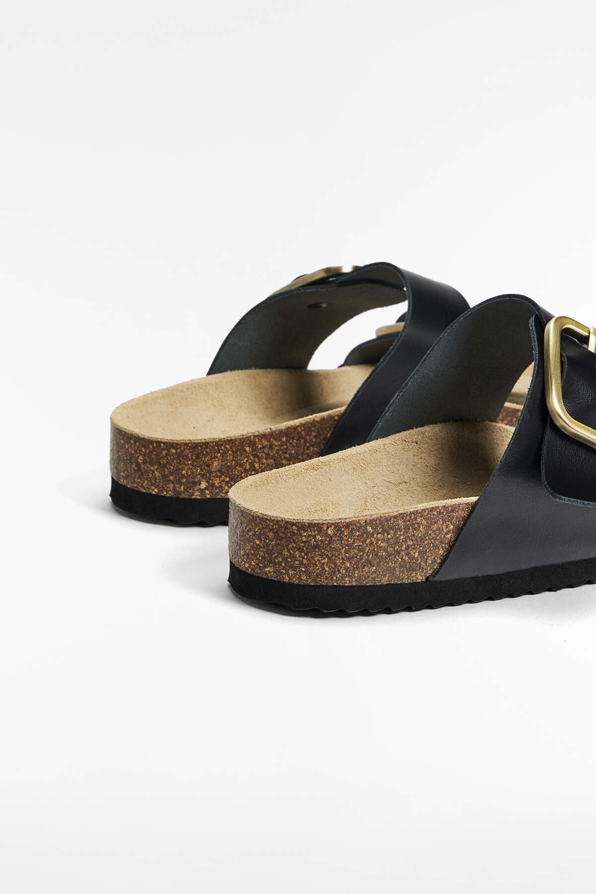 Oysho – شبشب نسائي بتصميم جلد طبيعي وتفاصيل توكة مزدوجة بلون أسود