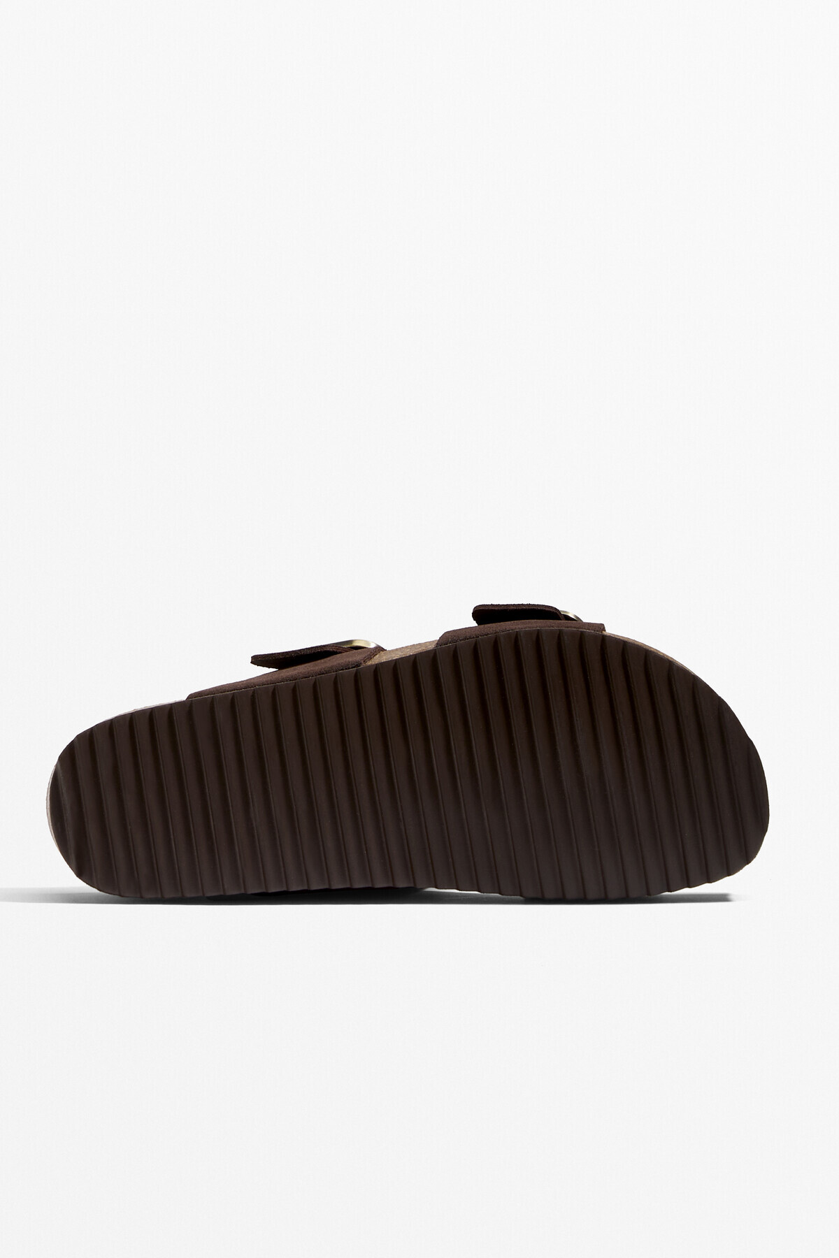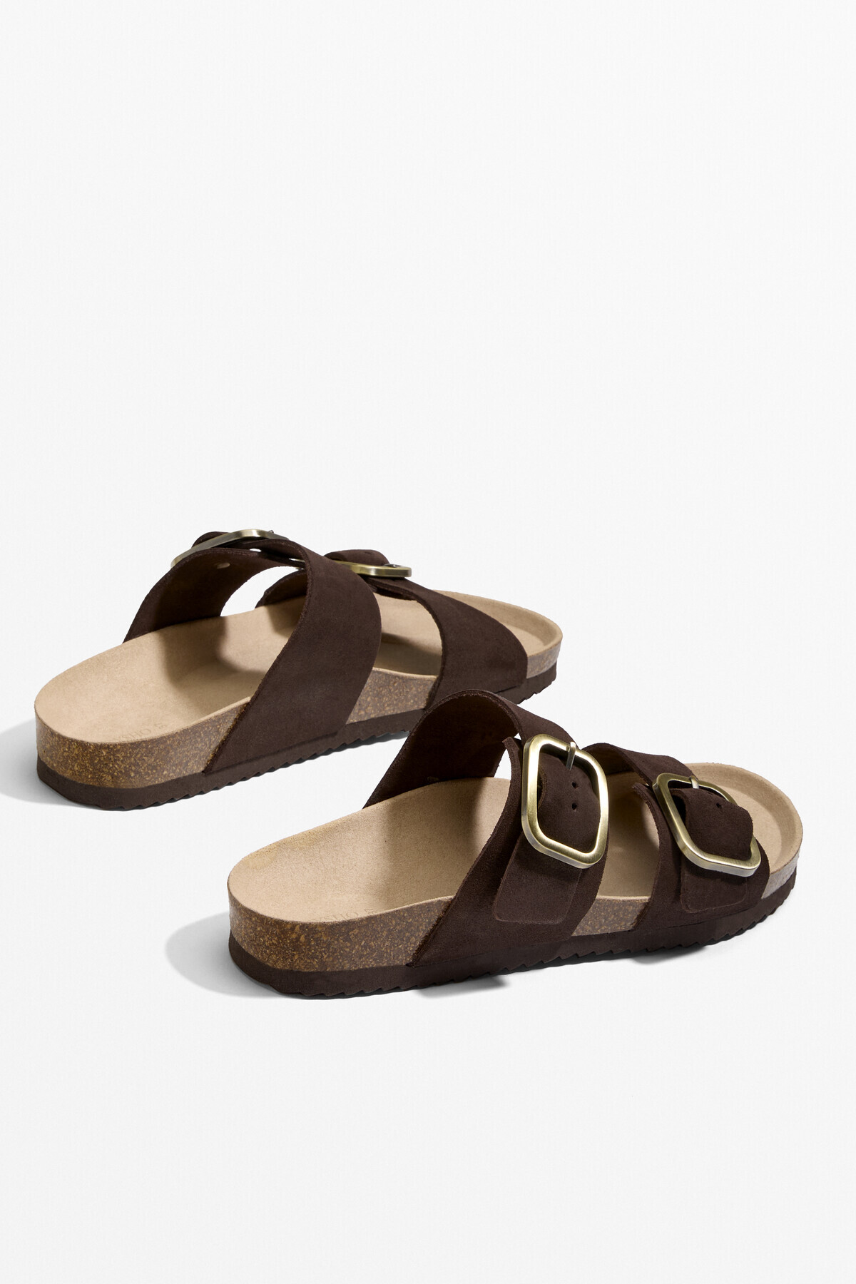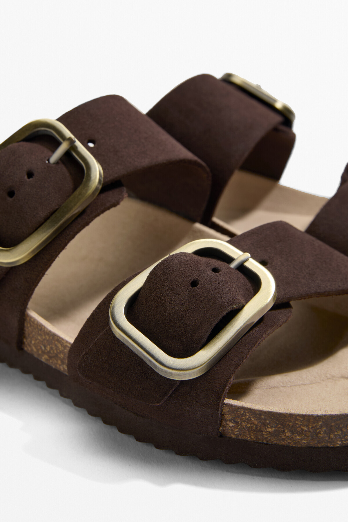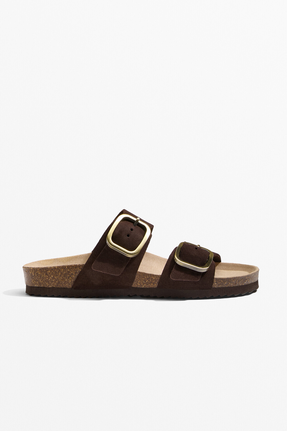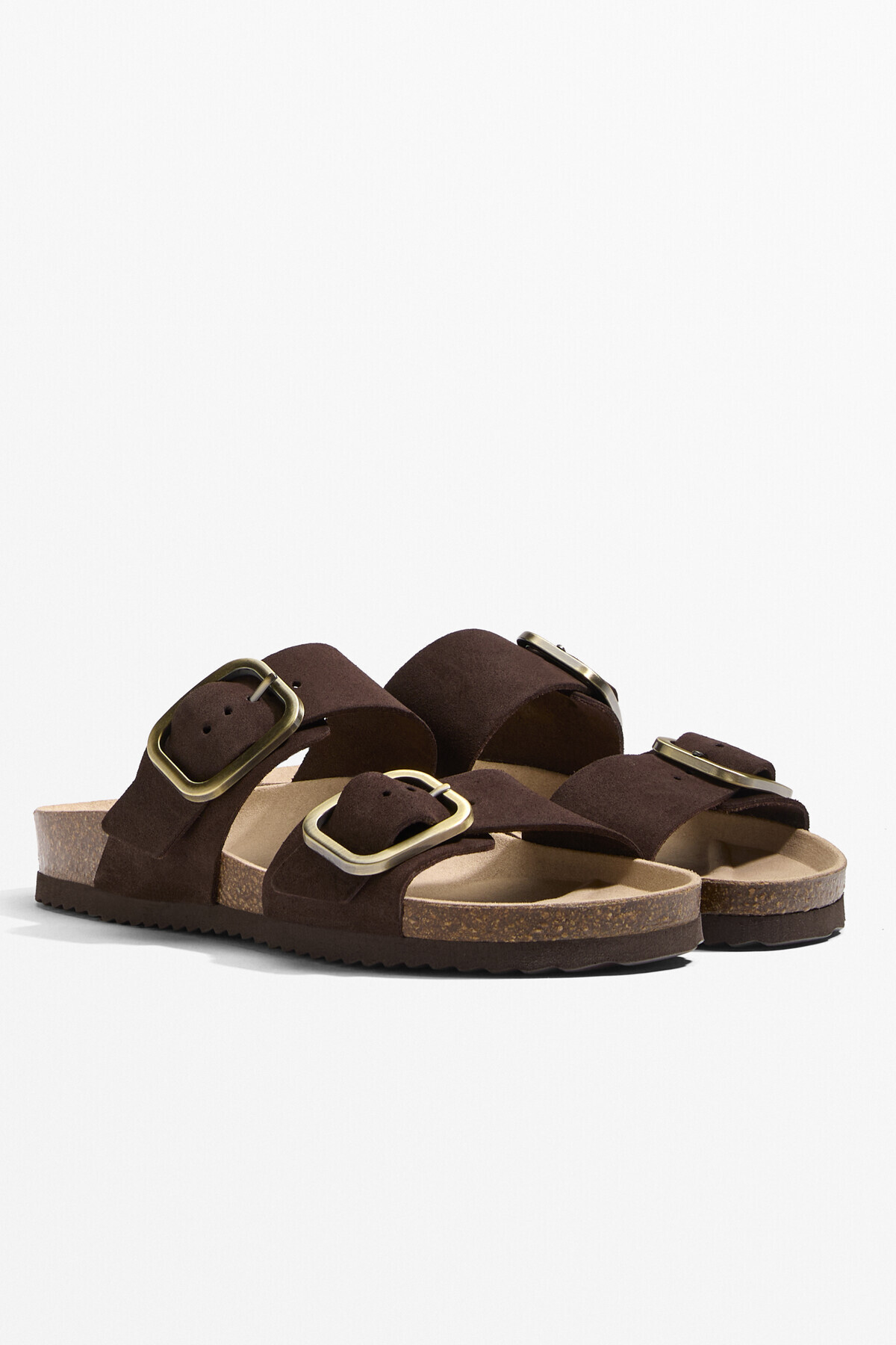 استمتعي بالراحة والأناقة في إطلالاتك الصيفية مع هذا الشبشب الفاخر من Oysho، المصمم من جلد بقر طبيعي 100% بملمس سويدي ناعم. يأتي بلون بني دافئ مع تصميم مزدوج الشريط وتفاصيل توكة معدنية، بالإضافة إلى نعل مريح بارتفاع 2.5 سم يدعم القدم أثناء المشي.