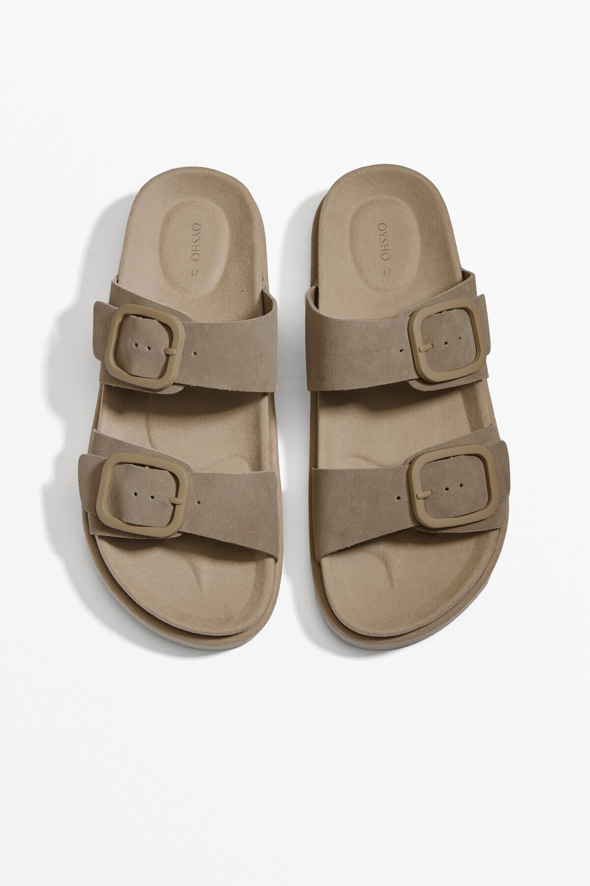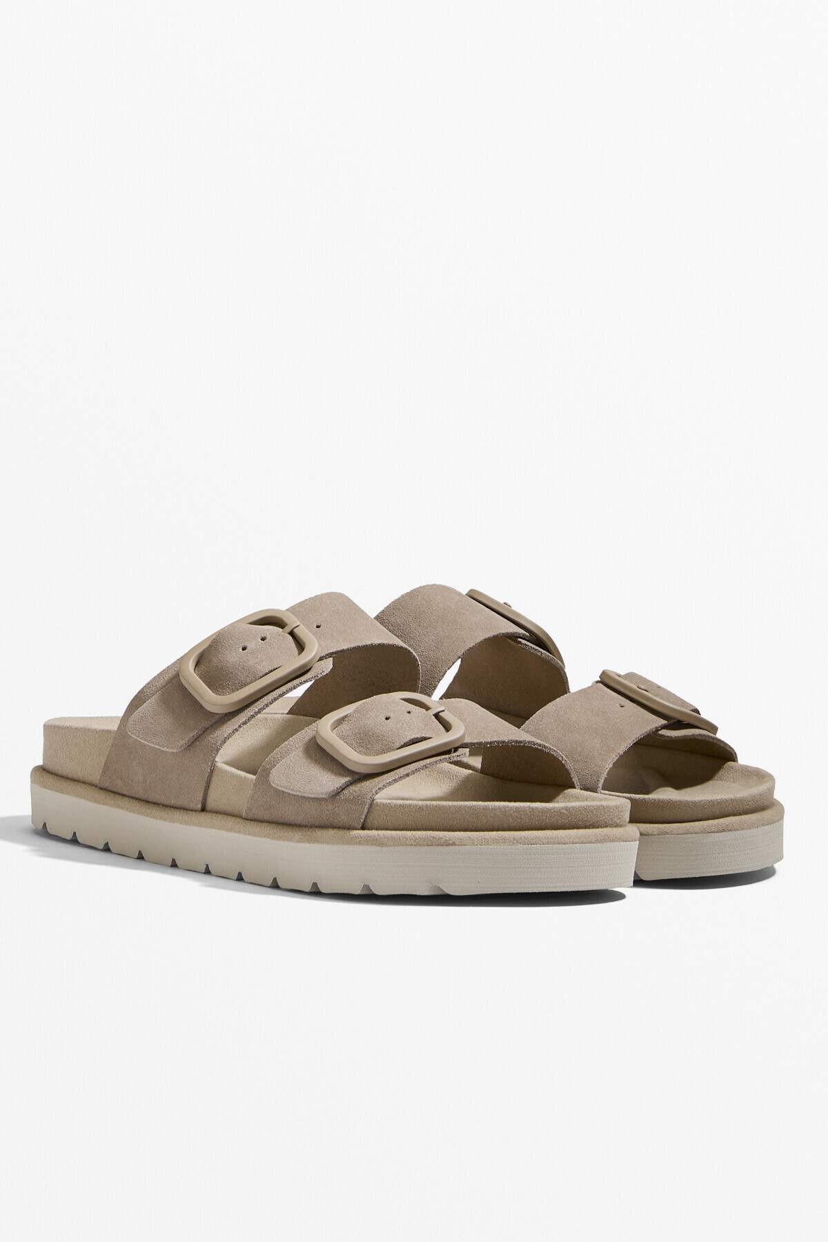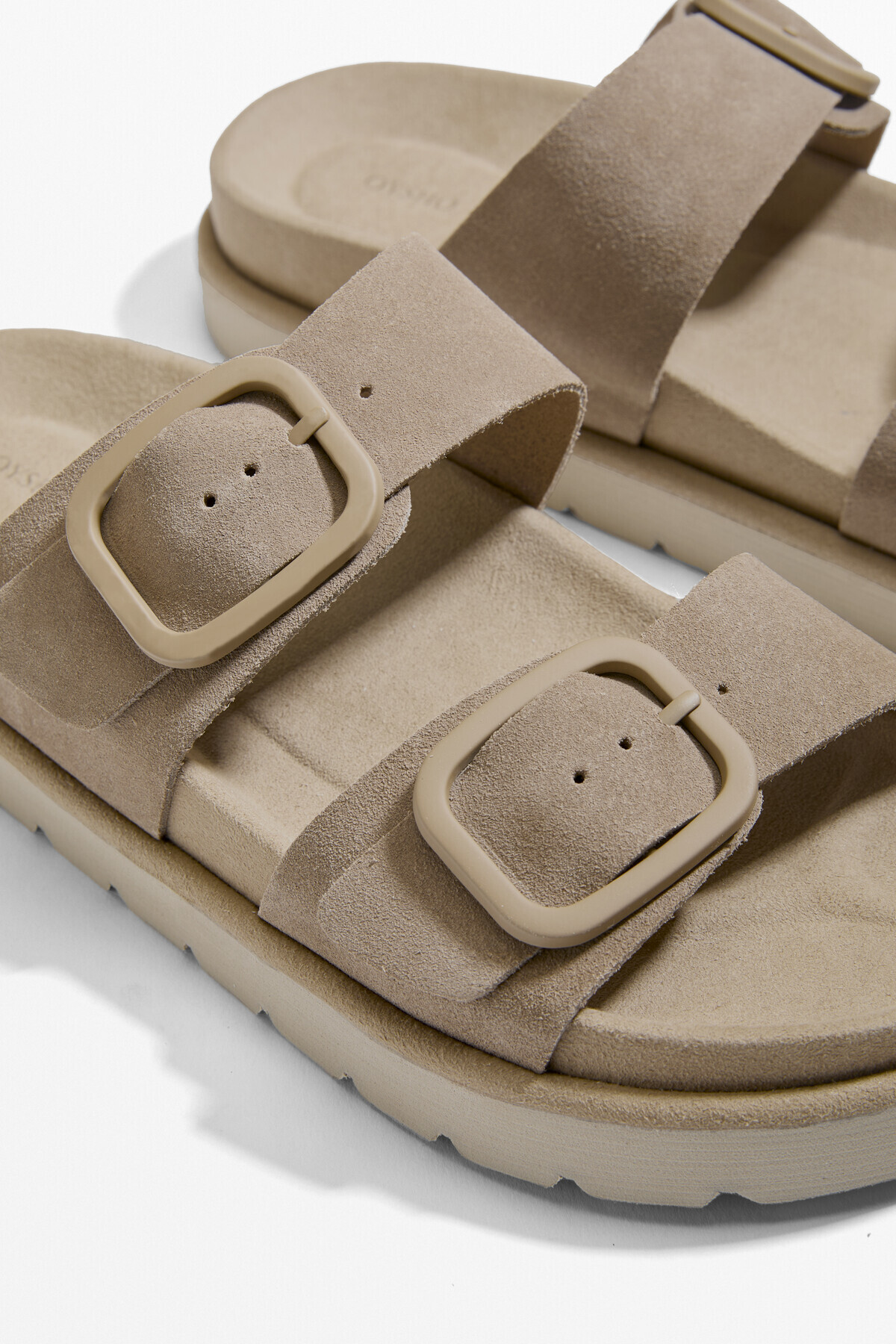 Oysho – صندل نسائي بتصميم توكة مزدوجة من الجلد السويدي الطبيعي مع قاعدة بلاتفورم بلون إكرو