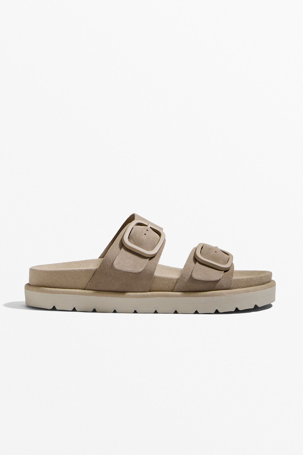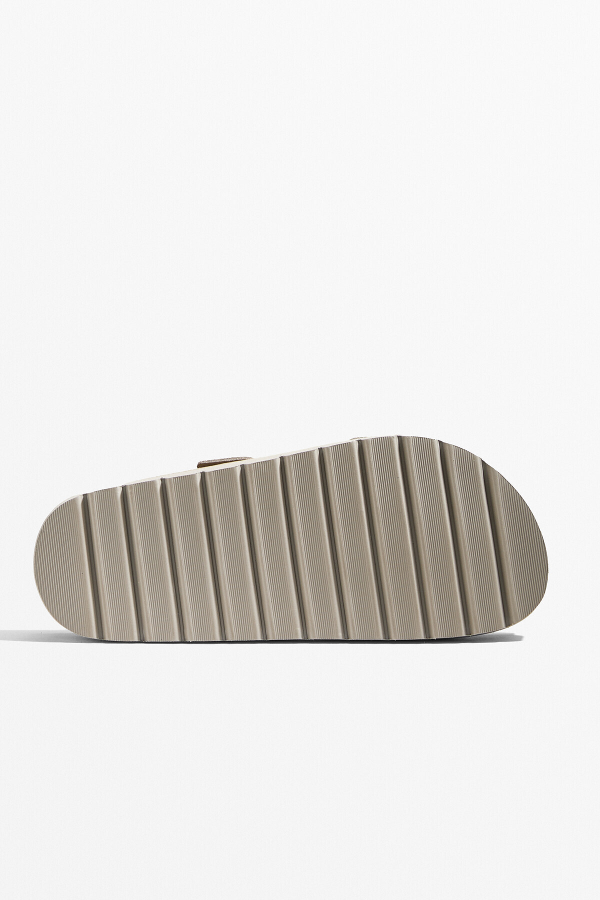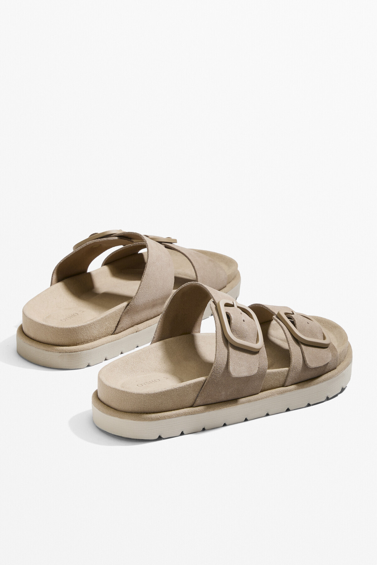 Oysho – صندل نسائي بتصميم توكة مزدوجة من الجلد السويدي الطبيعي مع قاعدة بلاتفورم بلون إكرو