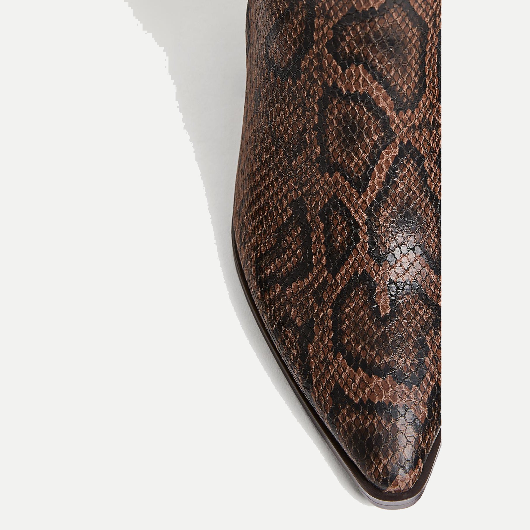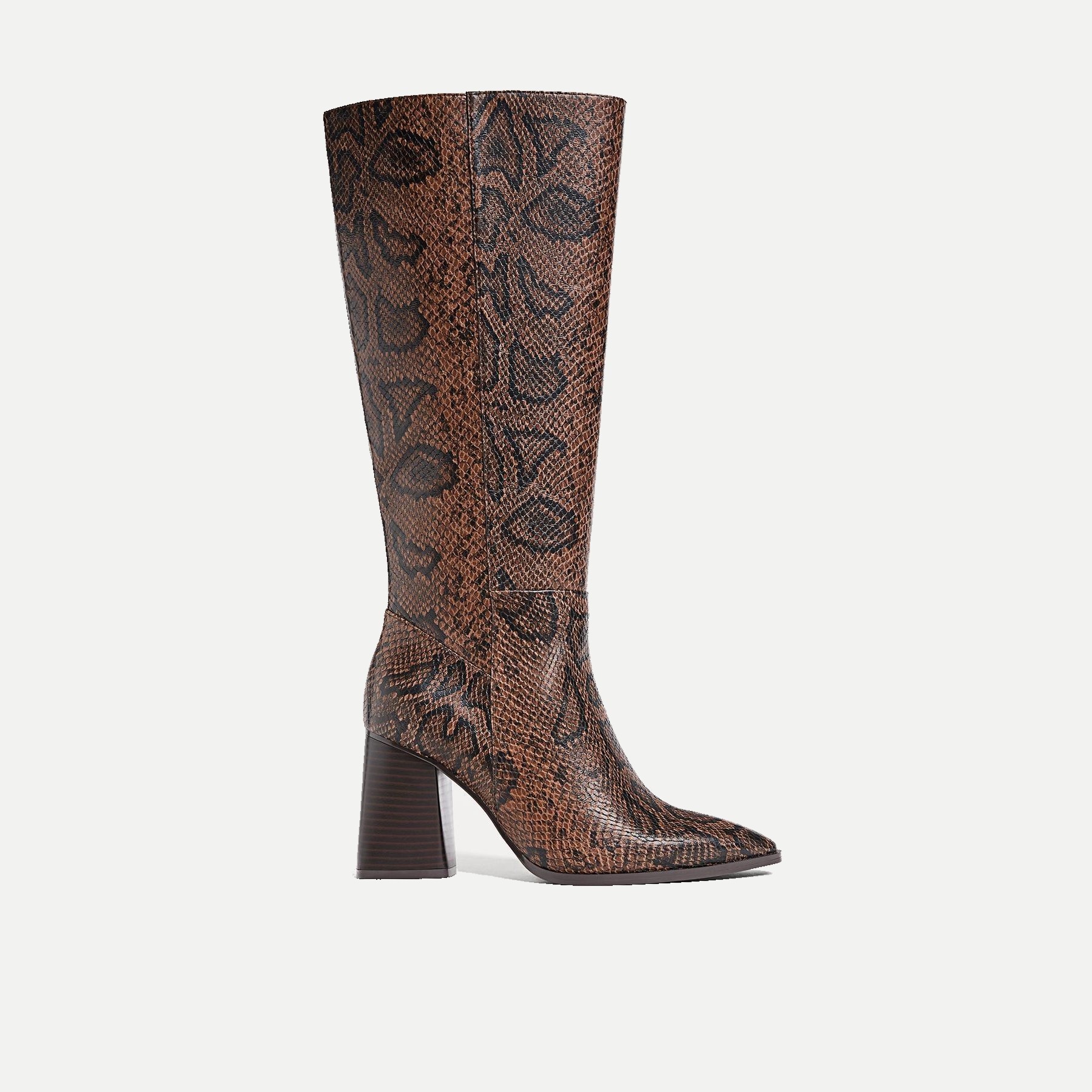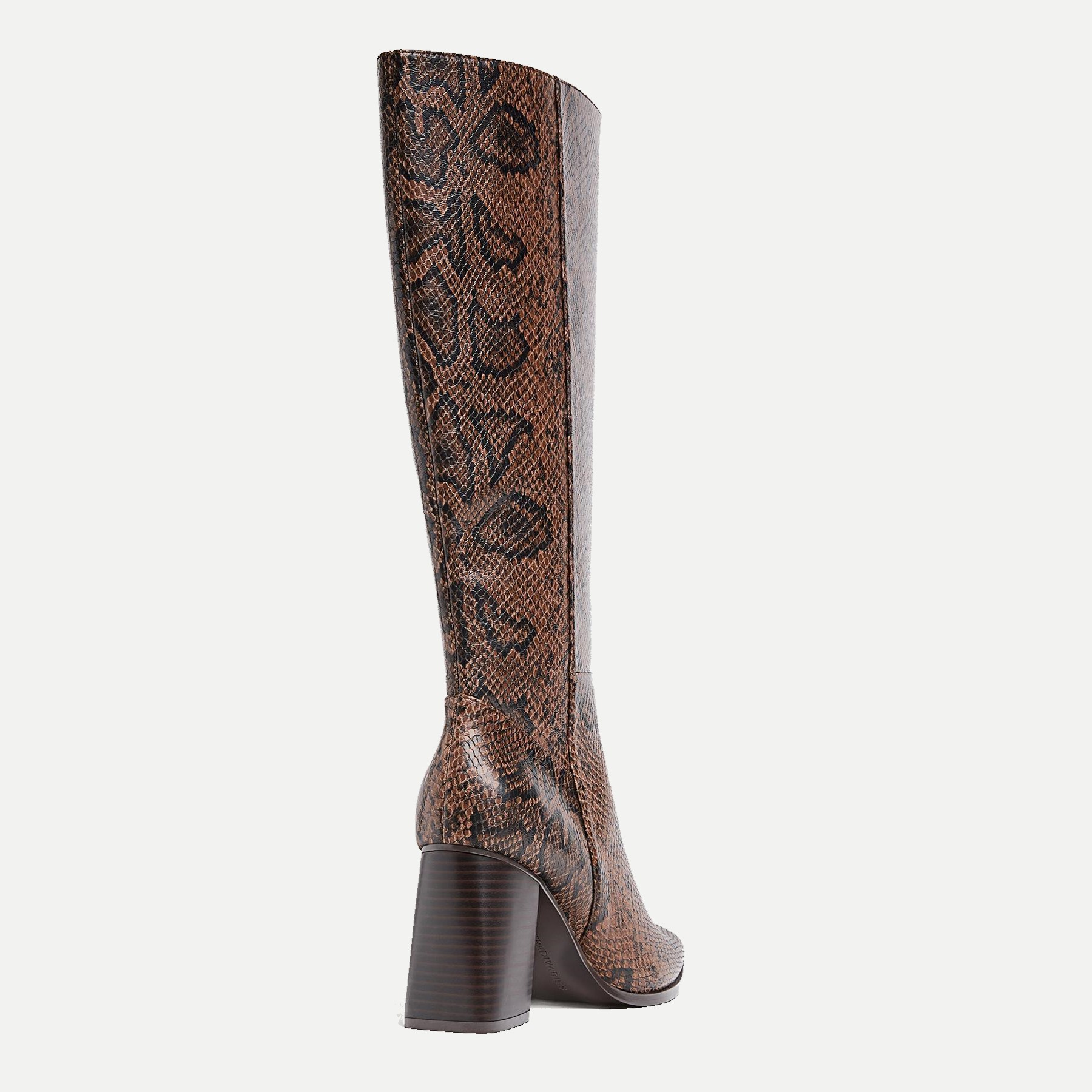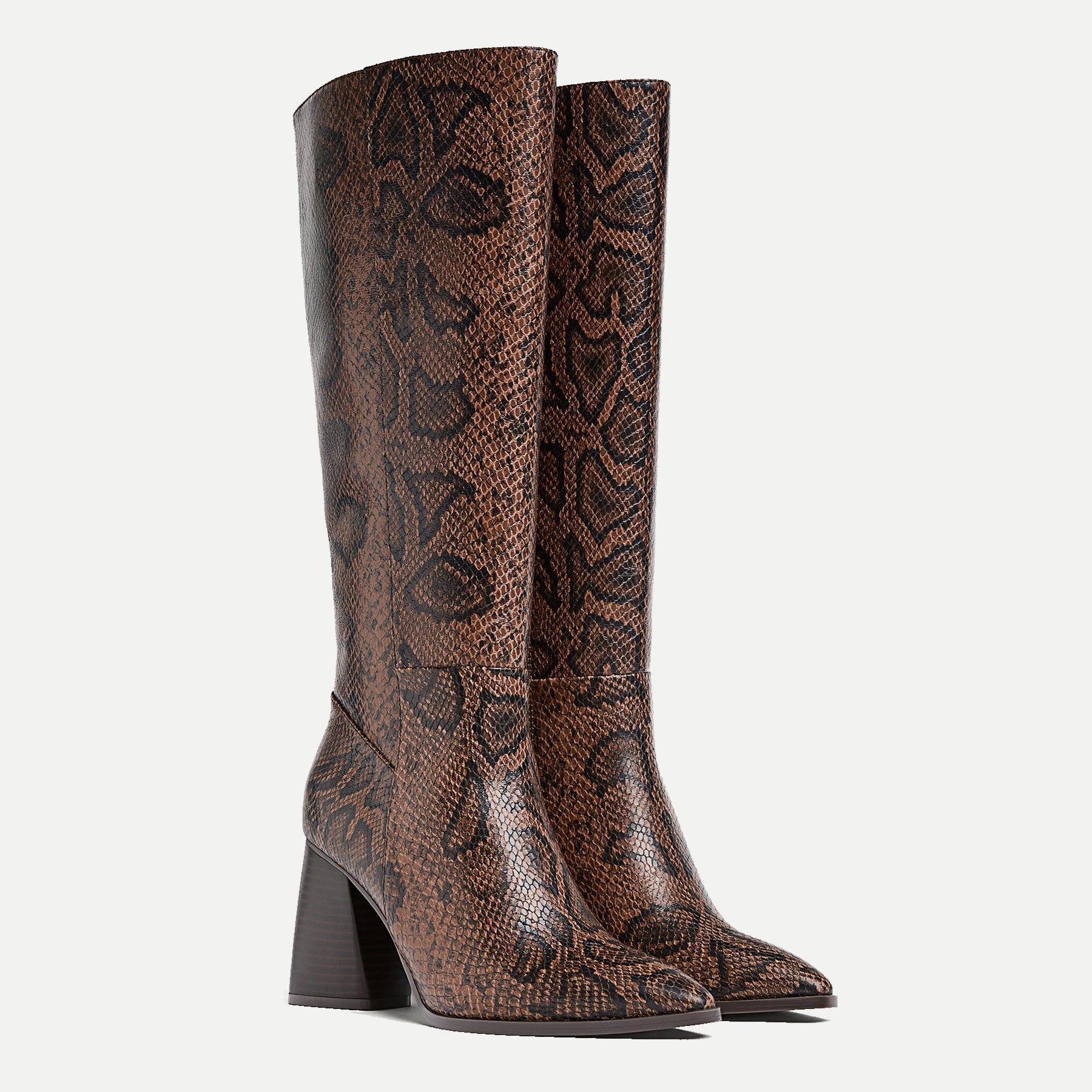 Stradivarius – بوت نسائي طويل بنقشة فاخرة وكعب رفيع بلون بني Rugan