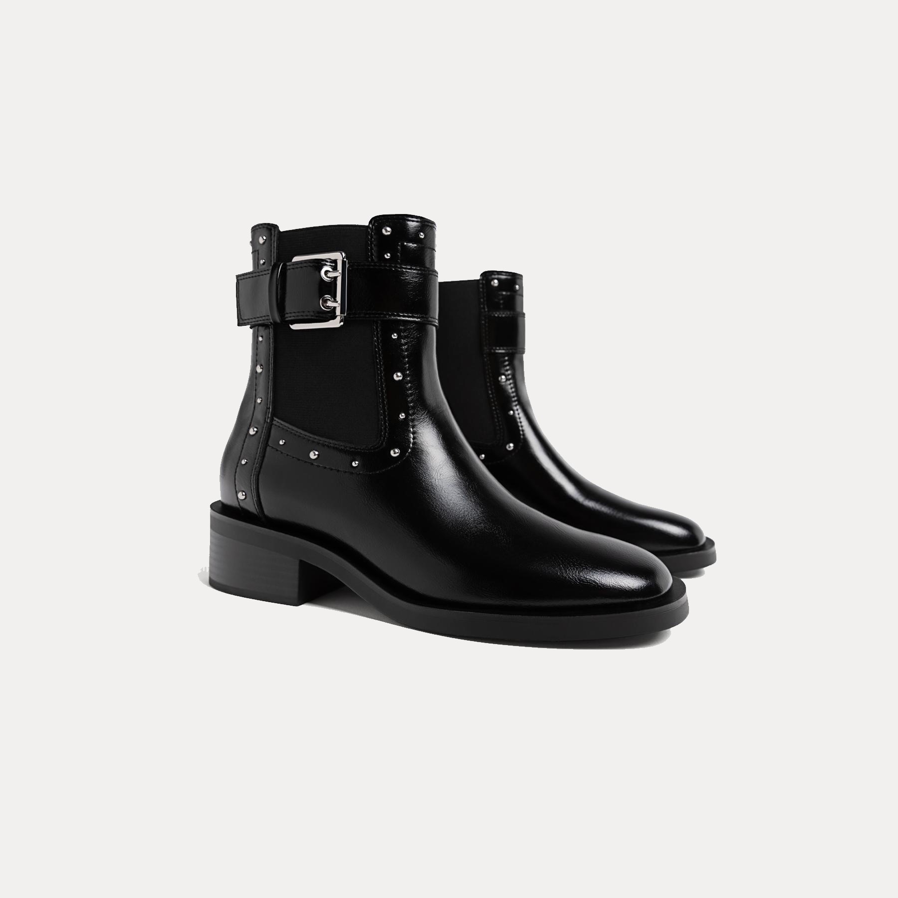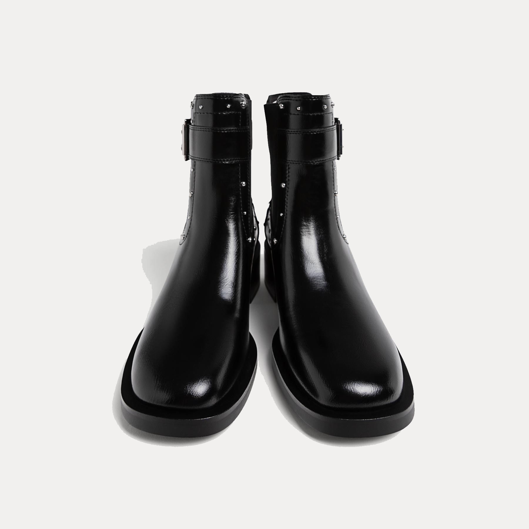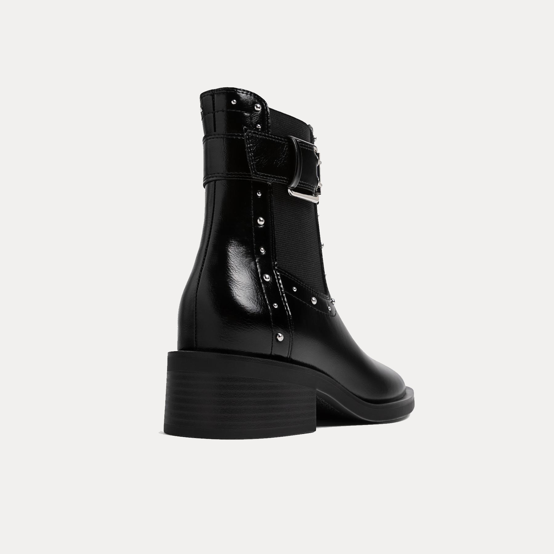 تميّزي بإطلالة قوية وعصرية مع هذا البوت الأنيق من Stradivarius، المصمم بزِمب عصرية وتفاصيل معدنية تضيف لمسة جريئة. يأتي بلون أسود كلاسيكي مع كعب متوسط بارتفاع 4.5 سم، وخامة متينة مناسبة للاستخدام اليومي في الأجواء الباردة.