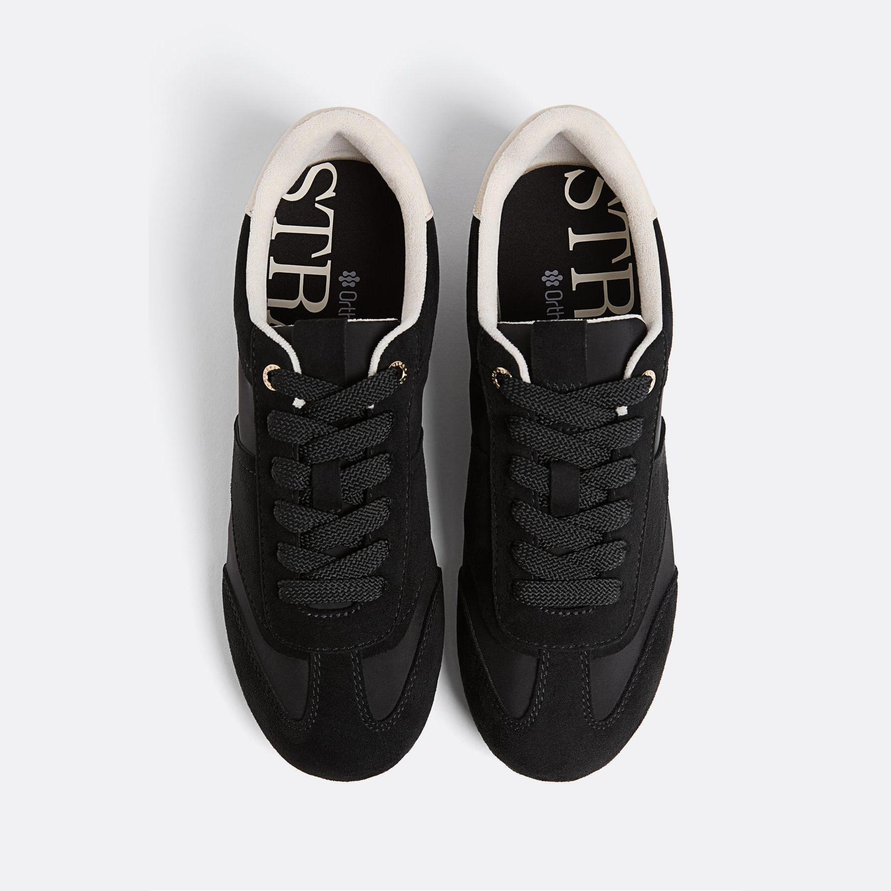 ارتقي بإطلالتك اليومية مع هذا الحذاء الرياضي من Stradivarius، المصمم بخامة ناعمة من النسيج وبتقنية Ortholite® التي توفر راحة فائقة وتهوية مثالية. يأتي بلون أسود أنيق مع رباط أمامي ونعل مسطح بارتفاع 2 سم، ليمنحك دعماً مثالياً في كل خطوة.