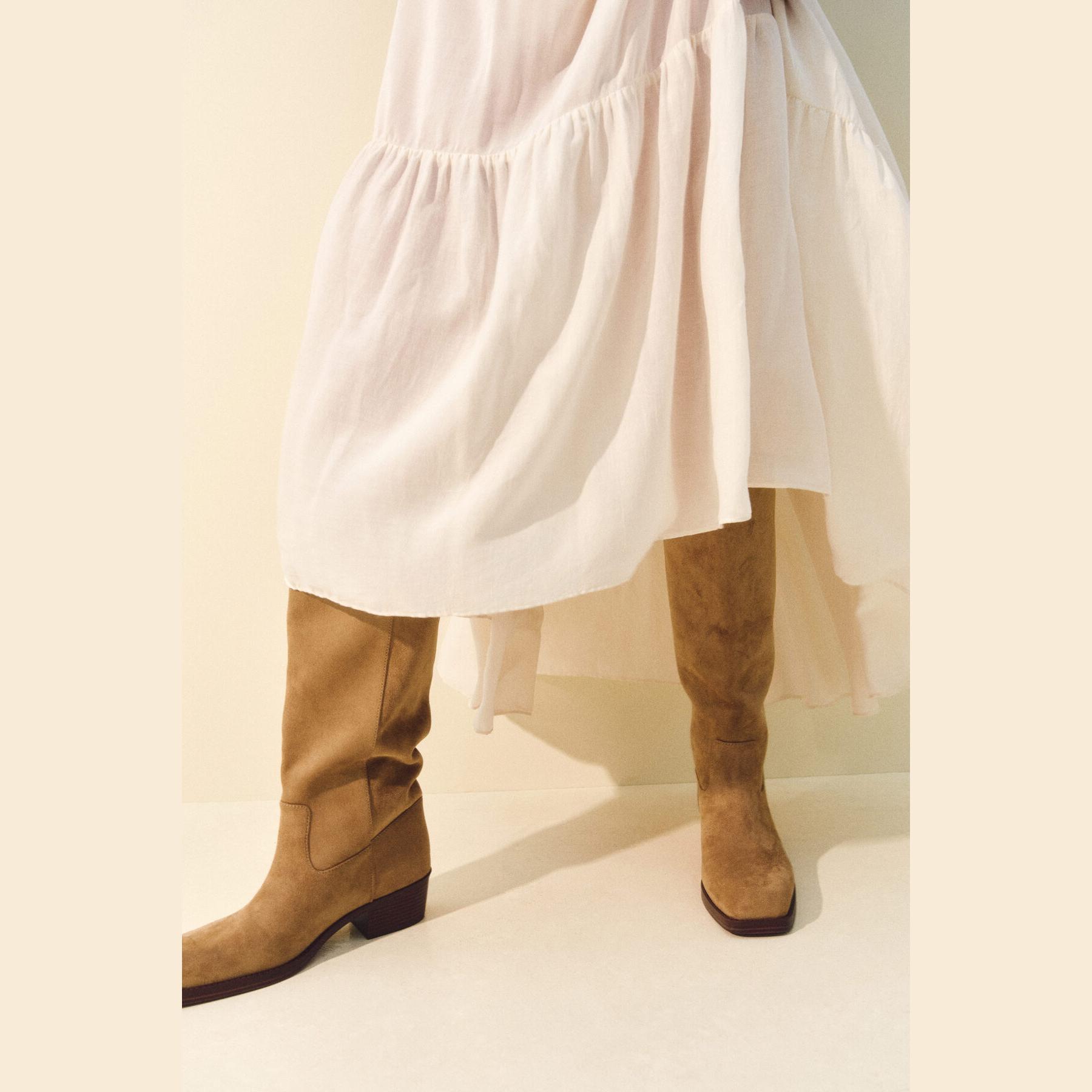 تميّزي بإطلالة قوية وعصرية مع هذه الجزمة من H&M، المصممة من جلد صناعي بلون كاكي جذاب. تصميمها الطويل حتى الركبة بأسلوب موتوسيكل يمنحك مظهراً جريئاً، مع خامة متينة ومريحة تناسب الأجواء الباردة والمشاوير اليومية.