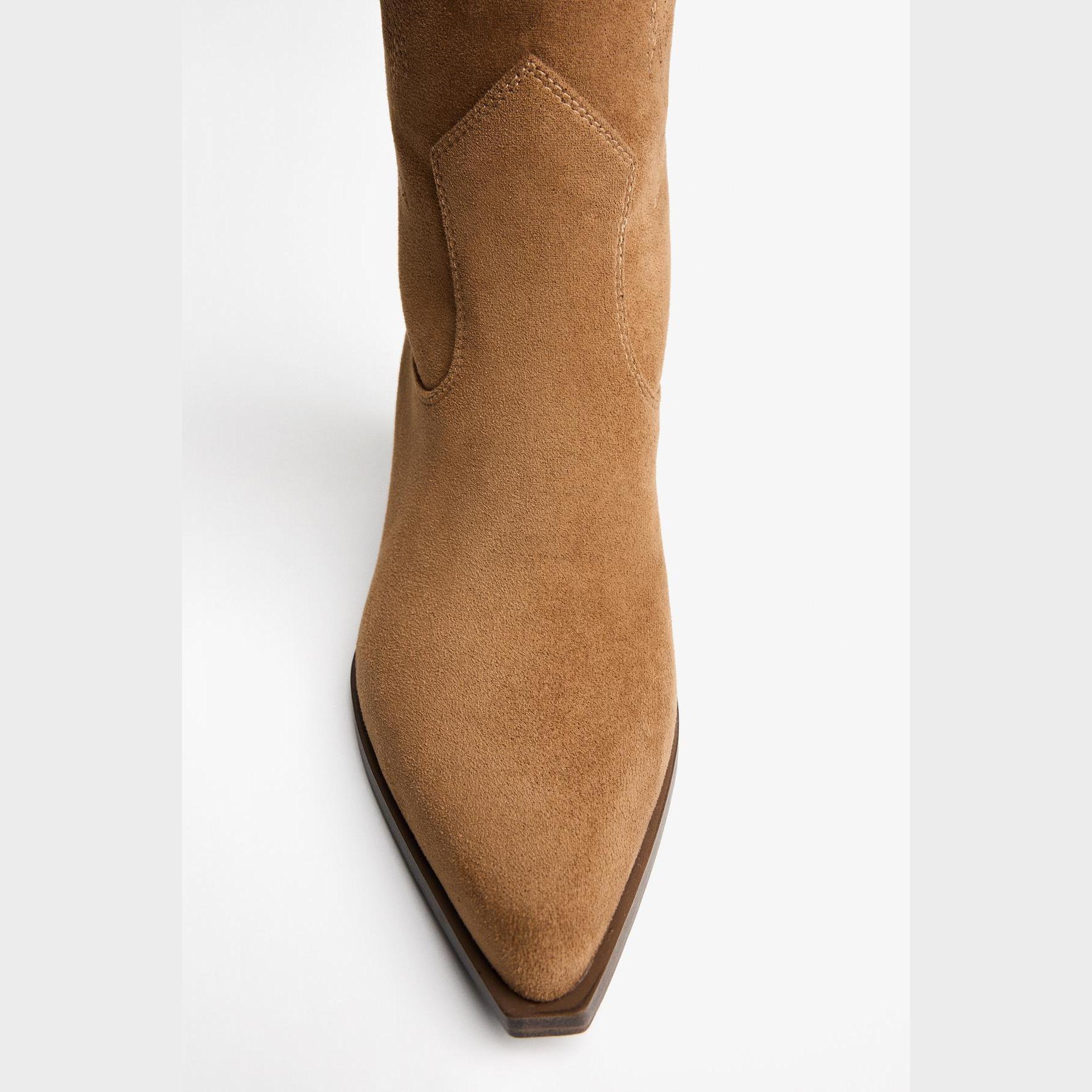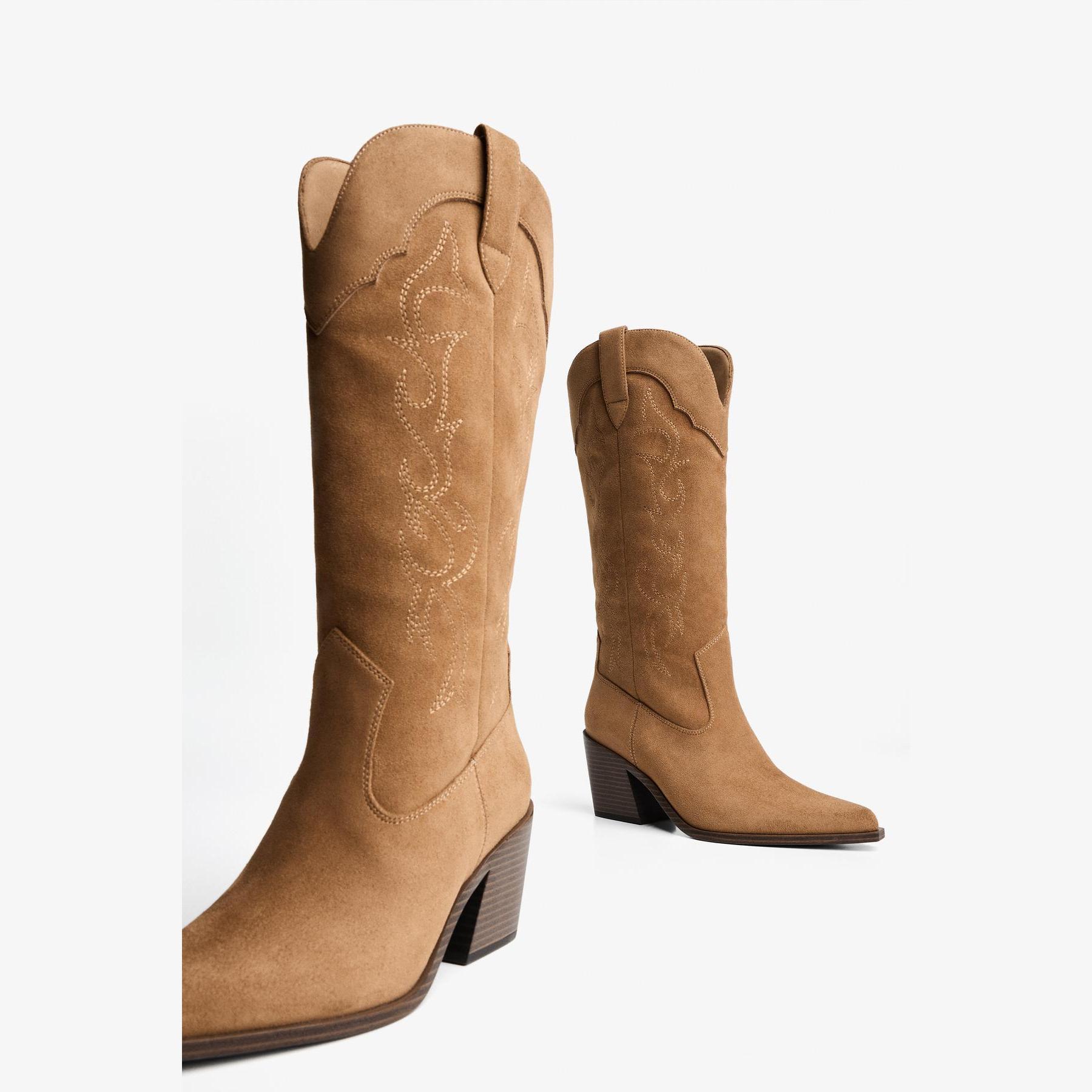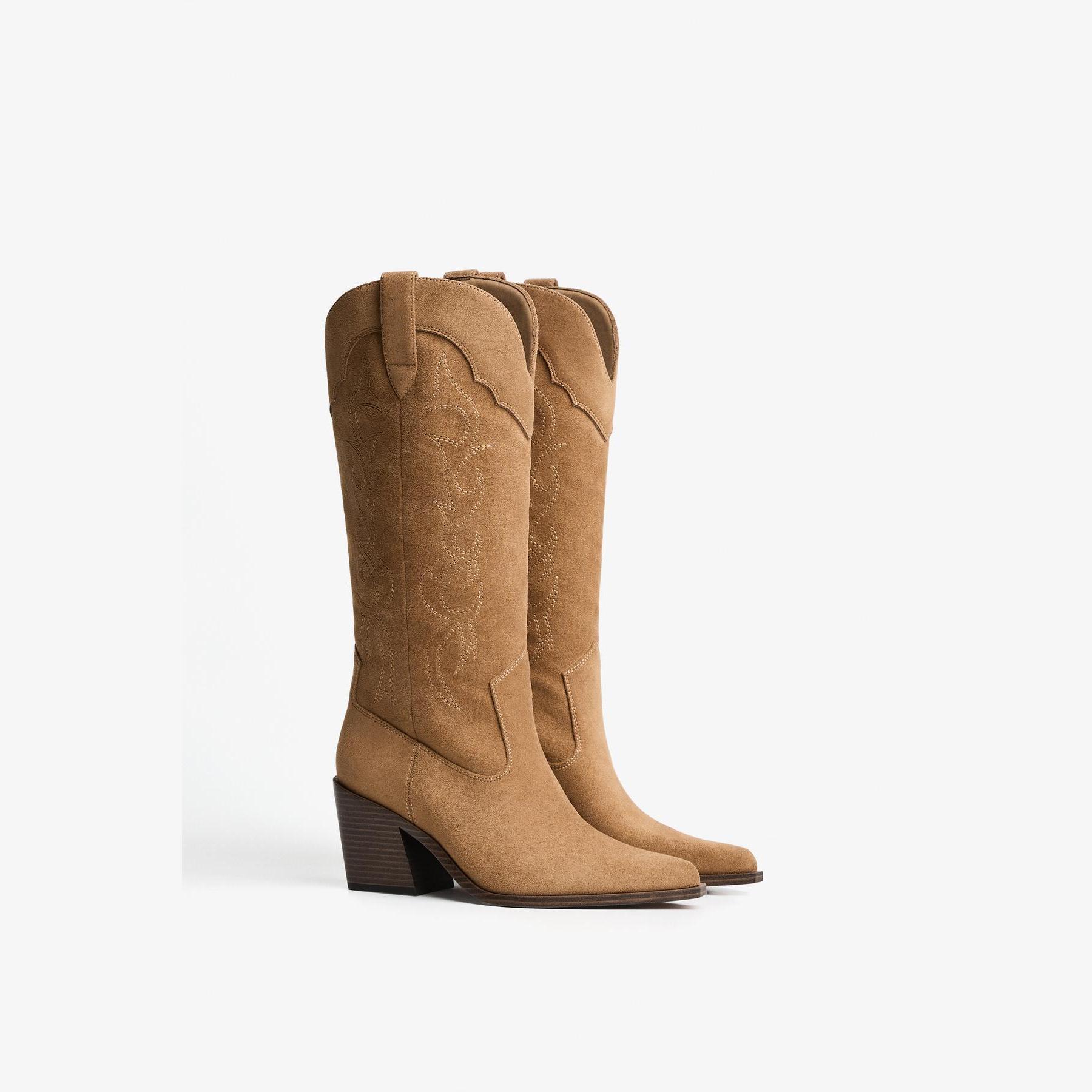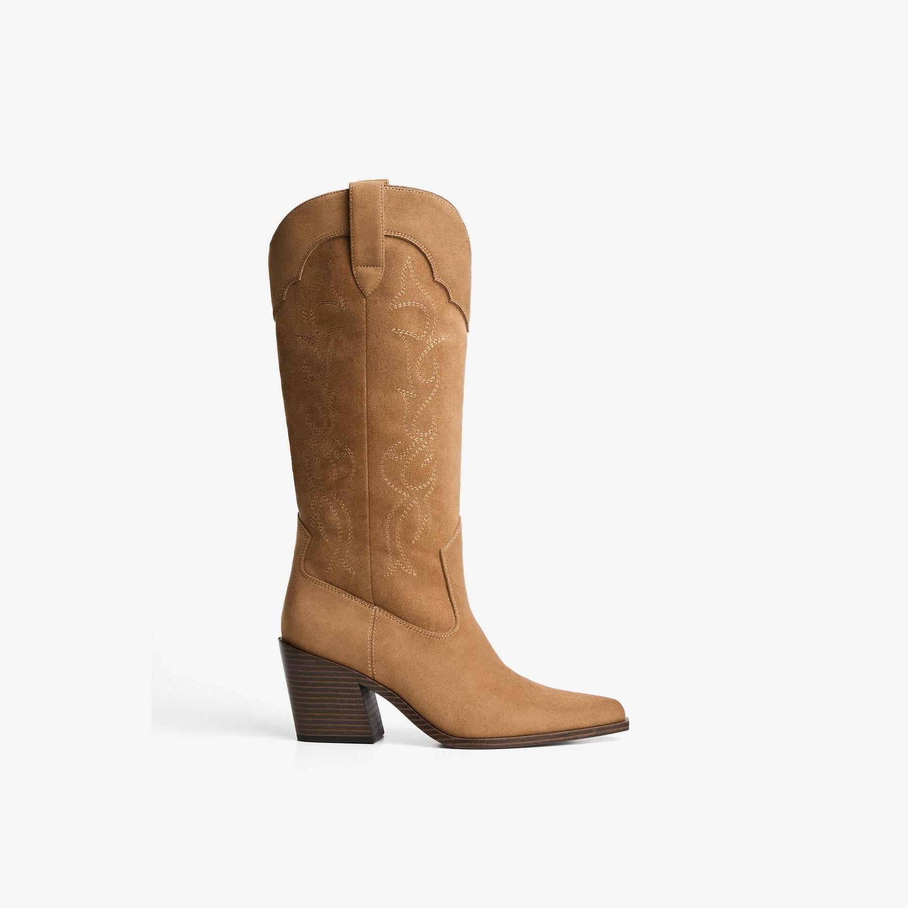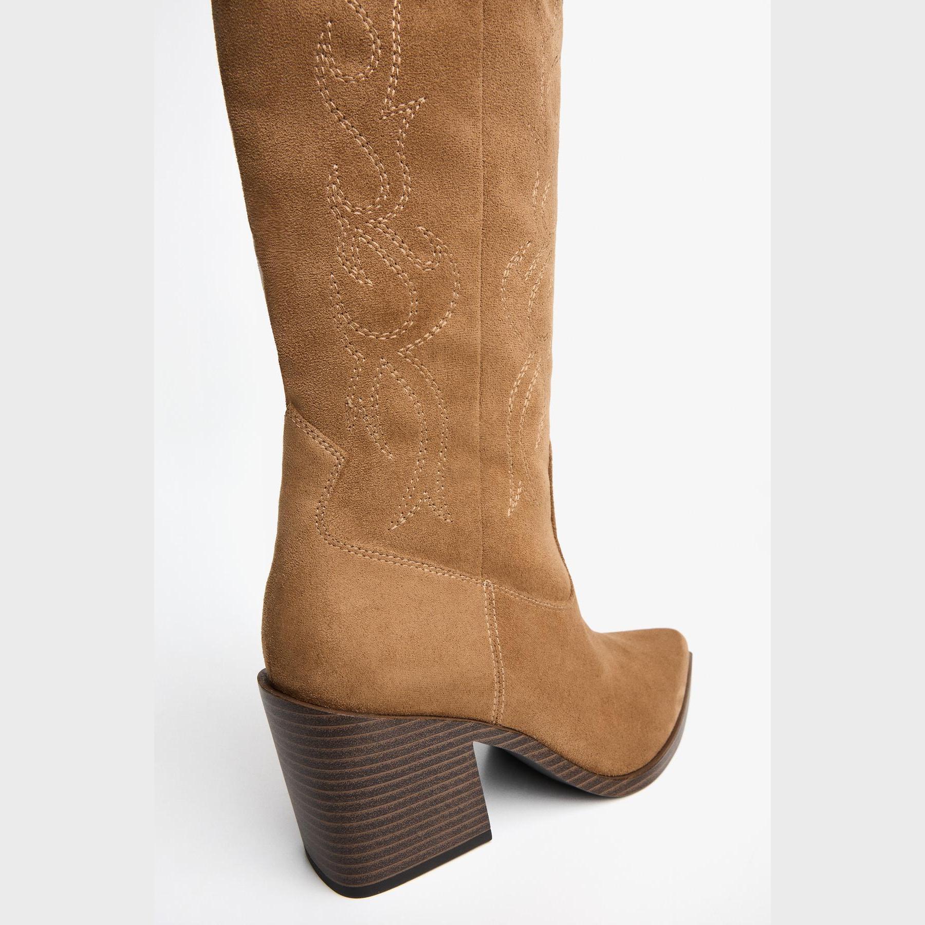 Bershka – بوت نسائي بدون أربطة من خامة منسوجة بلون بني بتصميم كاوبوي مزخرف بكعب متوسط ونعل مريح AIRFIT®